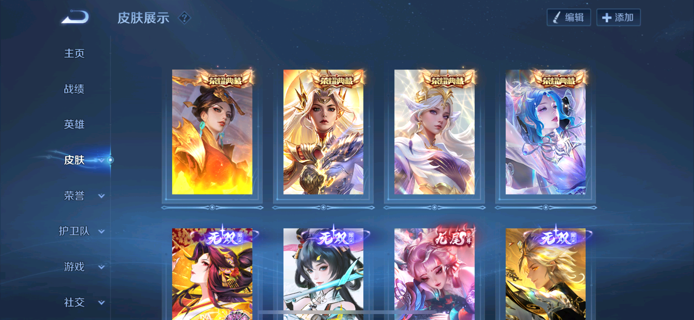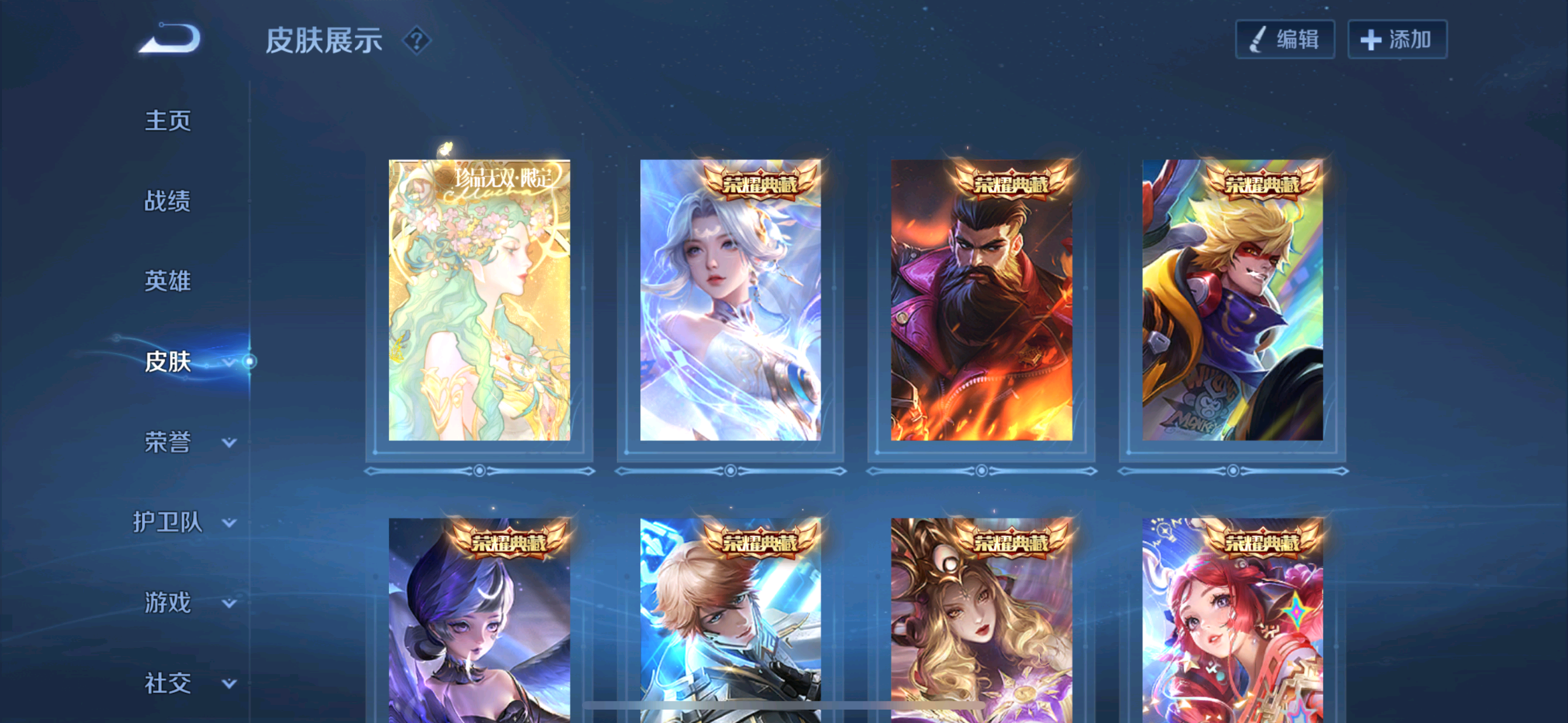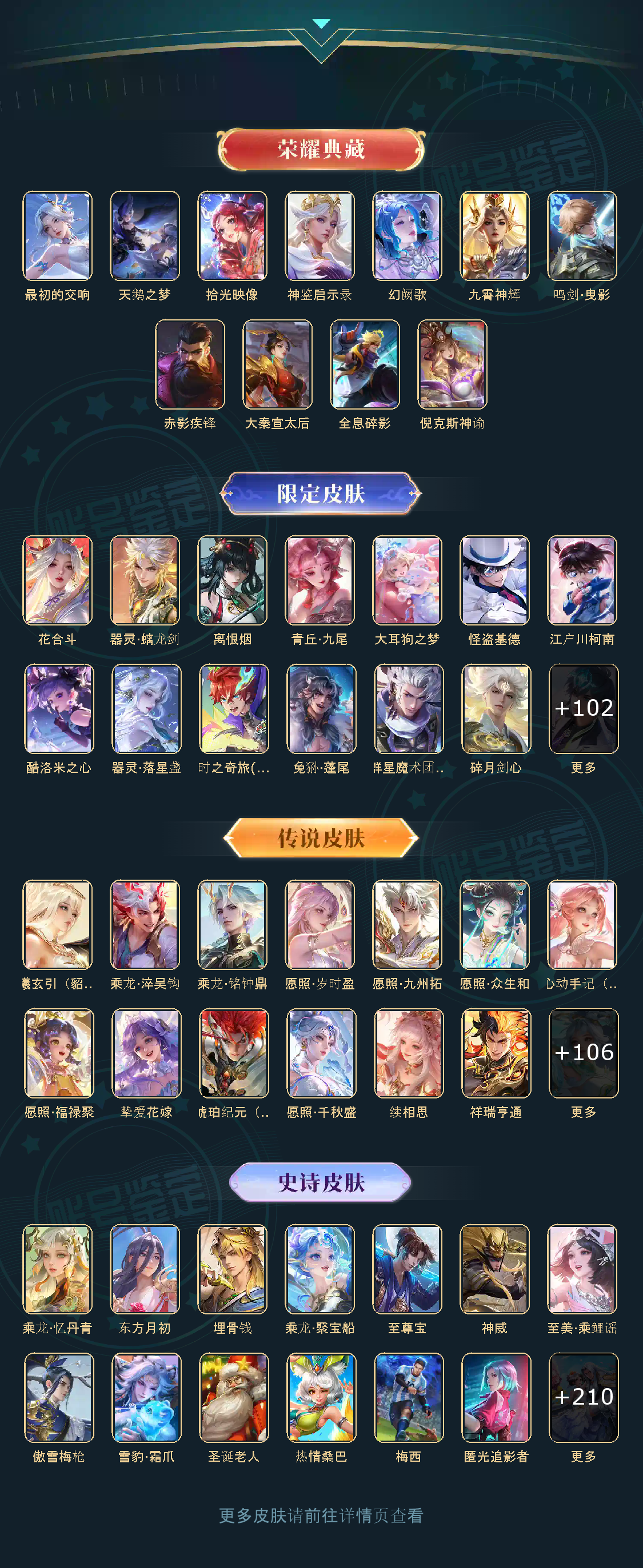 贵族等级V10无双贵族,英雄数量126,典藏皮肤数11,皮肤数量672,纯白花嫁/天魔缭乱/至尊宝/真爱至上/圣诞老人/热情桑巴/梅西/青龙志/白虎志/朱雀志/久胜战神/飞衡/器灵·螭龙剑/愿照·九州拓/愿照·众生和/匿光追影者/冥王哈迪斯/鸣剑·曳影/群星魔术团(上官婉儿)/乘龙·问璇玑/群星魔术团(韩信)/神鉴启示录/心动手记(朵莉亚)/时之奇旅(大乔)/赤影疾锋/落雪白狼/愿照·福禄聚/无双飞将/时之祈愿瑶/遇见神鼓/李逍遥/群星魔术团(云中君)/花合斗/涂山红红/霜北刀/逐花归海/器灵·落星盏/琥珀纪元(马超)/武圣/幻阙歌/至美·乘鲤谣/琥珀纪元(伽罗)/鹤羽星尊/时之奇旅(孙策)/曦玄引(貂蝉)/离恨烟/碎月剑心/愿照·千秋盛/霜月吟/雪境奇遇(甄姬)/乘龙·淬吴钩/东方月初/拾光映像/乘龙·铭钟鼎/妄想实况/大耳狗之梦/埋骨钱/深海之息/最初的交响/黄金天蝎座/夜礼服假面/兔狲·蓬尾/玉兔公主/补天/怪盗基德/愿照·岁时盈/乘龙·聚宝船/续相思/异界灵契/神威/炽阳神光/启示之音/乘龙·忆丹青/影龙天霄/心动手记(海诺)/九霄神辉/青丘·九尾/江户川柯南/云诺千山/鹤归松栖(云缨)/愿照·山河定/酷洛米之心/傲雪梅枪/雪豹·霜爪/馥梦繁花/时雨天司/纯白花嫁/天魔缭乱/至尊宝/真爱至上/圣诞老人/热情桑巴/梅西/青龙志/白虎志/朱雀志/久胜战神/飞衡/器灵·螭龙剑/愿照·九州拓/愿照·众生和/匿光追影者/冥王哈迪斯/鸣剑·曳影/群星魔术团(上官婉儿)/乘龙·问璇玑/群星魔术团(韩信)/神鉴启示录/心动手记(朵莉亚)/时之奇旅(大乔)/赤影疾锋/落雪白狼/愿照·福禄聚/无双飞将/时之祈愿瑶/遇见神鼓/李逍遥/群星魔术团(云中君)/花合斗/涂山红红/霜北刀/逐花归海/器灵·落星盏/琥珀纪元(马超)/武圣/幻阙歌/至美·乘鲤谣/琥珀纪元(伽罗)/鹤羽星尊/时之奇旅(孙策)/曦玄引(貂蝉)/离恨烟/碎月剑心/愿照·千秋盛/霜月吟/雪境奇遇(甄姬)/乘龙·淬吴钩/东方月初/拾光映像/乘龙·铭钟鼎/妄想实况/大耳狗之梦/埋骨钱/深海之息/最初的交响/黄金天蝎座/夜礼服假面/兔狲·蓬尾/玉兔公主/补天/怪盗基德/愿照·岁时盈/乘龙·聚宝船/续相思/异界灵契/神威/炽阳神光/启示之音/乘龙·忆丹青/影龙天霄/心动手记(海诺)/九霄神辉/青丘·九尾/江户川柯南/云诺千山/鹤归松栖(云缨)/愿照·山河定/酷洛米之心/傲雪梅枪/雪豹·霜爪/馥梦繁花/时雨天司