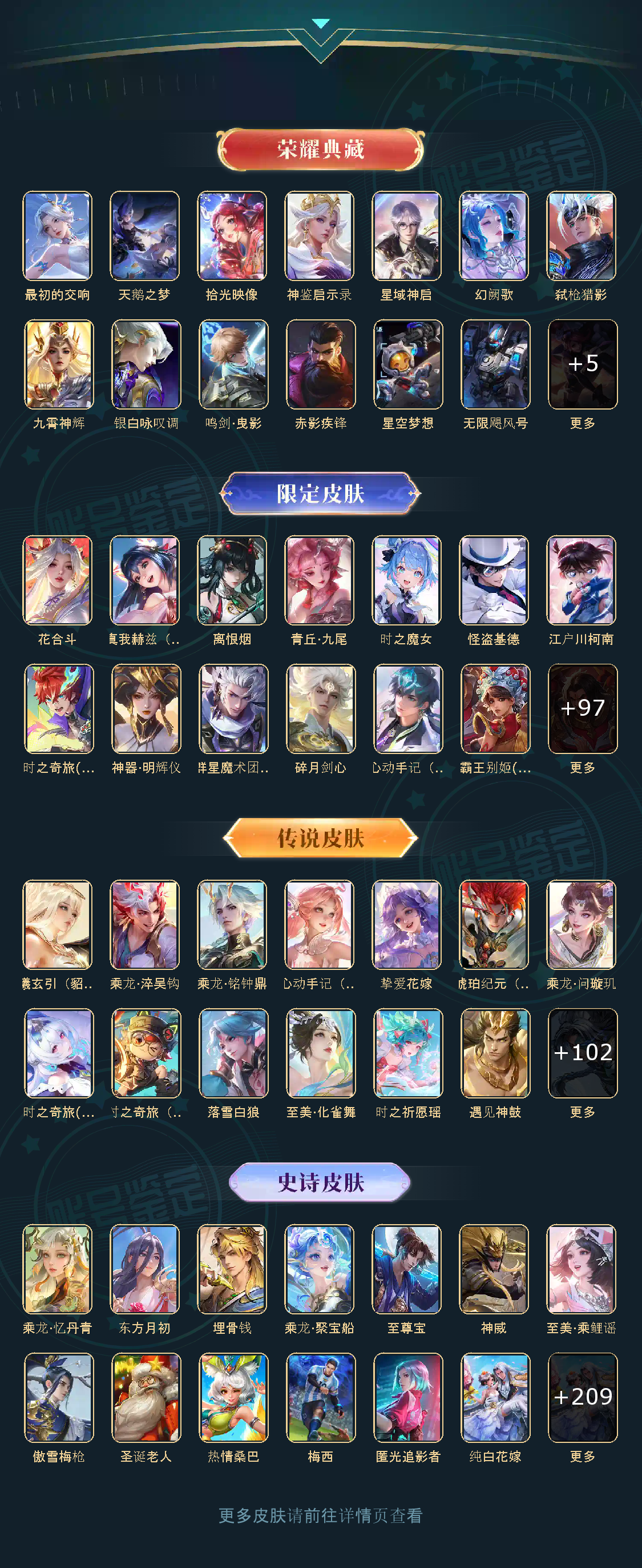 贵族等级V10,英雄数量128,典藏皮肤数18,皮肤数量671,纯白花嫁/天魔缭乱/至尊宝/真爱至上/圣诞老人/热情桑巴/梅西/白虎志/久胜战神/飞衡/匿光追影者/冥王哈迪斯/神器·明辉仪/鸣剑·曳影/乘龙·问璇玑/群星魔术团(韩信)/神鉴启示录/心动手记(朵莉亚)/时之奇旅(大乔)/赤影疾锋/真我赫兹(瑶)/时之奇旅(鲁班七号)/落雪白狼/无双飞将/至美·化雀舞/时之祈愿瑶/遇见神鼓/挚爱花嫁/星域神启/李逍遥/花合斗/涂山红红/霜北刀/逐花归海/琥珀纪元(马超)/幻阙歌/至美·乘鲤谣/鹤羽星尊/时之奇旅(孙策)/曦玄引(貂蝉)/离恨烟/碎月剑心/霜月吟/雪境奇遇(甄姬)/乘龙·淬吴钩/东方月初/拾光映像/乘龙·铭钟鼎/妄想实况/埋骨钱/深海之息/最初的交响/黄金天蝎座/夜礼服假面/玉兔公主/补天/怪盗基德/乘龙·聚宝船/惊梅引/弑枪猎影/异界灵契/神威/炽阳神光/启示之音/乘龙·忆丹青/影龙天霄/心动手记(海诺)/九霄神辉/青丘·九尾/江户川柯南/鹤归松栖(云缨)/银白咏叹调/时之魔女/傲雪梅枪/神罪/纯白花嫁/天魔缭乱/至尊宝/真爱至上/圣诞老人/热情桑巴/梅西/白虎志/久胜战神/飞衡/匿光追影者/冥王哈迪斯/神器·明辉仪/鸣剑·曳影/乘龙·问璇玑/群星魔术团(韩信)/神鉴启示录/心动手记(朵莉亚)/时之奇旅(大乔)/赤影疾锋/真我赫兹(瑶)/时之奇旅(鲁班七号)/落雪白狼/无双飞将/至美·化雀舞/时之祈愿瑶/遇见神鼓/挚爱花嫁/星域神启/李逍遥/花合斗/涂山红红/霜北刀/逐花归海/琥珀纪元(马超)/幻阙歌/至美·乘鲤谣/鹤羽星尊/时之奇旅(孙策)/曦玄引(貂蝉)/离恨烟/碎月剑心/霜月吟/雪境奇遇(甄姬)/乘龙·淬吴钩/东方月初/拾光映像/乘龙·铭钟鼎/妄想实况/埋骨钱/深海之息/最初的交响/黄金天蝎座/夜礼服假面/玉兔公主/补天/怪盗基德/乘龙·聚宝船/惊梅引/弑枪猎影/异界灵契/神威/炽阳神光/启示之音/乘龙·忆丹青/影龙天霄/心动手记(海诺)/九霄神辉/青丘·九尾/江户川柯南/鹤归松栖(云缨)/银白咏叹调/时之魔女/傲雪梅枪/神罪