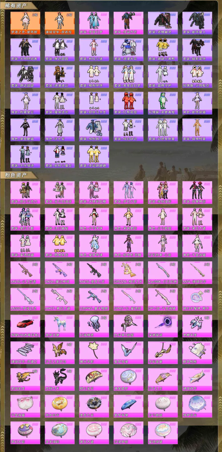 【稀有资产】梦海之灵-妮芮妲[2级]/镜域双华-欧若拉[2级]/套装-雪国幻梦/套装-怪诞乔克/套装-赤蝎幽灵/套装-都市猎人/套装-天网终结者/套装-胖达圆圆/套装-粉红小猪/套装-浪漫天命/套装-潮萌小黄鸭/套装-暗影哥特/套装-胖达团团/套装-浪漫波比/套装-糯粉咩咩/套装-兔兔白日梦/套装-晶辉守护/玩偶服-小狗蛇点点/角色-粉雾星云/套装-璀璨流光/套装-软软马卡龙/套装-红熊茄茄/玩偶服-卖崽青蛙/角色-都市丽猫/角色-摩登魅猫/角色-许七安/套装-缤纷假日/套装-纯白跃动/套装-动感兔斯基人偶服/套装-萌神柯基/套装-牛仔情诗/套装-软软小魔女/套装-幸运萌趣趣