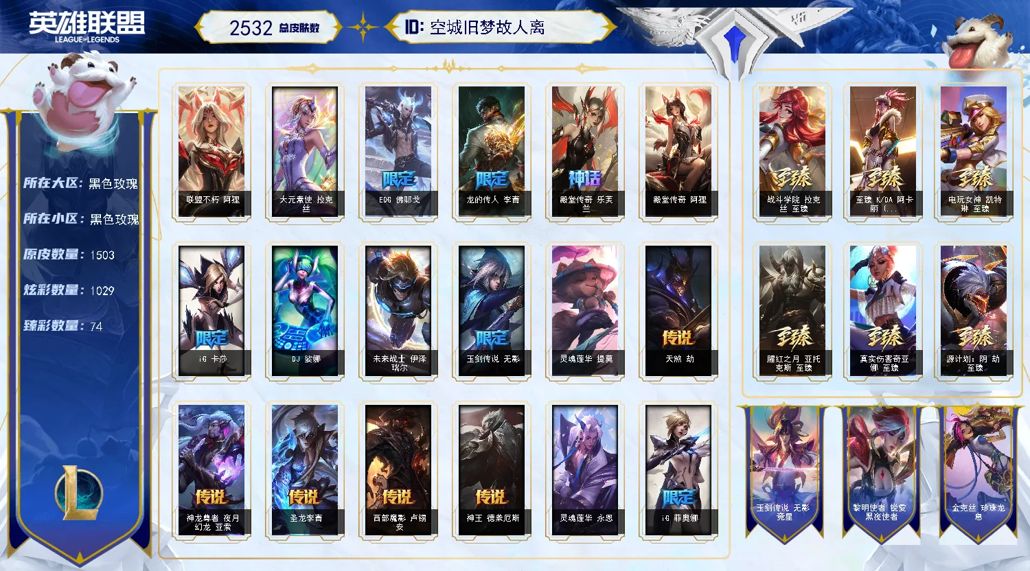 黑色玫瑰3000皮♥️全英雄可下棋可排位/签名阿狸️/8终极❤️141神话至臻❤️294限定❤️高质量热门皮肤