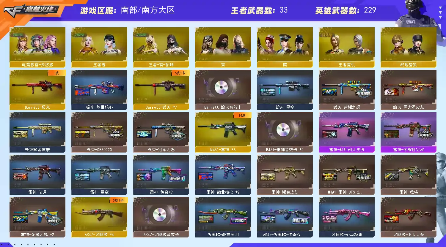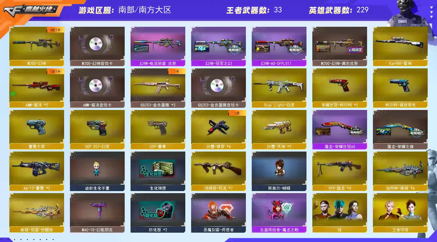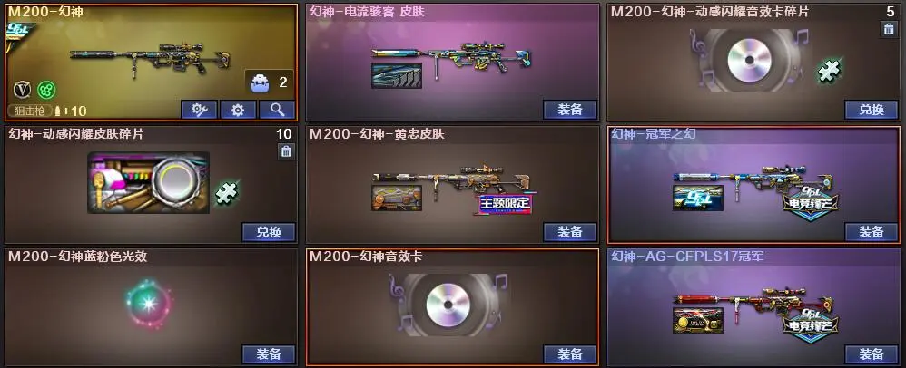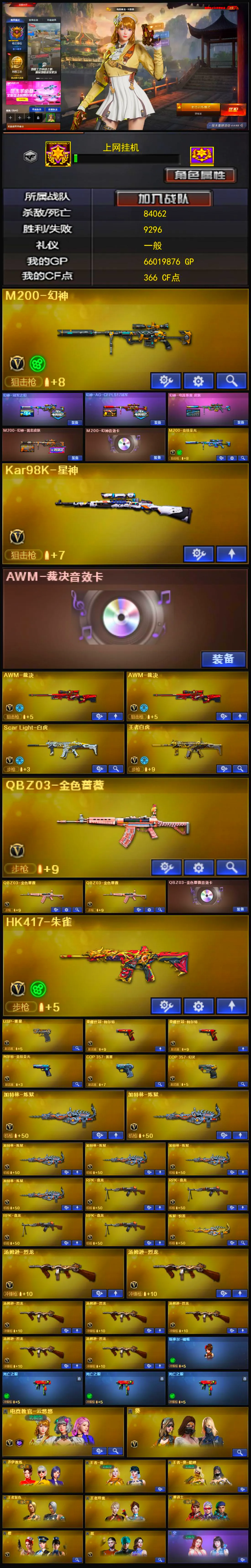 【荣耀之巅】【等级VIP6】【幻神三件套】【幻神4皮】【6烈龙】【死亡之眼】【斯泰尔-蝴蝶】【神工天巧套装X2套】【竞技荣光套装X3套】【幻灵套装X4套】【夜魔套装X1套】【堕天神套装X2套】【堕天神套装X2套】【雷霆套装X5套】【雷暴套装X4套】【M200-幻神】【幻神-冠军之幻】【幻神-AG-CFPLS17冠军】【幻神-电流骇客 皮肤】【M200-幻神-黄忠皮肤】【M200-幻神音效卡】【M200-竞技荣光】【Kar98K-星神】【AWM-裁决】【AWM-裁决音效卡】【Scar Light-白虎】【王者白虎-觉醒版】【QBZ03-金色蔷薇】【QBZ03-金色蔷薇音效卡】【HK417-朱雀】【USP-雷暴】【荣耀世冠-柯尔特】【柯尔特-竞技荣光】【雷霆之契】【COP 357-幻灵】【电竞教官-云悠悠】【葵】【乔伊教练】【王者春】【王者-葵-貂蝉】【王者复仇】【王者玲珑】【修道士】【樱】【炫】【空】【Barrett-毁灭音效卡】【M4A1-雷神音效卡】【AK47-火麒麟音效卡】【M4A1-黑龙音效卡】【M4A1-黑骑士音效卡】【烈火-动感闪耀 音效卡】【天神-动感闪耀 音效卡】【屠龙-动感闪耀 音效卡】