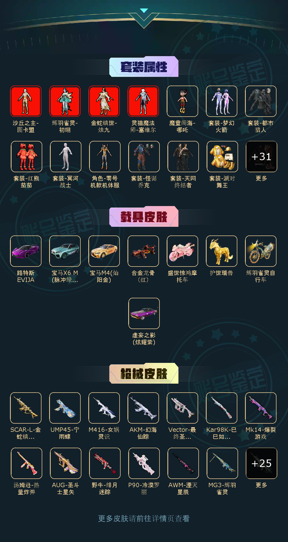 35粉,8载具,37特效枪,283套装,28王牌印记 SCAR-L-梦幻火箭SCAR-L-童趣迷兔M416-风花雪月GROZA-香水柠檬M416-心之恋语M416-五爪金龙AKM-炫紫旋律MG3-洛神天依UZI-筑梦精灵UMP45-雪国精灵M762-甜蜜誓约Mini14-龙虾霸霸合金龙骨(红)