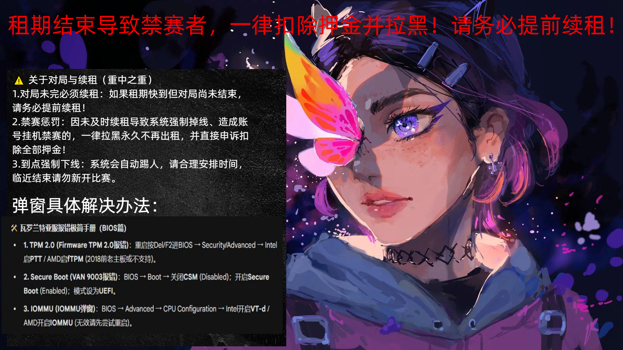 禁赛惩罚:因未及时续租导致系统强制掉线、造成账号挂机禁赛的,一律拉黑永久不再出租,并直接申诉口除全部押金!