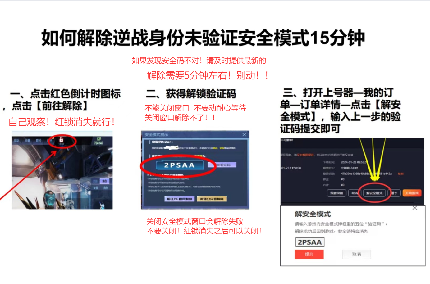 解除安全模式要几分钟!不能关闭安全窗口,关了会解除失败!打开!进游戏就退了打开,关了窗口安全码会更新解除失败!如果更新了及时提供新的安全码!红锁消失就是好自己观察红锁,解除过一次,只要不换设备,下次一般都不会跳红锁!