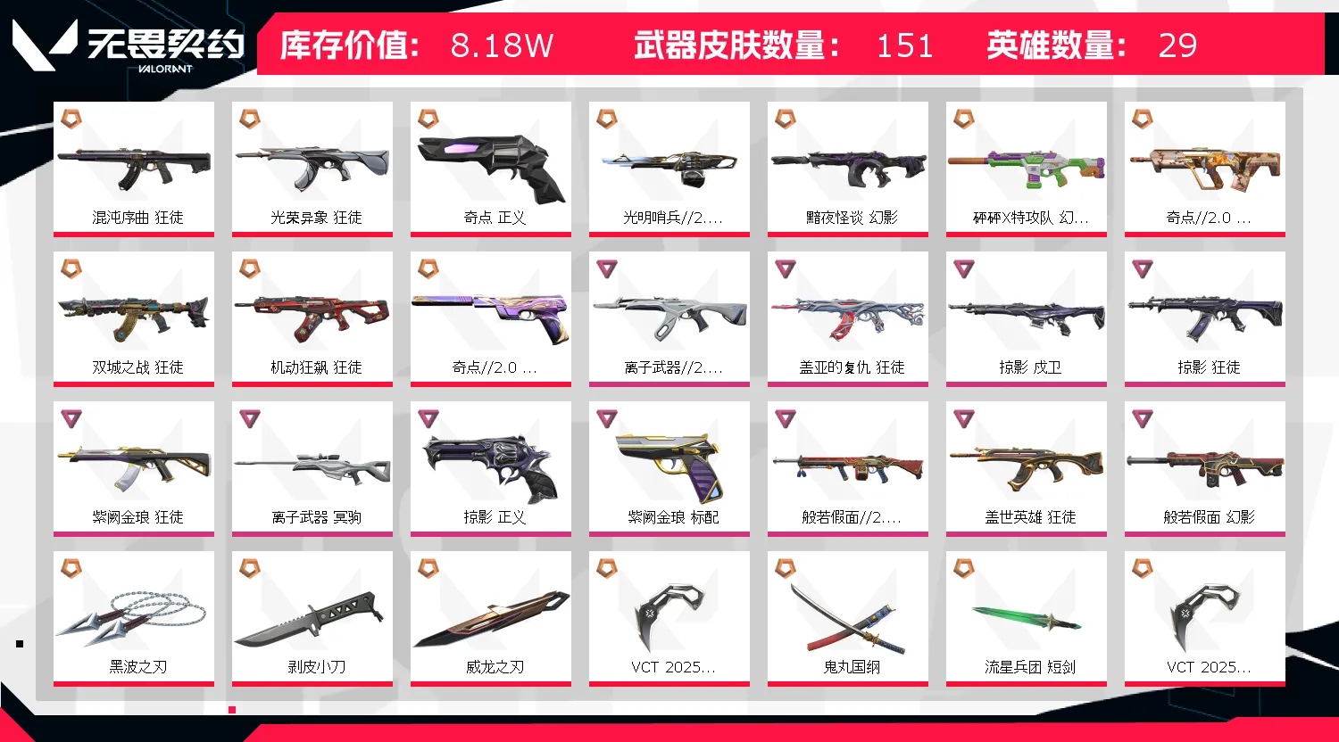 【当前段位:铂金II】8W库存⚡极品20刀VCT爪刀RGX⚡黑波之刃⚡剥皮小刀⚡神之刃⚡盖亚混沌光荣异象⚡起点正义⚡神罚套