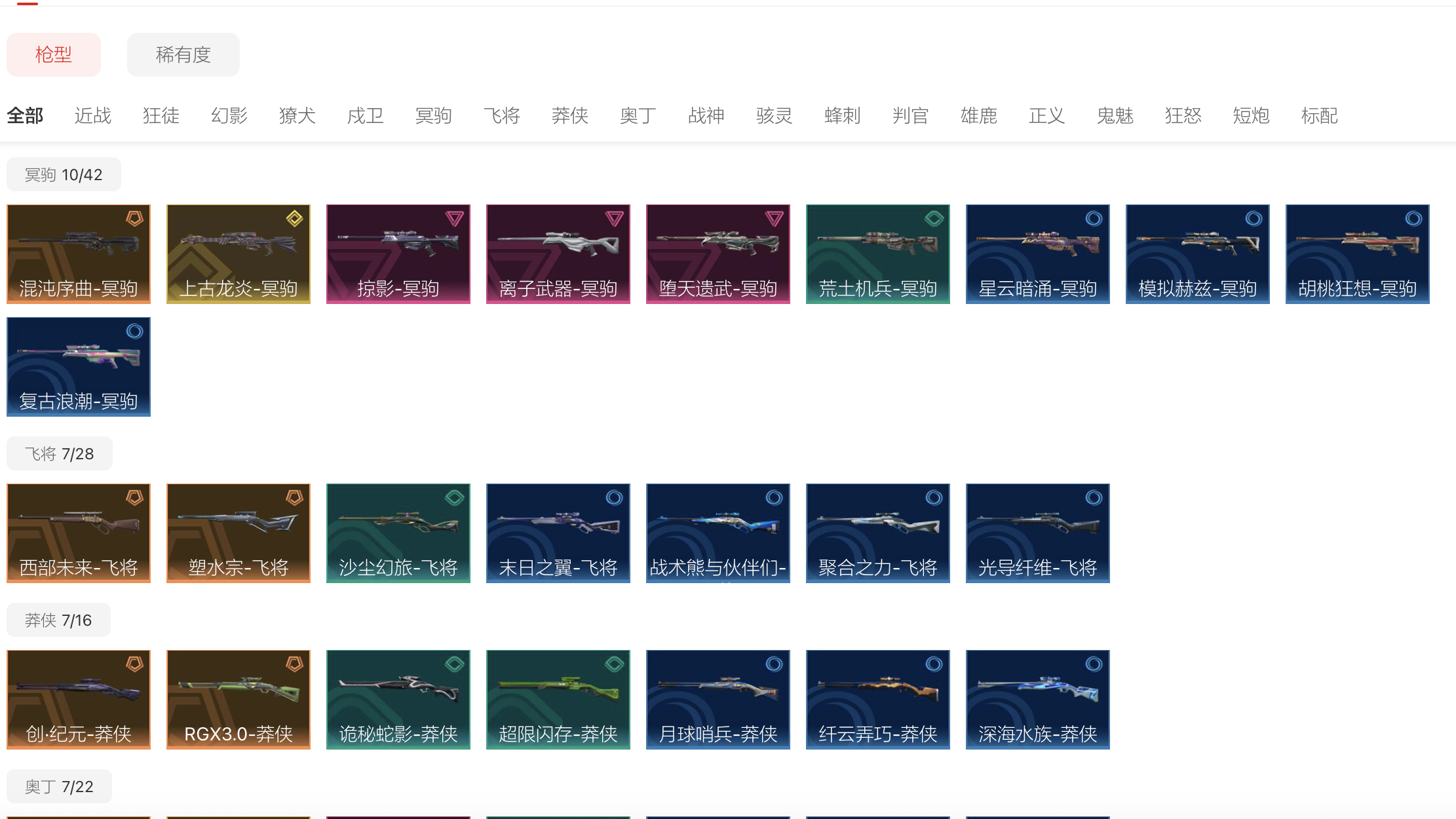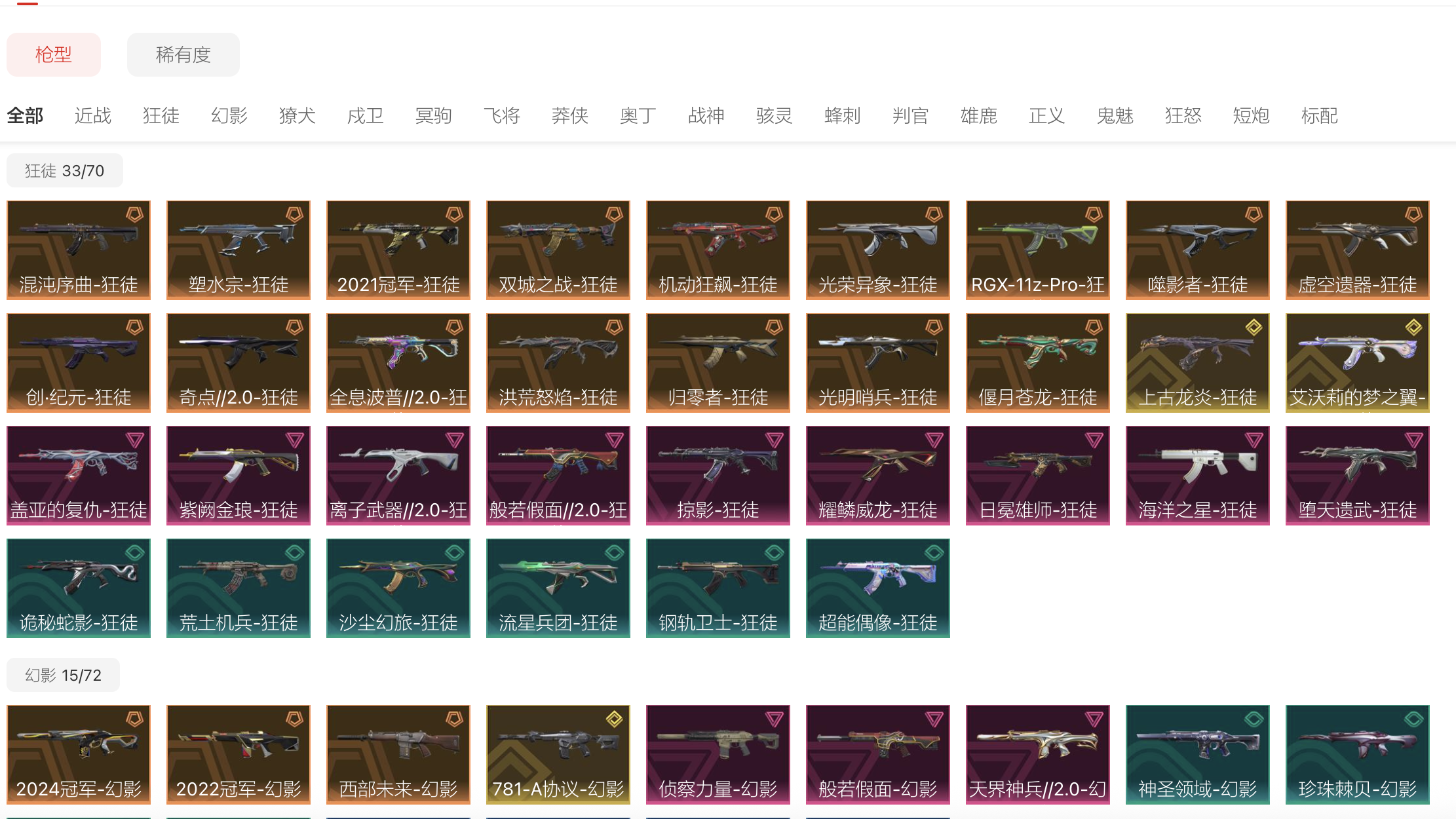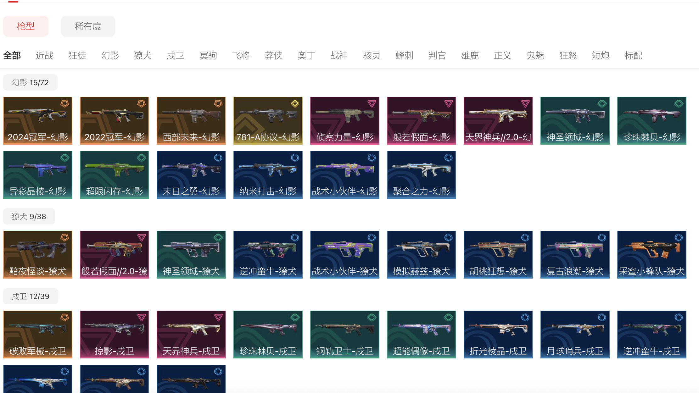 【拥有步枪】光荣异象-狂徒,RGX-11z-Pro-狂徒,虚空遗器-狂徒,噬影者-狂徒,光明哨兵-狂徒,黯夜怪谈-獠犬,洪荒怒焰-狂徒,破败军械-戍卫,全息波普//2.0-狂徒,机动狂飙-狂徒,归零者-狂徒,偃月苍龙-狂徒,781-A协议-幻影,离子武器//2.0-狂徒,天界神兵-戍卫,紫阙金琅-狂徒,盖亚的复仇-狂徒,侦察力量-幻影,般若假面-幻影,海洋之星-狂徒,日冕雄师-狂徒,诡秘蛇影-狂徒,神圣领域-獠犬,神圣领域-幻影,异彩晶棱-幻影,荒土机兵-狂徒,超限闪存-幻影,超能偶像-戍卫,超能偶像-狂徒,流星兵团-狂徒,珍珠棘贝-幻影,珍珠棘贝-戍卫,钢轨卫士-狂徒,钢轨卫士-戍卫,沙尘幻旅-狂徒,末日之翼-幻影,折光棱晶-戍卫,月球哨兵-戍卫,纳米daji-幻影,逆冲蛮牛-戍卫,逆冲蛮牛-獠犬,模拟赫兹-獠犬,浮光跃金-戍卫,聚合之力-幻影,采蜜小蜂队-獠犬,战术熊与伙伴们-戍卫,复古浪潮-獠犬,战术小伙伴-獠犬,战术小伙伴-幻影,萌彩剪影-戍卫,胡桃狂想-獠犬,