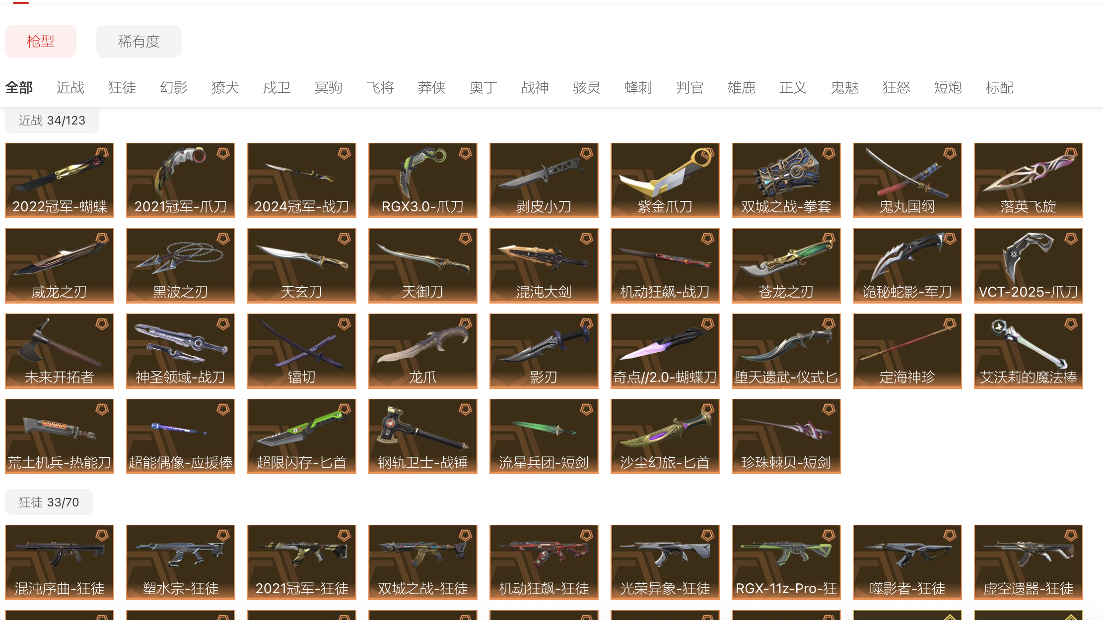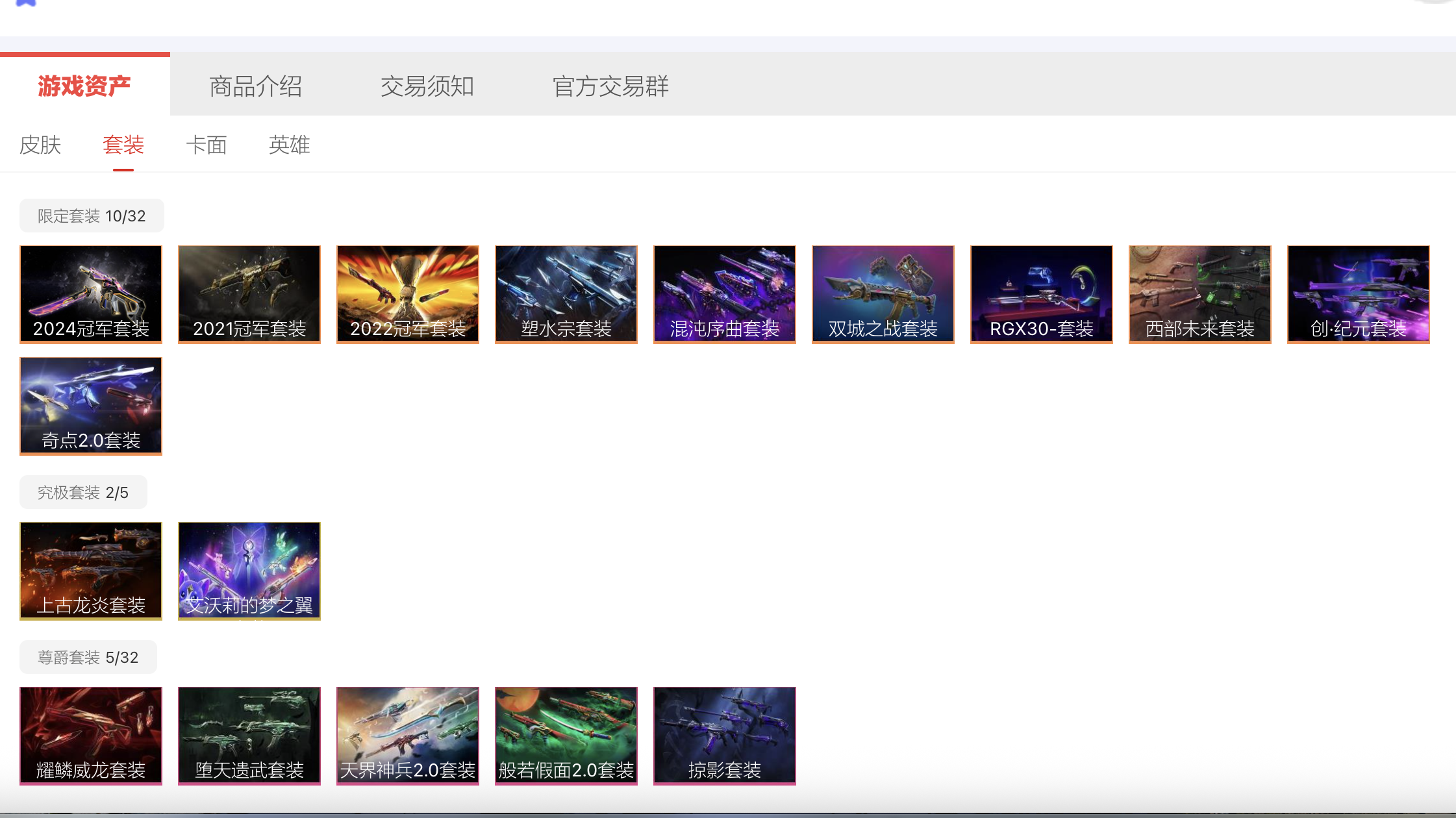 【拥有套装】2022全球冠军赛套装(2022全球冠军赛-幻影,2022全球冠军赛-蝴蝶刀)西部未来套装(西部未来-幻影,西部未来-奥丁,西部未来-飞将,西部未来-正义,未来开拓者)创纪元套装(创·纪元-狂徒,创·纪元-莽侠,创·纪元-骇灵,创·纪元-正义,镭切)上古龙炎套装(上古龙炎-狂徒,上古龙炎-冥驹,上古龙炎-判官,上古龙炎-狂怒,龙爪)混沌序曲套装(混沌序曲-狂徒,混沌序曲-冥驹,混沌序曲-蜂刺,混沌序曲-短炮,混沌大剑)双城之战套装(双城之战-狂徒,双城之战-拳套)堕天遗武套装(堕天遗武-狂徒,堕天遗武-冥驹,堕天遗武-骇灵,堕天遗武-标配,堕天遗武-仪式匕首)塑水宗套装(塑水宗-骇灵,塑水宗-狂徒,塑水宗-飞将,塑水宗-正义,黑波之刃)奇点2.0套装(奇点//2.0-狂徒,奇点//2.0-鬼魅,奇点//2.0-蝴蝶刀)般若假面2.0套装(般若假面//2.0-狂徒,般若假面//2.0-獠犬,般若假面//2.0-战神,般若假面//2.0-狂怒,鬼丸国纲)2024全球冠军赛套装(2024全球冠军赛-幻影,2024全球冠军赛-战刀)2021全球冠军赛套装(2021全球冠军赛-狂徒,2021全球冠军赛-爪刀)RGX-11z-Pro//3.0套装(RGX-11z-Pro//3.0-莽侠,RGX-11z-Pro//3.0-正义,RGX-11z-Pro//3.0-爪刀)天界神兵2.0套装(天界神兵//2.0-幻影,天界神兵//2.0-奥丁,天界神兵//2.0-判官,天界神兵//2.0-狂怒,天御刀)耀鳞威龙套装(耀鳞威龙-狂徒,耀鳞威龙-鬼魅,威龙之刃)艾沃莉的梦之翼套装(艾沃莉的梦之翼-狂徒,艾沃莉的梦之翼-奥丁,艾沃莉的梦之翼-骇灵,艾沃莉的梦之翼-鬼魅,艾沃莉的魔法棒)掠影套装(掠影-狂徒,掠影-冥驹,掠影-戍卫,掠影-正义,影刃)