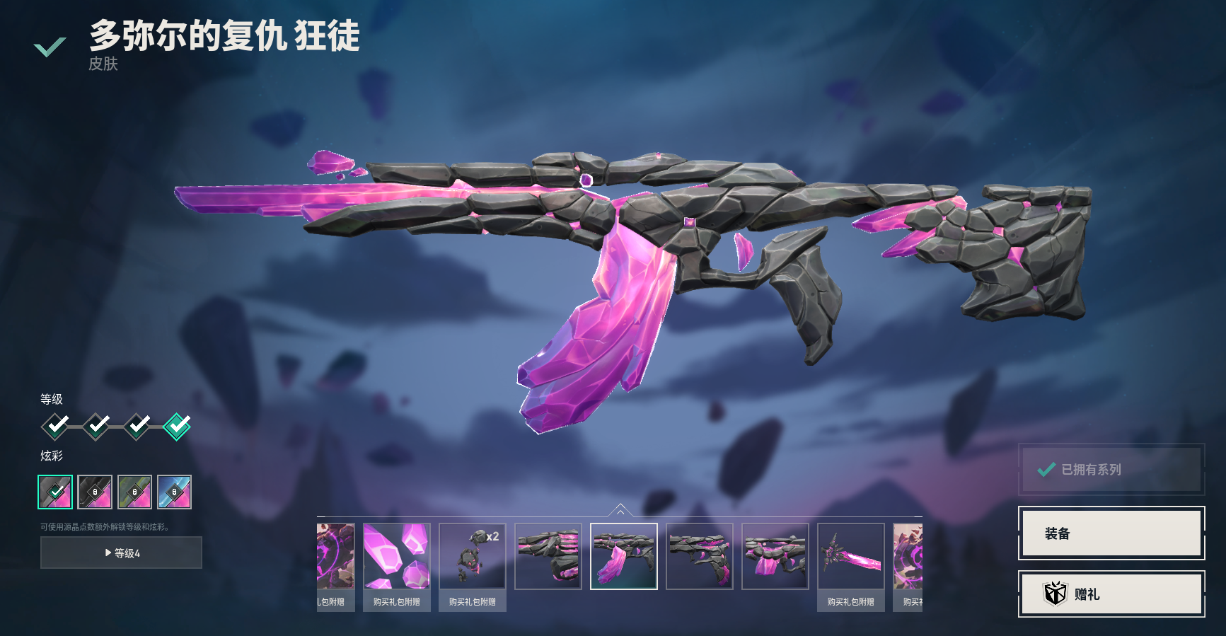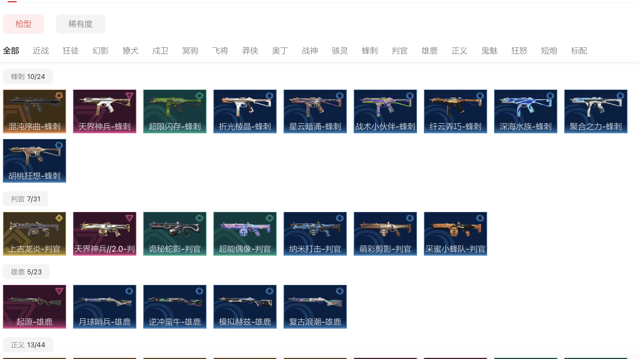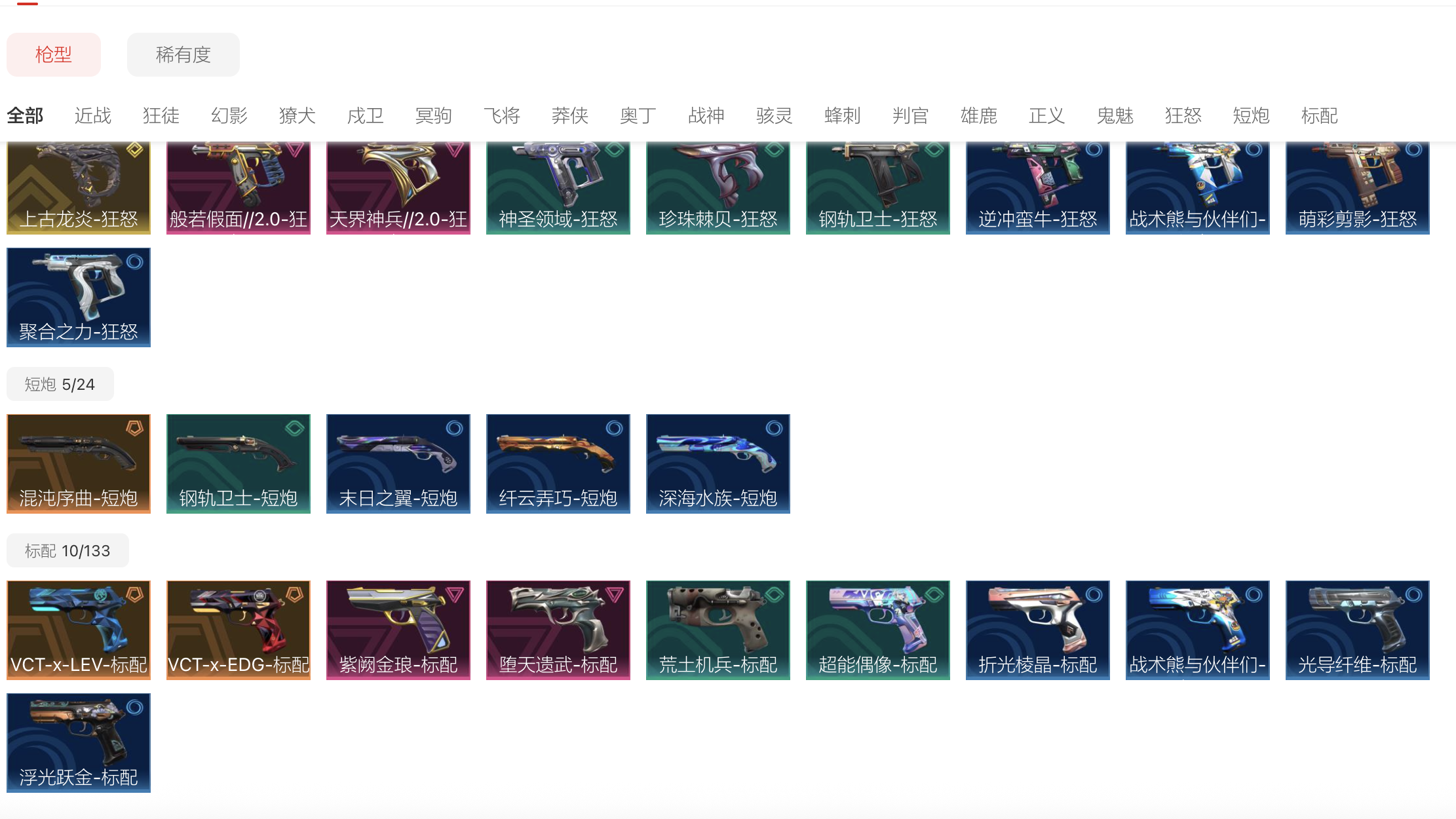 【拥有手枪】VCT-x-EDG-标配,VCT-x-LEV-标配,奇点-正义,天界神兵-鬼魅,紫阙金琅-标配,离子武器-正义,诡秘蛇影-鬼魅,神圣领域-狂怒,荒土机兵-标配,超限闪存-正义,超能偶像-标配,流星兵团-鬼魅,珍珠棘贝-狂怒,钢轨卫士-狂怒,钢轨卫士-短炮,沙尘幻旅-正义,折光棱晶-标配,末日之翼-短炮,星云暗涌-鬼魅,月球哨兵-正义,纳米daji-正义,逆冲蛮牛-狂怒,模拟赫兹-鬼魅,浮光跃金-标配,聚合之力-狂怒,采蜜小蜂队-鬼魅,纤云弄巧-正义,战术熊与伙伴们-狂怒,纤云弄巧-短炮,战术熊与伙伴们-标配,复古浪潮-正义,深海水族-短炮,光导纤维-鬼魅,光导纤维-标配,萌彩剪影-狂怒,胡桃狂想-鬼魅,