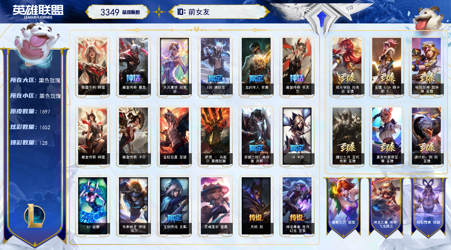 黑色玫瑰3000皮/️全英雄可下棋可排位/签名阿狸️名人堂卡莎/2圣堂/9终极️/140神话至臻/340限定