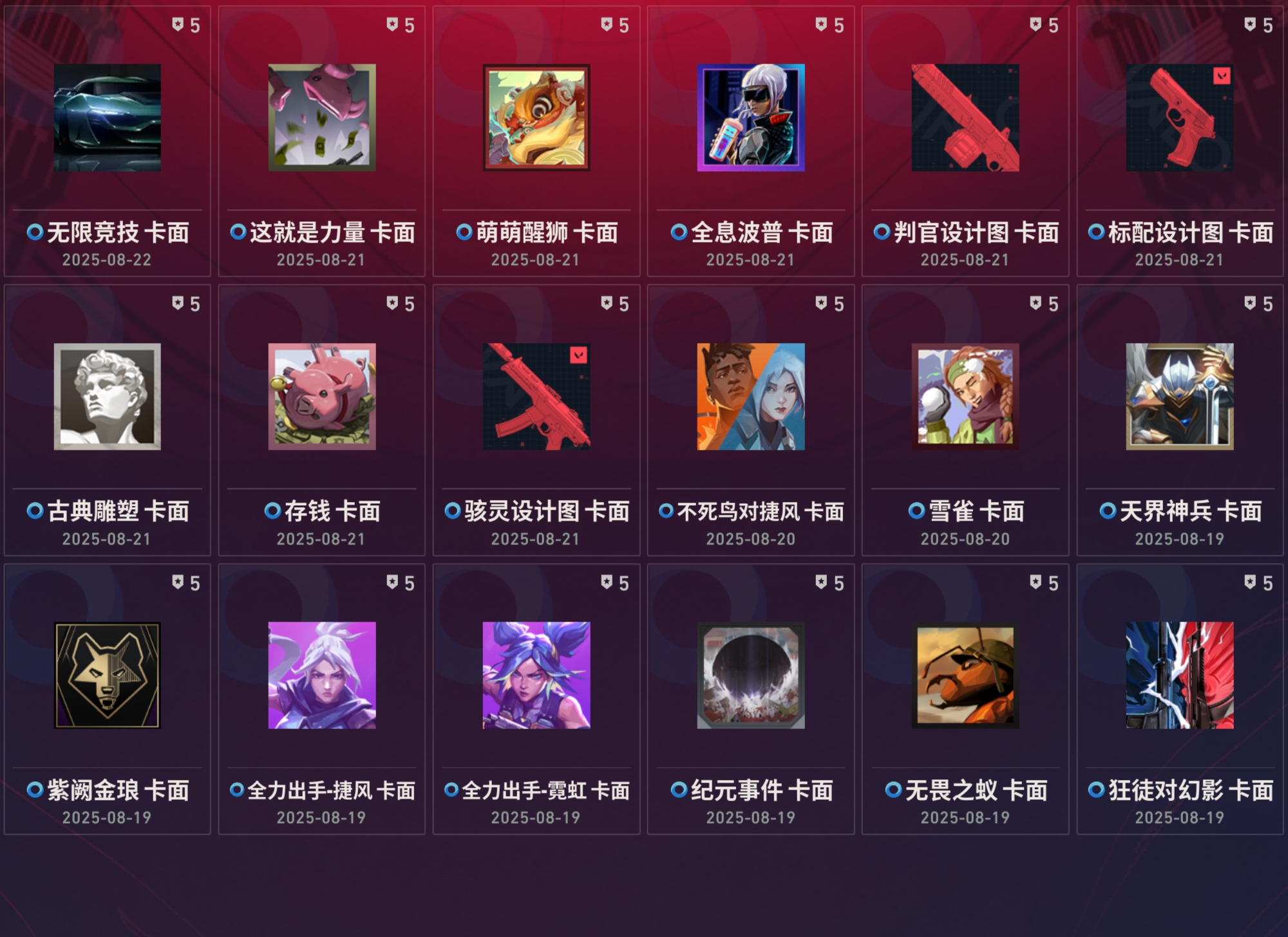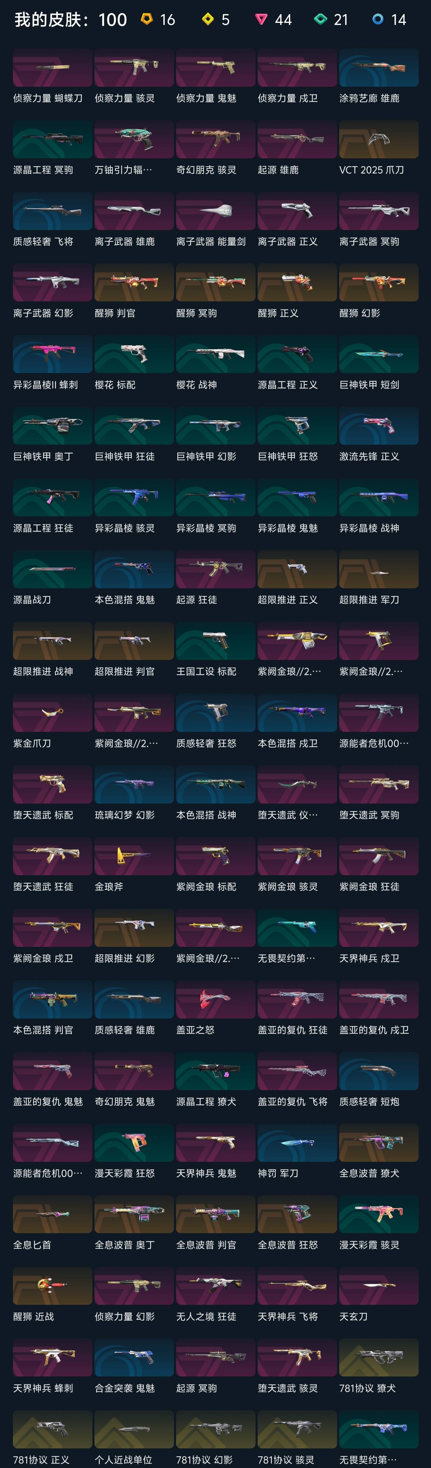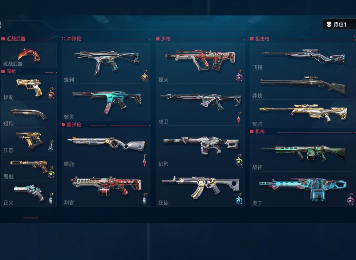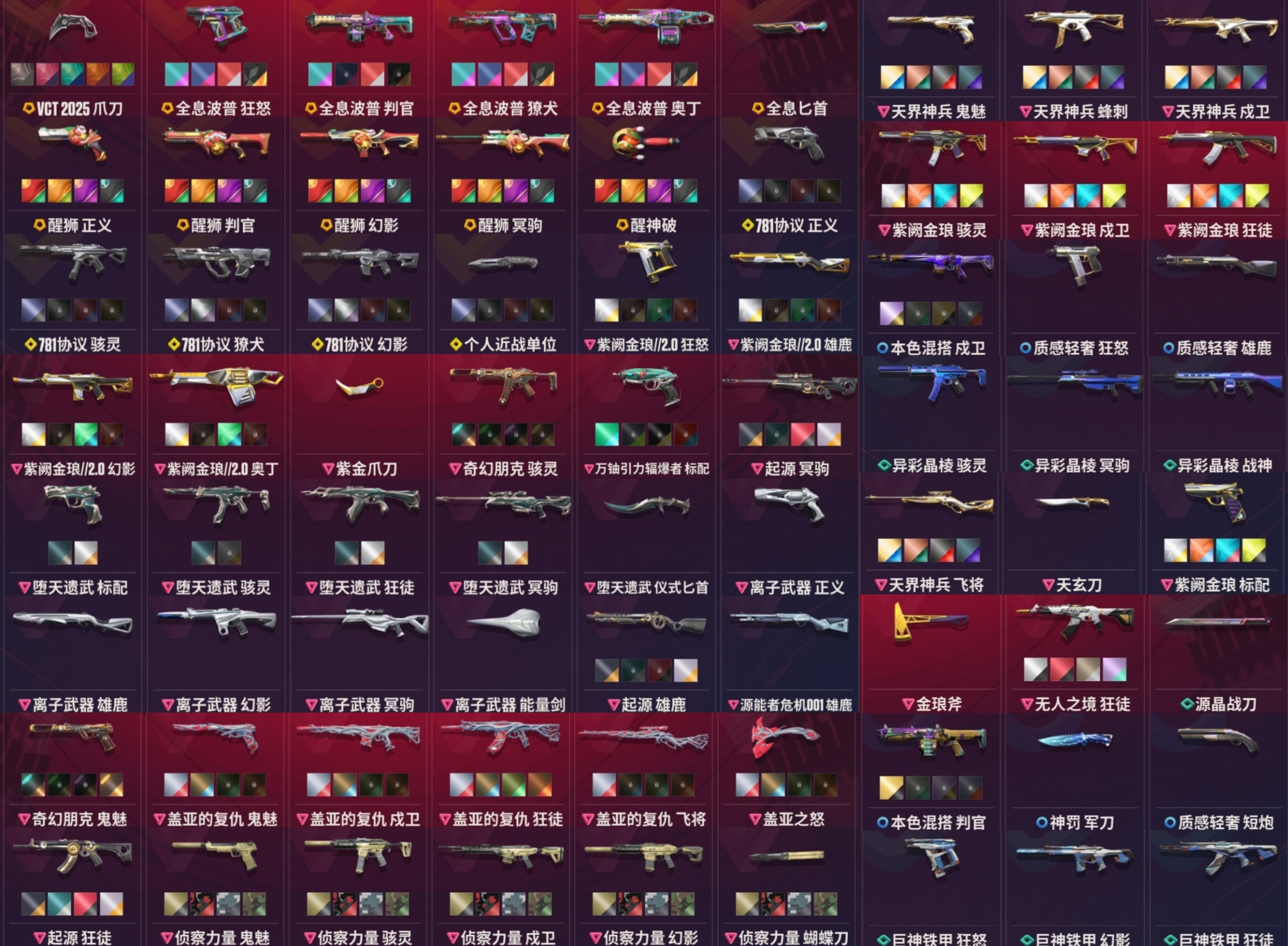 近战武器:vct2025爪刀满级全炫彩(vct爪刀)/沧澜戟2级深蓝/偃月2级莹白/无畏契约第1卷苦无2级/荧光刀2级蓝色/澄湖涟滟2级鱼扇/紫金爪刀2级/推进模式前进四2级红黑银蓝/堕天遗武仪式匕首2级/个人近战单位2级/离子武器能量剑2级/盖亚之怒2级蓝色/全息匕首2级/醒神破2级全炫彩/天玄刀2级/侦察力量蝴蝶刀2级全炫彩(侦察蝴蝶刀)/金琅斧2级/巨神铁甲短剑/神罚军刀(神中神)/再见安打2级