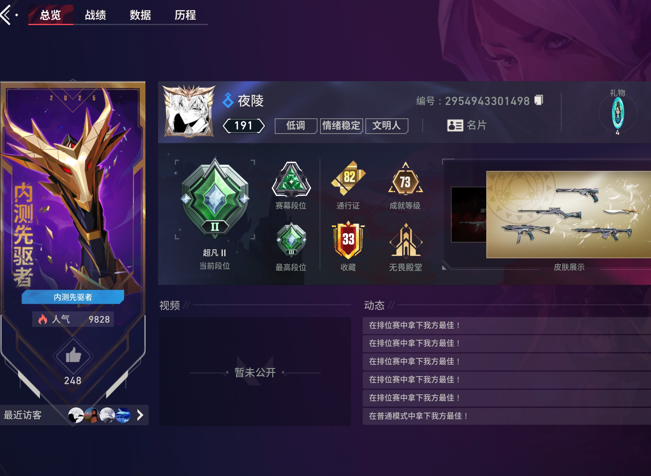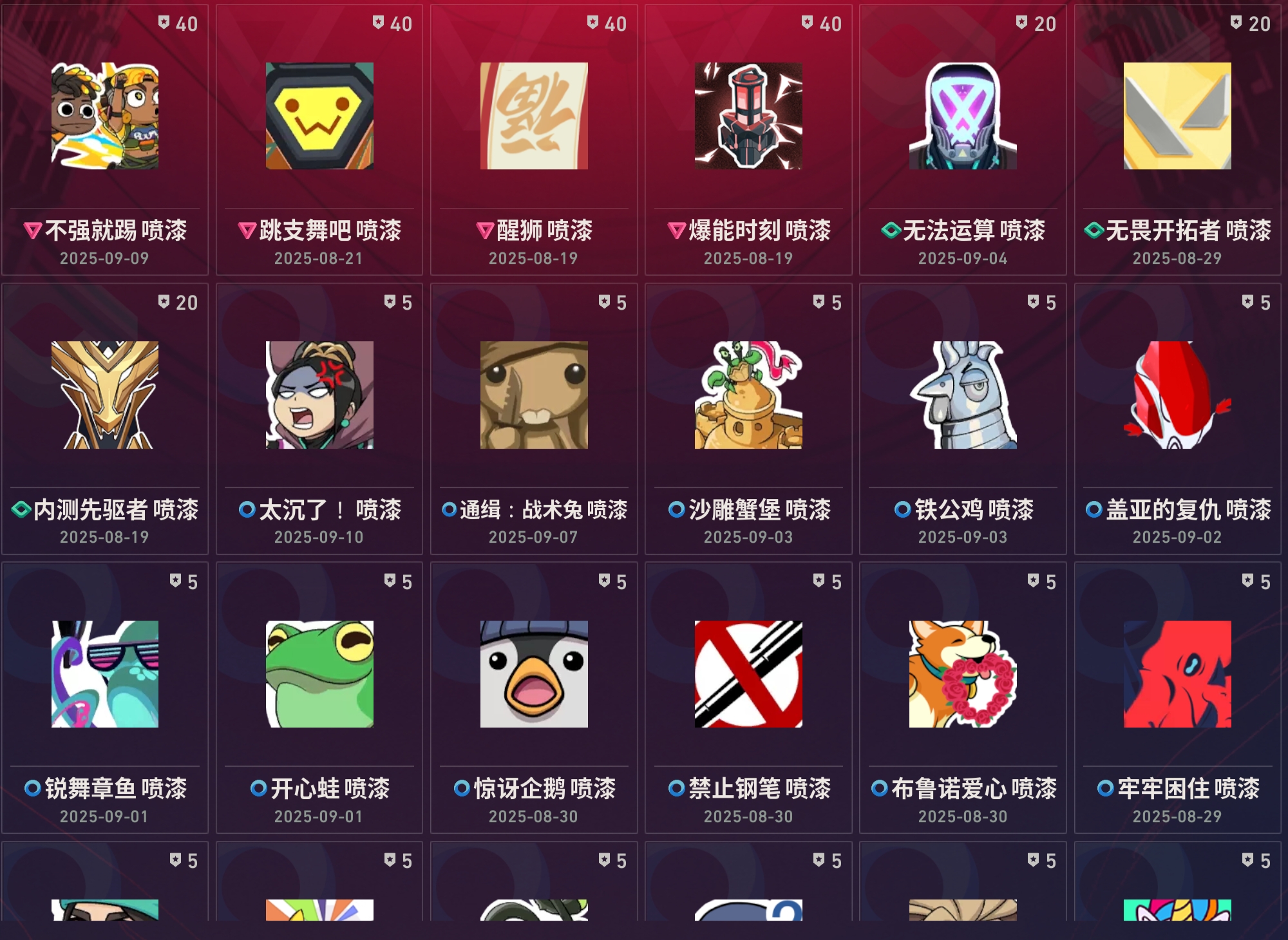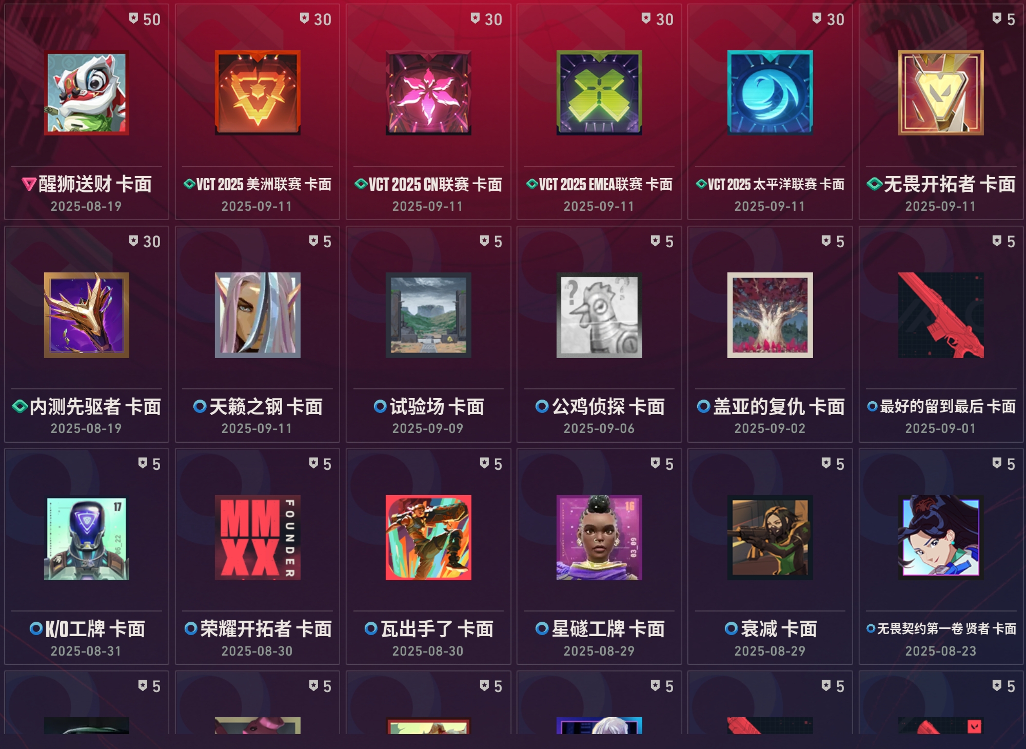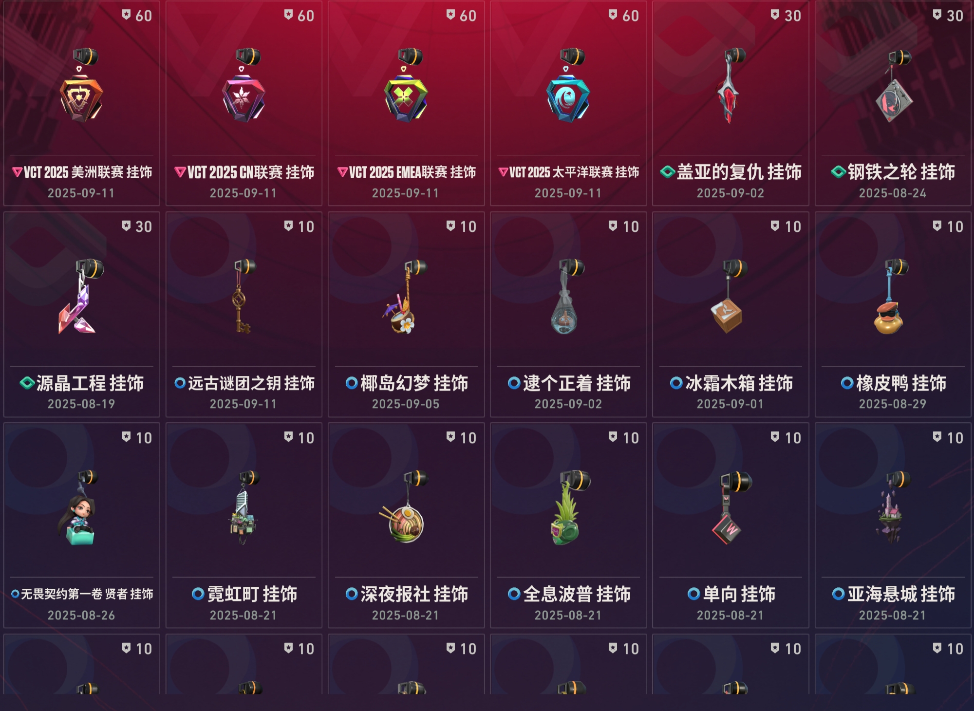 近战武器:vct2025爪刀满级全炫彩(vct爪刀)/沧澜戟2级深蓝/偃月2级莹白/无畏契约第1卷苦无2级/荧光刀2级蓝色/澄湖涟滟2级鱼扇/紫金爪刀2级/推进模式前进四2级红黑银蓝/堕天遗武仪式匕首2级/个人近战单位2级/离子武器能量剑2级/盖亚之怒2级蓝色/全息匕首2级/醒神破2级全炫彩/天玄刀2级/侦察力量蝴蝶刀2级全炫彩(侦察蝴蝶刀)/金琅斧2级/巨神铁甲短剑/神罚军刀(神中神)/再见安打2级