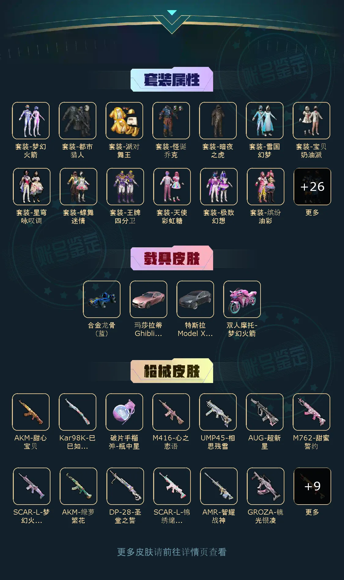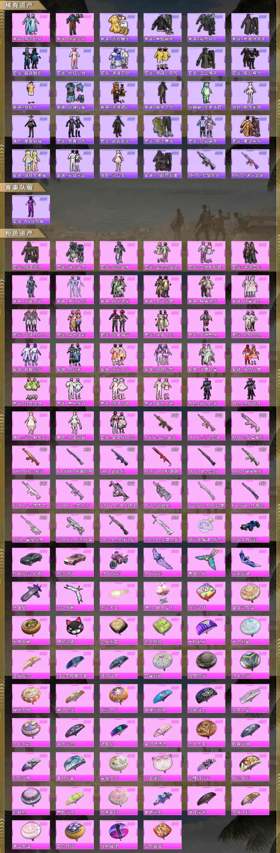 【稀有资产】套装-雪国幻梦/套装-怪诞乔克/套装-派对舞王/套装-寒蝎幽灵/套装-都市猎人/套装-奇异狩猎者/套装-暗夜魅影/套装-粉红小猪/套装-浪漫天命/套装-潮萌小黄鸭/套装-雪山精英/套装-暗影哥特/套装-龟仙人/套装-迅捷狂鲨/套装-浪漫波比/套装-暗夜之虎/玩偶服-卖崽青蛙/角色-都市丽猫/角色-摩登魅猫/套装-墨青刃影/套装-暗夜武装/套装-狂沙舞者/套装-狂战萌兔/套装-青涩年华/套装-萌萌史莱姆/套装-奇迹天团/角色-灵公主/套装-冷酷挑战者/M416-仓鼠灰灰/M416-快乐主宰