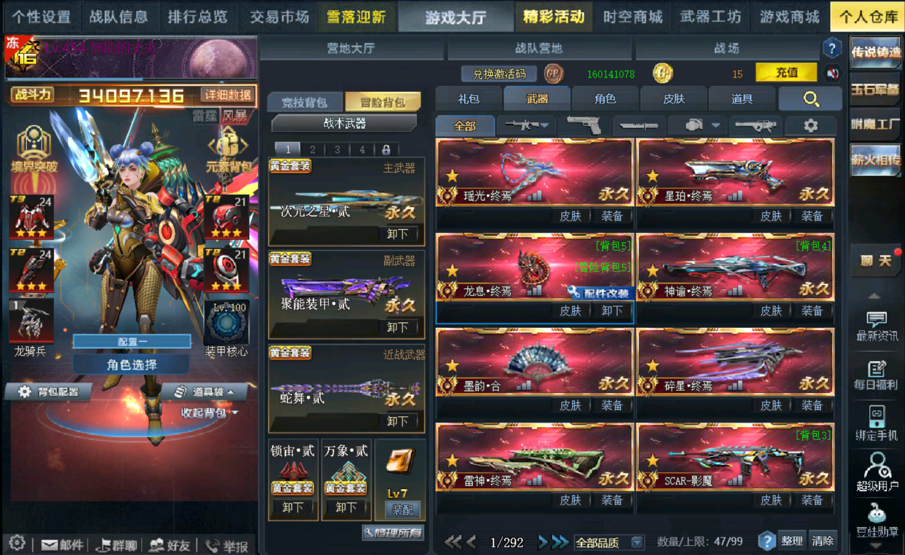 传说武器:瑶光终焉◆星珀终焉◆RPK主宰◆龙息·终焉◆神谕·终焉◆AK47主宰◆墨韵·合◆碎星·终焉◆雷神·终焉◆SCAR-影魔◆无尽光影·终焉◆M4A1无限EX◆屠魔◆AK47天神◆