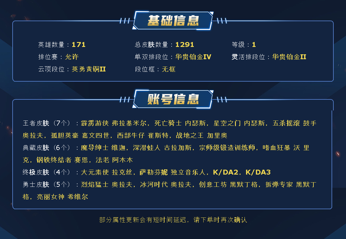 ~~喜欢记得收藏~~可排位~~1273皮全英雄~~租之前尽量查一下游戏ID,确保段位是您需要的,避免浪费您的时间~~请勿挂机逃跑故意送人头,谢谢合作,谢谢~~