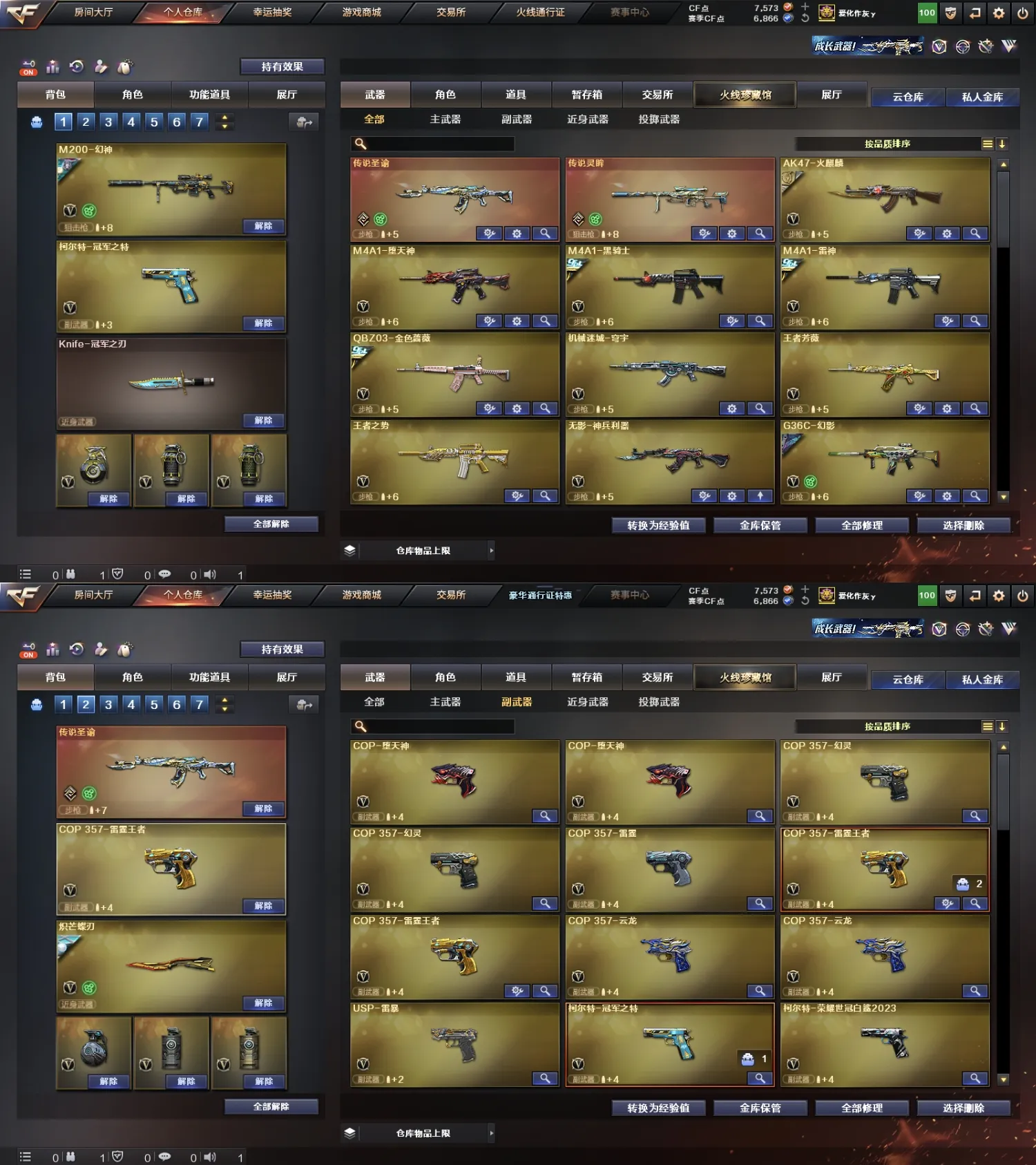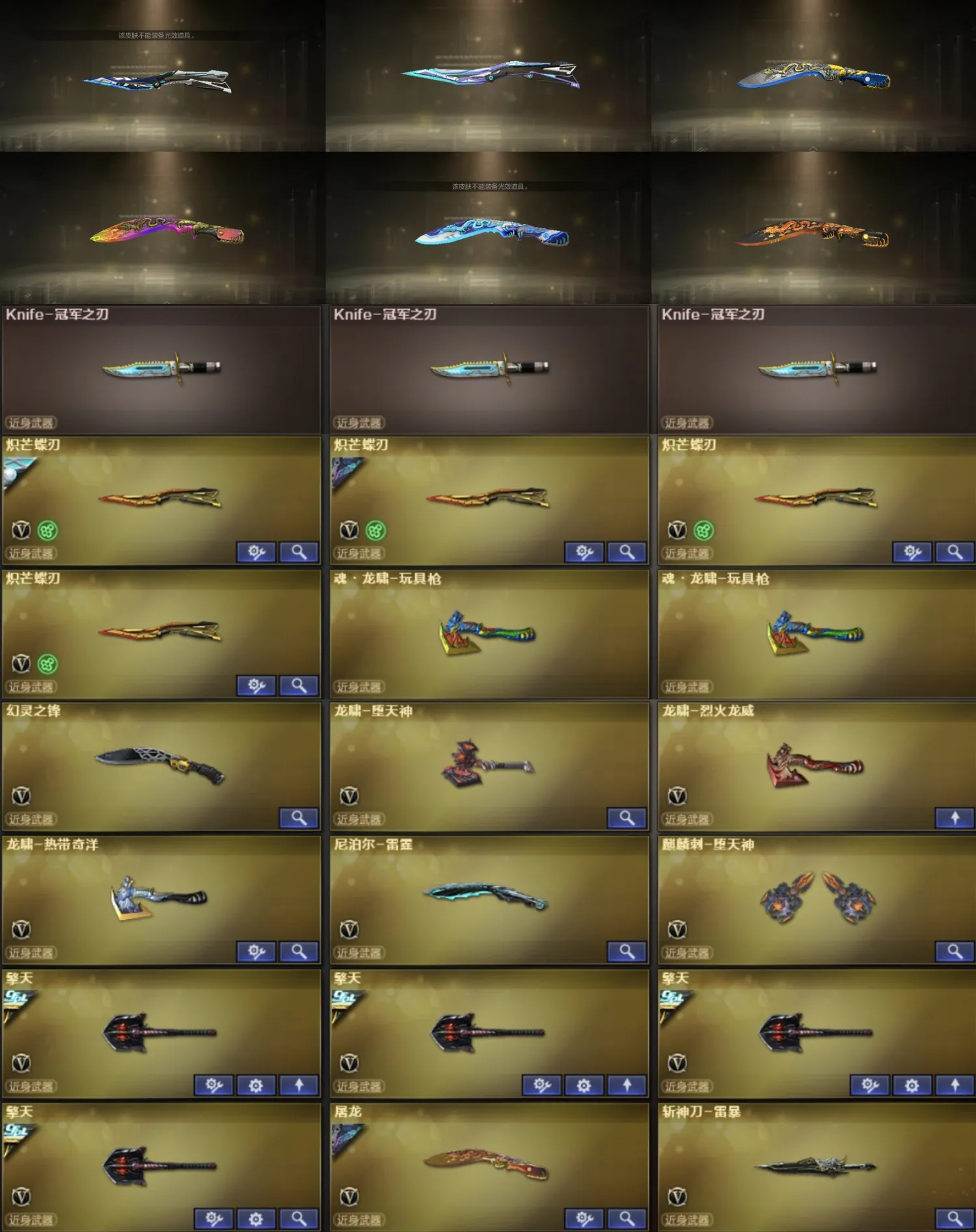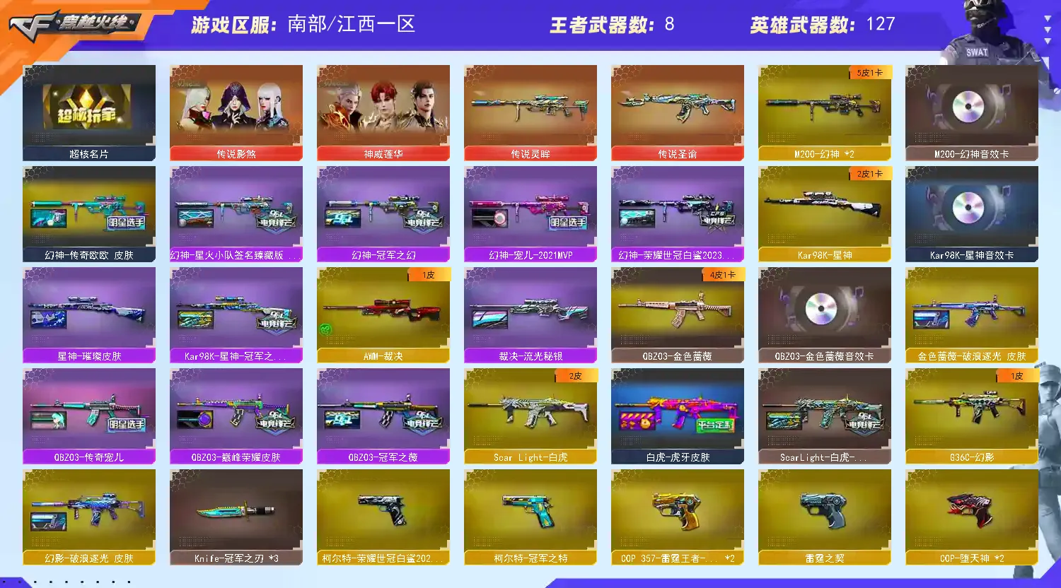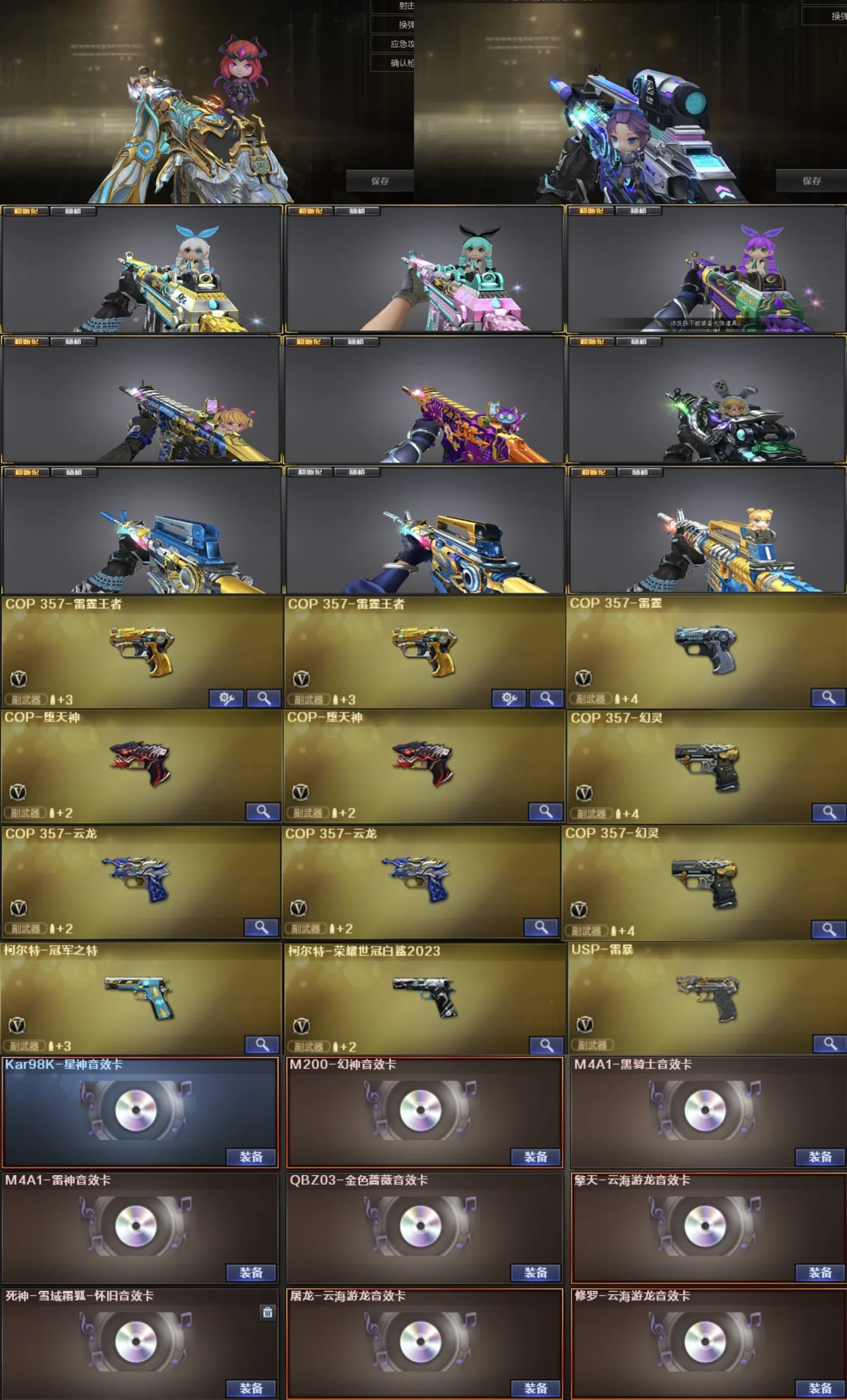 [重要武器皮肤]幻神-星火小队签名臻藏版皮肤、幻神-欧欧 皮肤、幻神-荣耀世冠白鲨2023皮肤、幻神-宠儿-2021MVP、幻神-冠军之幻、Kar98K-星神-冠军之星皮肤、星神-璀璨皮肤、毁灭-荣耀之怒、毁灭-墨兰皮肤、极光-高能霹雳皮肤、裁决-流光秘银、火麒麟-CFSTAR、火麒麟-大唐荣光、火麒麟-轻羽皮肤、火麒麟-冠军之心、AK-47-雷神、雷神-冠军之魄、M4A1-雷神-白鲨皮肤、雷神-荣耀之魄、黑骑士-冠军之势、黑骑士-AG-S4冠军典藏、黑龙-冠军之武、幻影-破浪逐光 皮肤、白虎-虎牙皮肤、ScarLight-白虎-冠军之虎皮肤、QBZ03-巅峰荣耀皮肤、QBZ03-冠军之薇、QBZ03-传奇宠儿、修罗-冠军之魂、屠龙-破浪逐光 皮肤、屠龙-春桃皮肤、屠龙-荣耀之锋、屠龙、屠龙-星火燎原、擎天-冠军之击、擎天-蒸汽钟表 皮肤、龙啸-冠军之啸、炽芒蝶刃-破浪逐光皮肤、炽芒蝶刃-荣耀世冠白鲨2023 皮肤[重要光效]屠龙-流星光效、屠龙蓝色光