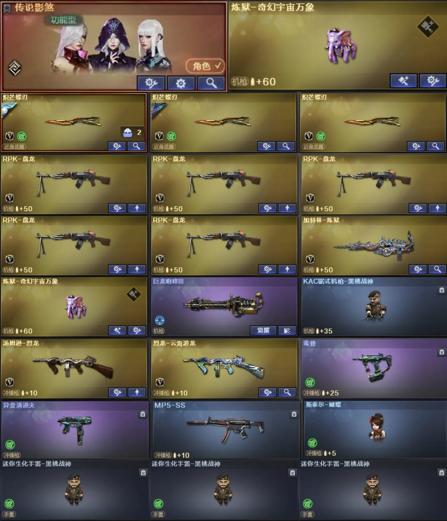 【英雄武器]_M200-幻神(2)、王者之怒-觉醒版、Kar98K-星神、AWM-裁决、M4A1-堕天神、M4A1-雷神、M4A1-黑骑士、王者之势-觉醒版、_Scar Light-白虎、M14EBR-玄武、AK47-火麒麟、无影-神兵利器、QBZ03-金色蔷薇、RPK-盘龙(5)、汤姆逊-烈龙、加特林-炼狱、COP-堕天神(2)、COP 357-云龙(2)、COP357-幻灵(2)、COP