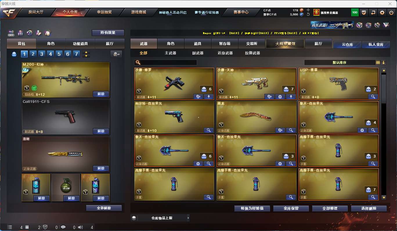 【亮点解析 蓝天白云名片】 【m200-幻神+音效卡+幻神-冠军之幻+幻神-黄忠】 【竞技荣光套+四防云悠悠+usp雷暴】 【scar白虎】 【qbz金色蔷薇】 【火麒麟+火麒麟-冠军之心】 【雷神+雷神+荣耀世冠ag】 【7手呛 修罗*4 天神 usp雷暴】 【4近战 屠龙】 【手雷 竞技荣光*7】 【四防 鹰】