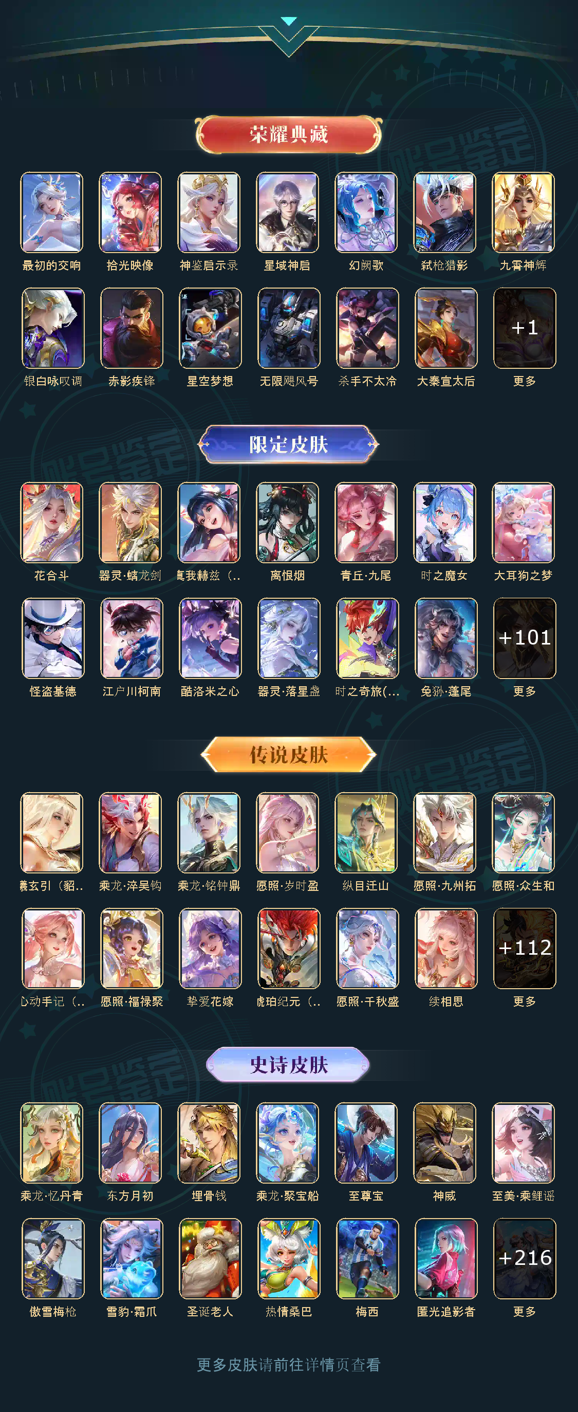 贵族等级V10荣耀贵族,英雄数量128,典藏皮肤数14,皮肤数量699,纯白花嫁/天魔缭乱/至尊宝/真爱至上/圣诞老人/热情桑巴/梅西/白虎志/久胜战神/飞衡/器灵·螭龙剑/愿照·九州拓/愿照·众生和/匿光追影者/冥王哈迪斯/神器·明辉仪/乘龙·问璇玑/群星魔术团(韩信)/神鉴启示录/心动手记(朵莉亚)/时之奇旅(大乔)/赤影疾锋/真我赫兹(瑶)/时之奇旅(鲁班七号)/落雪白狼/愿照·福禄聚/无双飞将/至美·化雀舞/遇见神鼓/挚爱花嫁/星域神启/李逍遥/花合斗/涂山红红/霜北刀/逐花归海/器灵·落星盏/琥珀纪元(马超)/幻阙歌/至美·乘鲤谣/鹤羽星尊/时之奇旅(孙策)/曦玄引(貂蝉)/离恨烟/碎月剑心/愿照·千秋盛/霜月吟/雪境奇遇(甄姬)/乘龙·淬吴钩/东方月初/拾光映像/乘龙·铭钟鼎/妄想实况/大耳狗之梦/埋骨钱/深海之息/最初的交响/黄金天蝎座/兔狲·蓬尾/玉兔公主/补天/怪盗基德/愿照·岁时盈/乘龙·聚宝船/惊梅引/弑枪猎影/续相思/异界灵契/神威/祥瑞亨通/黑崎一护/炽阳神光/启示之音/乘龙·忆丹青/影龙天霄/心动手记(海诺)/九霄神辉/朽木白哉/青丘·九尾/江户川柯南/云诺千山/鹤归松栖(云缨)/银白咏叹调/愿照·山河定/酷洛米之心/时之魔女/傲雪梅枪/雪豹·霜爪/神罪/馥梦繁花/纯白花嫁/天魔缭乱/至尊宝/真爱至上/圣诞老人/热情桑巴/梅西/白虎志/久胜战神/飞衡/器灵·螭龙剑/愿照·九州拓/愿照·众生和/匿光追影者/冥王哈迪斯/神器·明辉仪/乘龙·问璇玑/群星魔术团(韩信)/神鉴启示录/心动手记(朵莉亚)/时之奇旅(大乔)/赤影疾锋/真我赫兹(瑶)/时之奇旅(鲁班七号)/落雪白狼/愿照·福禄聚/无双飞将/至美·化雀舞/遇见神鼓/挚爱花嫁/星域神启/李逍遥/花合斗/涂山红红/霜北刀/逐花归海/器灵·落星盏/琥珀纪元(马超)/幻阙歌/至美·乘鲤谣/鹤羽星尊/时之奇旅(孙策)/曦玄引(貂蝉)/离恨烟/碎月剑心/愿照·千秋盛/霜月吟/雪境奇遇(甄姬)/乘龙·淬吴钩/东方月初/拾光映像/乘龙·铭钟鼎/妄想实况/大耳狗之梦/埋骨钱/深海之息/最初的交响/黄金天蝎座/兔狲·蓬尾/玉兔公主/补天/怪盗基德/愿照·岁时盈/乘龙·聚宝船/惊梅引/弑枪猎影/续相思/异界灵契/神威/祥瑞亨通/黑崎一护/炽阳神光/启示之音/乘龙·忆丹青/影龙天霄/心动手记(海诺)/九霄神辉/朽木白哉/青丘·九尾/江户川柯南/云诺千山/鹤归松栖(云缨)/银白咏叹调/愿照·山河定/酷洛米之心/时之魔女/傲雪梅枪/雪豹·霜爪/神罪/馥梦繁花