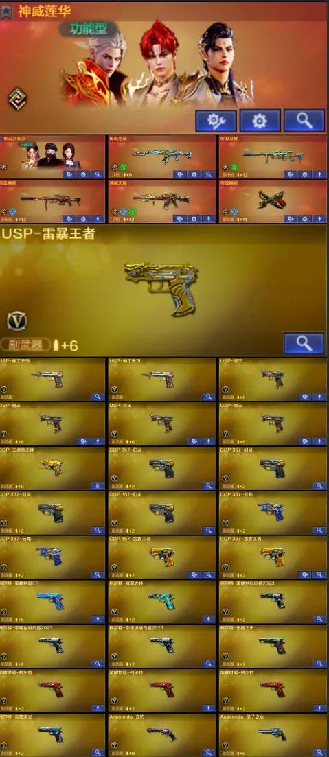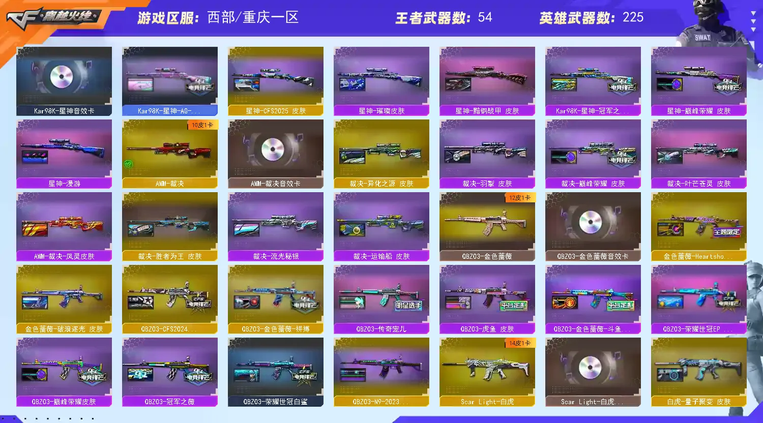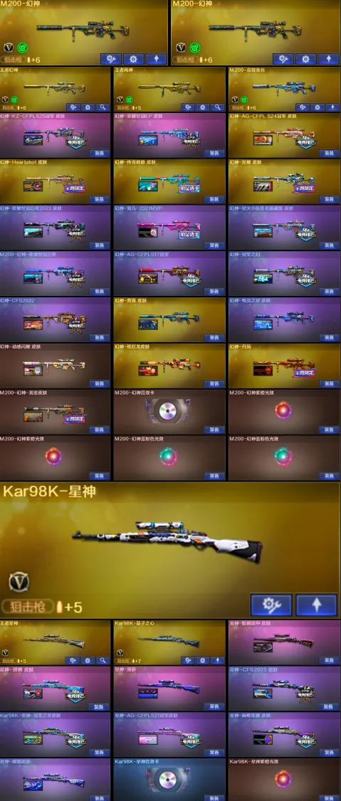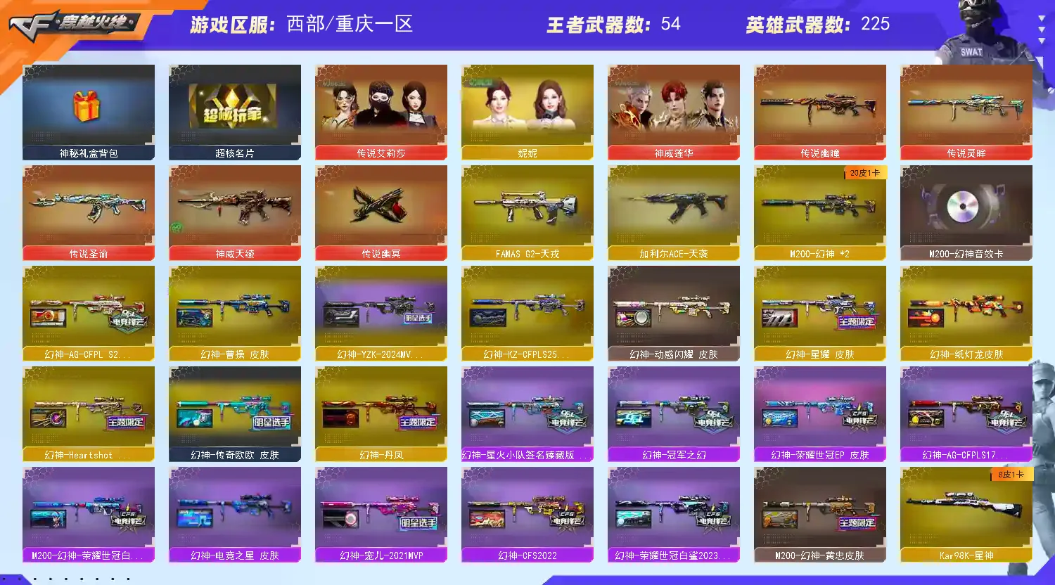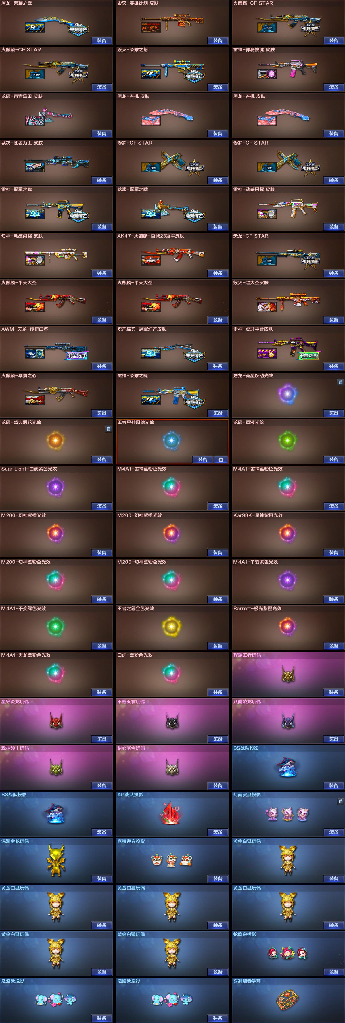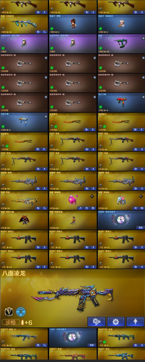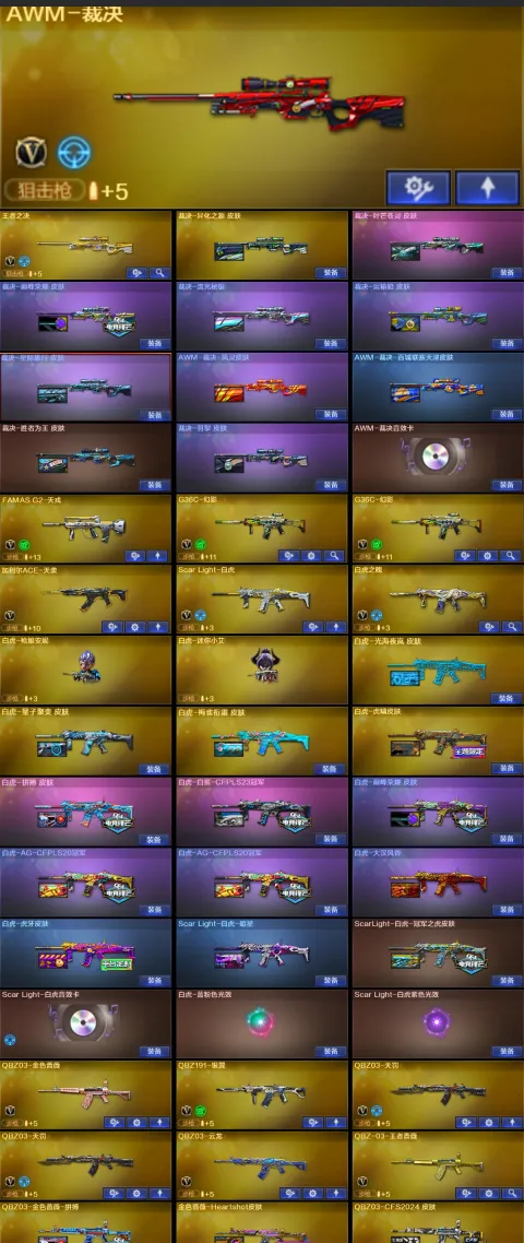 【稀有武器】:传说灵眸/传说幽瞳/传说幽冥/M200-幻神(2)/Kar98K-星神/VSK-94-金蚀/八面凌龙/G36C-幻影(2)/ScarLight-白虎/M14EBR-玄武/M4A1-青龙/HK417-朱雀/QBZ03-天罚(2)/M4A1-幻灵/M4A1-神工天巧/COP357-幻灵(4)/柯尔特-竞技荣光/USP-神工天巧(2)/COP357-云龙(2)/柯尔特-荣耀世冠白鲨2023(3)/柯尔特-无冕之王/荣耀世冠-柯尔特(3)/COP357-雷霆王者-觉醒版(2)/柯尔特-冠军之特/金色蔷薇-古蛇迷踪/QBZ03-云龙/QBZ03-金色蔷薇/AK47-火麒麟/M4A1-黑龙/M4A1-雷神/M4A1-黑骑士(6)/AK47-无影/AK47-黑武士/荣耀世冠-火麒麟/荣耀世冠-雷神/Barrett-毁灭/Barrett-极光/AWM-裁决/M200-竞技荣光/RPK-盘龙(5)/加特林-炼狱(3)/汤姆逊-烈龙(6)/AA-12-雷霆/炽芒蝶刃(2)/幻灵之锋/擎天-竞技荣光/唐刀-神工天巧/云龙扇