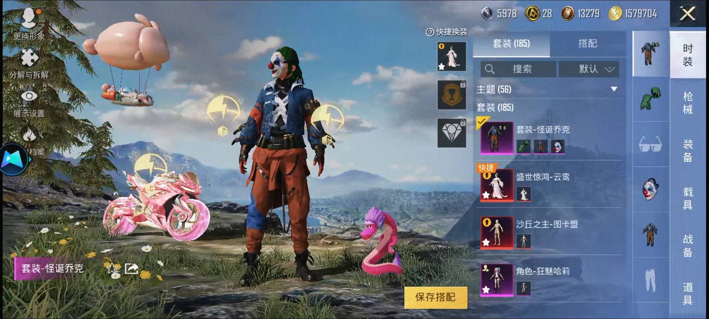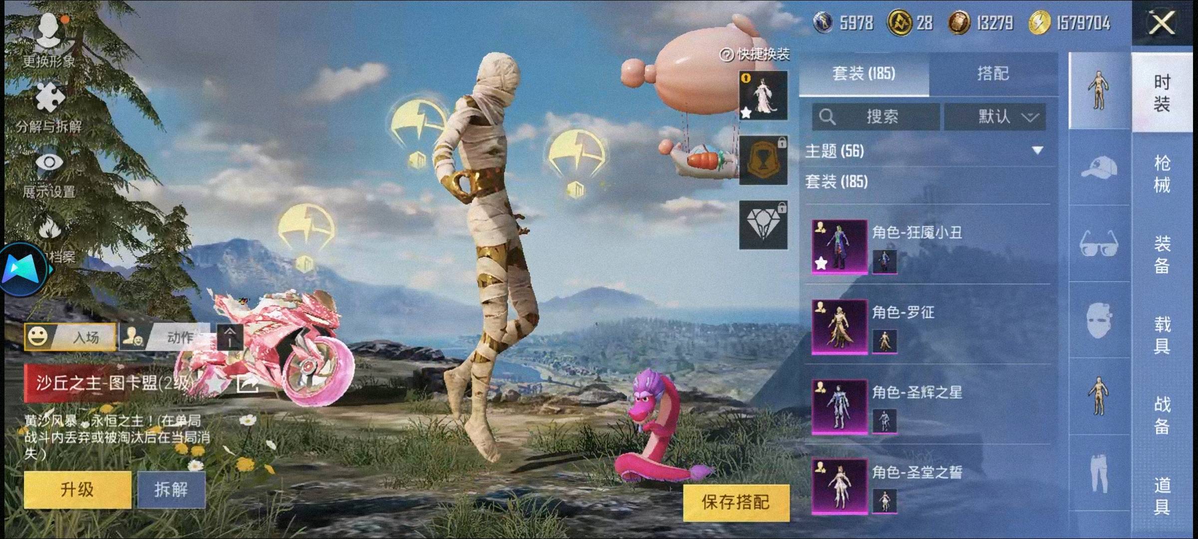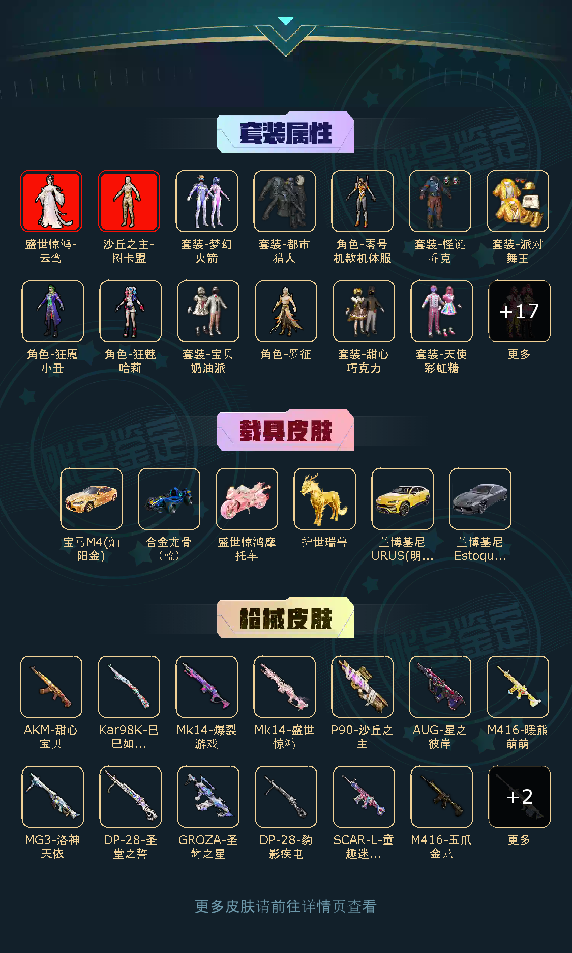 28粉,6载具,185套装,9王牌印记,传奇王牌19星历史最高段,107400热力值 AKM-甜心宝贝/SCAR-L-童趣迷兔/AUG-星之彼岸/GROZA-圣辉之星/M416-暖熊萌萌/M416-五爪金龙/Mk14-盛世惊鸿/Mk14-爆裂游戏/DP-28-圣堂之誓/MG3-洛神天依/P90-沙丘之主/Kar98K-巳巳如意/M24-暗星紫秘/AMR-智耀战神/兰博基尼Estoque(银翼灰)/宝马M4(灿阳金)/兰博基尼URUS(明艳黄)/合金龙骨(蓝)/护世瑞兽/盛世惊鸿摩托车/