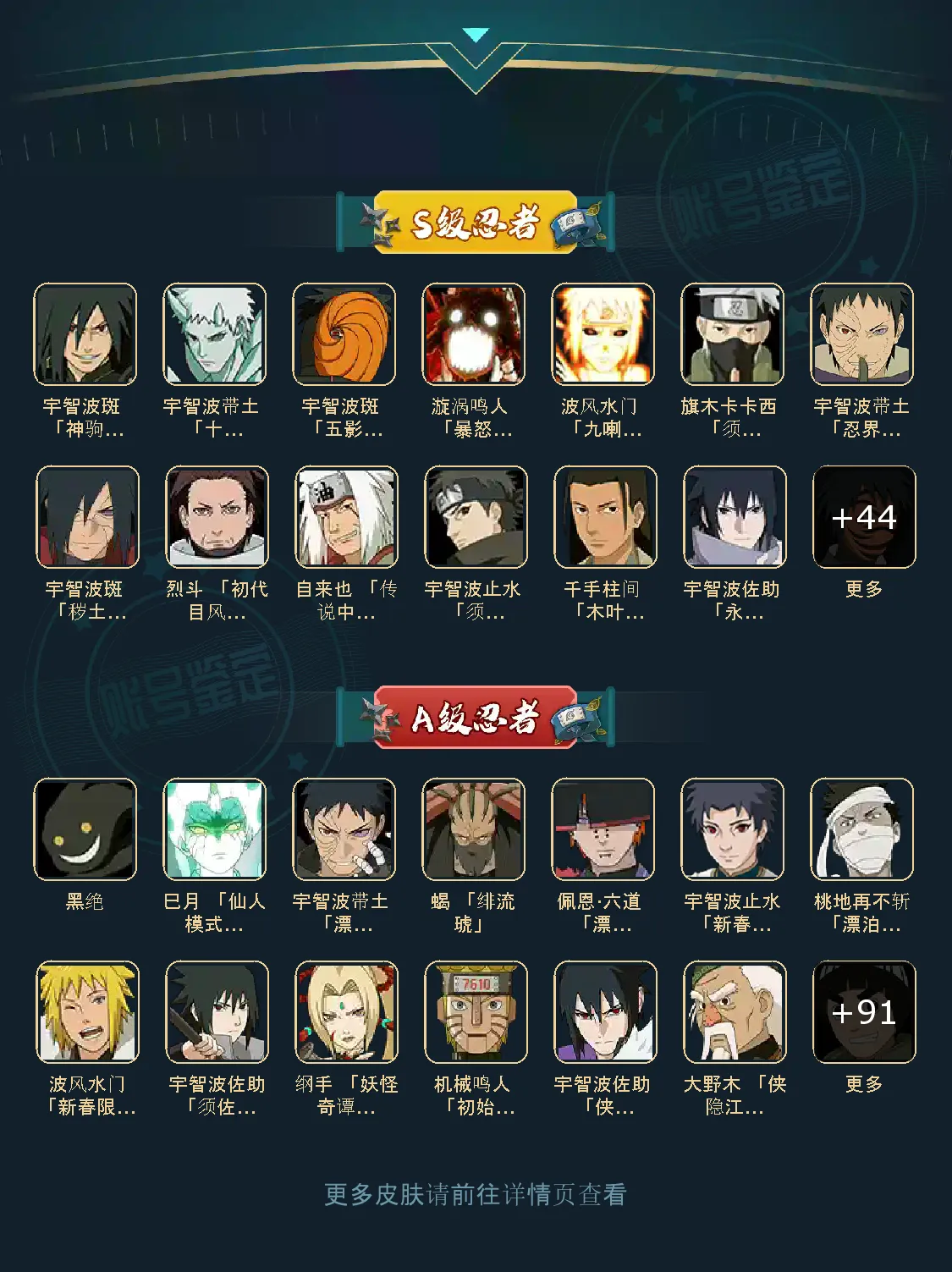 仙人自来也 纲手 波风水门 百战水门 猿飞日斩 千手柱间 宇智波斑 宇智波鼬 舞之自来也 大蛇丸 百战大蛇 秽土四代 秽土三代 秽土长门 仙人兜 黄猿九喇嘛鸣人 紫狗永恒佐助 樱婊忍战樱 秽土鼬 普通自来也 百豪纲手 死门凯 二代扉间 秽土二代 秽土初代 秽土柱间 白面具 须佐卡卡西 小胡子鬼灯幻月 雷影 土影 无 佩恩 百战佩恩 青年柱间 创立初代 秽土斑 青年斑 解斑 须佐止水 虎皮 破面带土 红夜带土 罗砂 秽土三代风影 忍战雷影 三代雷影 金角银角 秽土半藏 忍战大野木 小土豆 天道超 大筒木桃式 大筒木金式 钢铁之躯凯 桀骜之刃阿斯玛 狂野之鲨鬼鲛 飞段 黑飞段 百豪樱 忍战李 大卡卡西 五代水影照美冥 宇智波鼬 仙鸣 九尾查克拉鸣人 鹰佐 奇拉比 青年艾 半蛇兜 晓蛇 新春鼬 面麻 须佐佐助 疾风咒印佐助 忍战宁次 忍战天天 最终章雏田 幻容卡卡西 神卡 忍战卡卡西 泳装卡卡西 忍战凯 青春哥 惊门凯 爱情哥 新春止水 新春水门 青年水门 青水 新春我爱罗 泳装照美冥 侠隐照美冥 侠隐纲手 侠隐兜 漂泊再不斩 漂泊佩恩 漂泊二代 漂泊小南 漂泊佩恩 三船 青年三船 青年长门 泳装南 新春南 黑绝 新春大蛇丸 晓创生角度 晓创生蝎 晓创生飞段 泳装鼬 鲛肌融合鬼鲛 新春迪达拉 秽土迪达拉 恶灵之影飞段 暴怒带土 忍战黄土 卑留呼 桃博 黑土