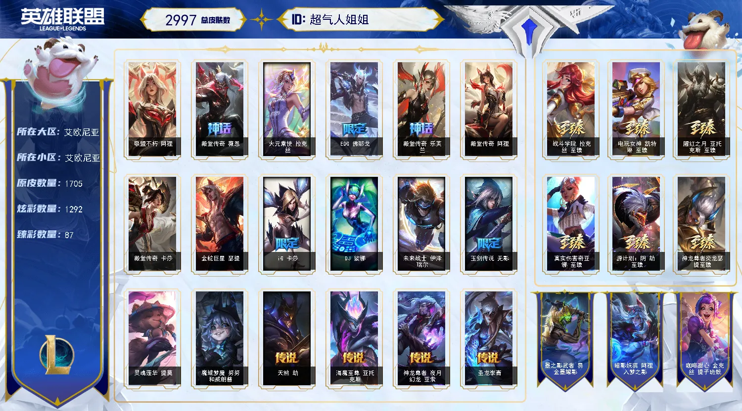 全皮肤清空商城-1700原皮上千炫彩-晴天-艾欧尼亚铂金-不朽阿狸-136神话-86臻彩畅玩!!!