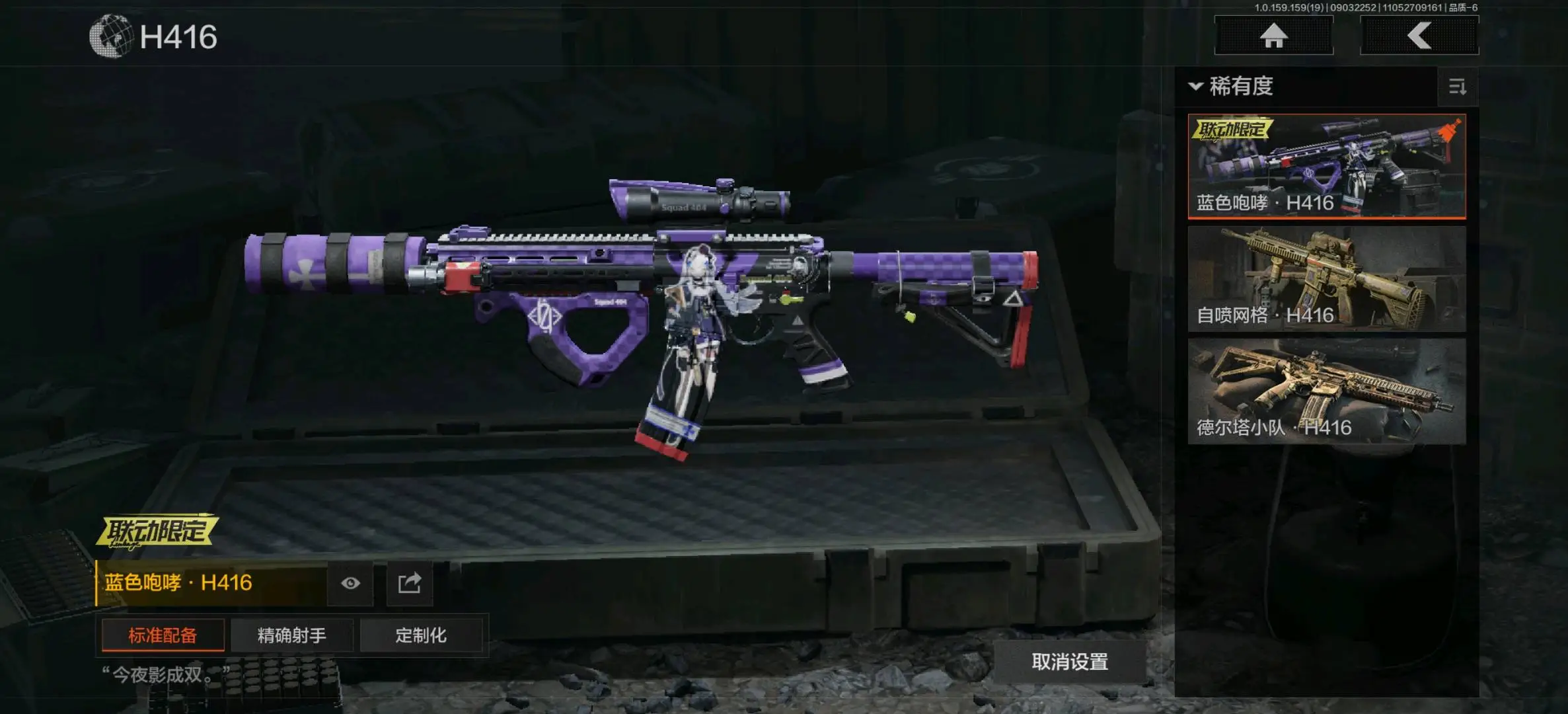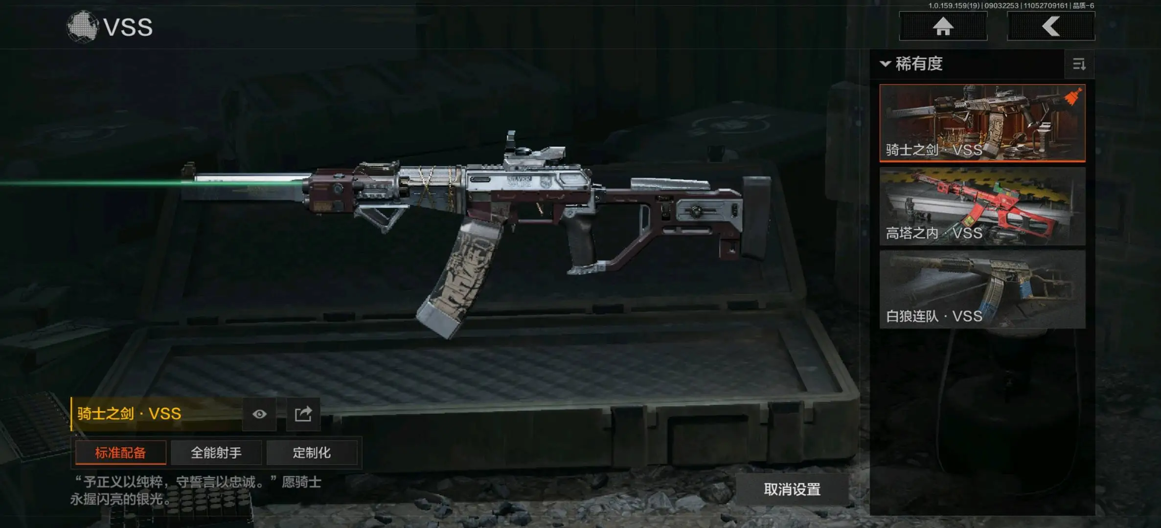冲锋枪:掌中盾MP5,玄戈梨花MPX,高塔之内P90,灰鼠幻歌P90,神锋Vector45,恶念Vector9;射手步枪:骑士之剑VSS,棱光裂变QBU191,高塔之内VSS,白狼连队VSS,骑士之剑MK14,竞技M110,午夜梦魇M110