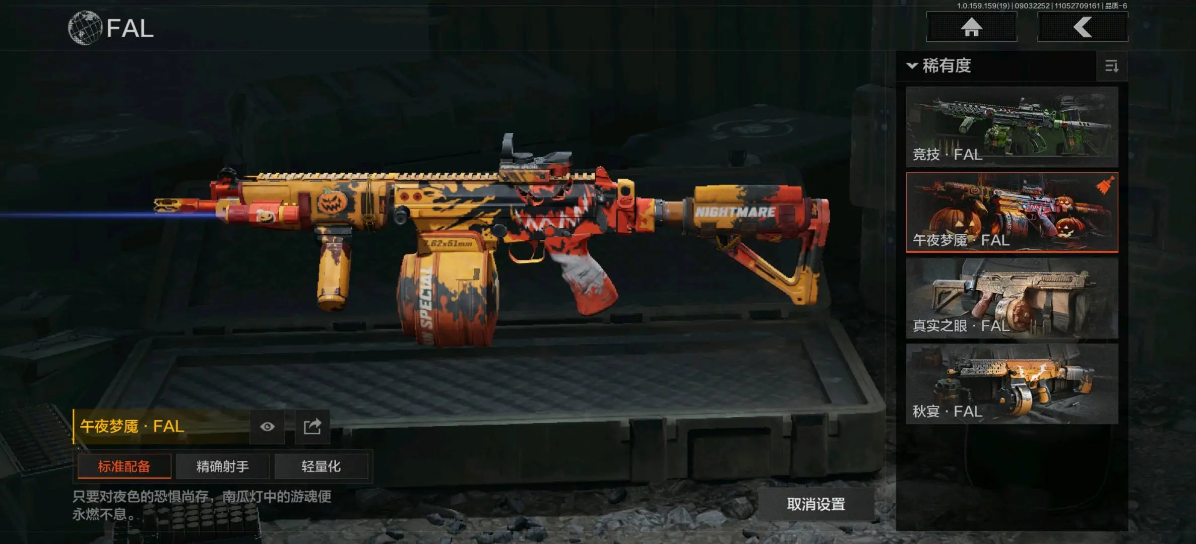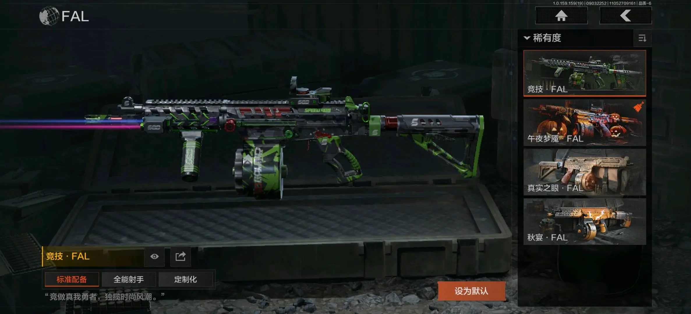 突击步枪:竞技FAL,午夜梦魇FAL,蓝色咆哮H416,旗帜AEK,棱光裂变AKM,竞技M4A1,北国内卫MDR,逆火MDR,自喷网格H416,德尔塔小队H416,棱光裂变AK102,火力倾泻AUG,竞技AUG,极恶AUG,棱光裂变AK74N,来战AK74N,山地伪装AK74N,莫克斯AKS74U,骑士之剑AKS74U,最后防线AKS74U,赢家F2000,炎夏浪花AR57,涂绘猎人AR57,战术大师ACE31,骑士之剑ACE31,暴虐AEK,北国内卫AN94,百锻寒芒T951,百锻寒芒T03,缟兵玄墨T03,林地数码T03,07式林地迷彩QBZ191;