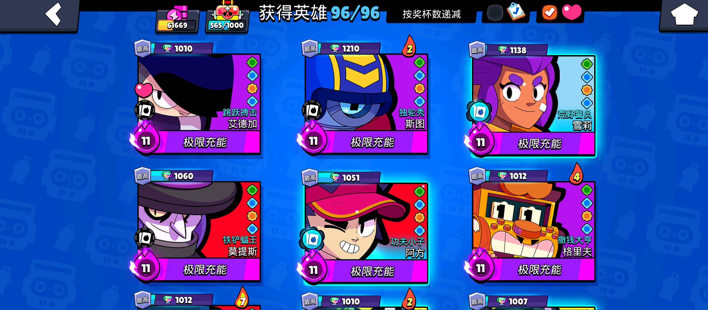 【安卓】 荒野乱斗/黄叶绿豆/96英雄/96满级/62极限充能/61669杯/382皮肤