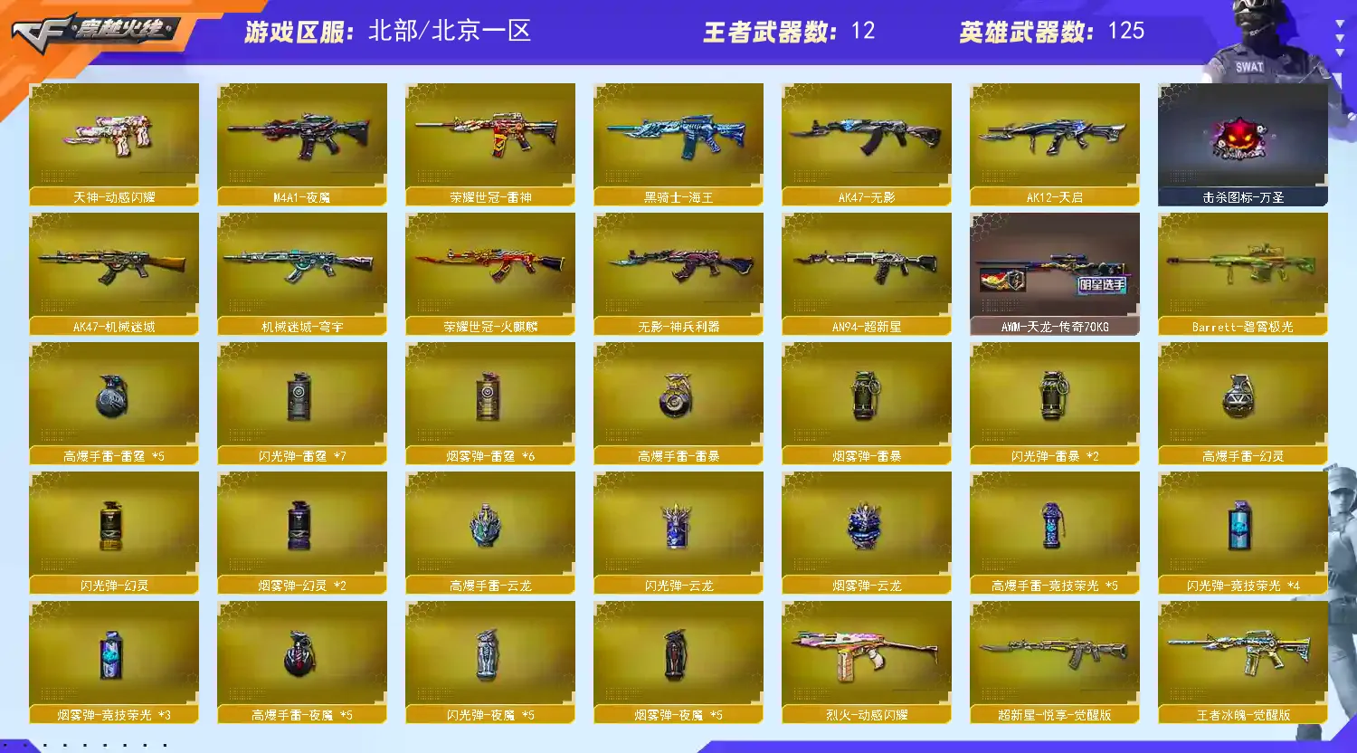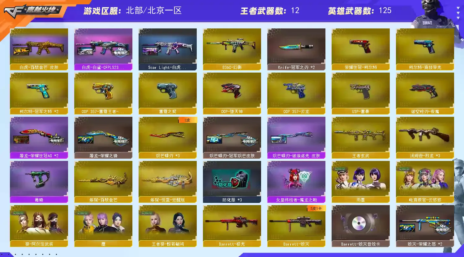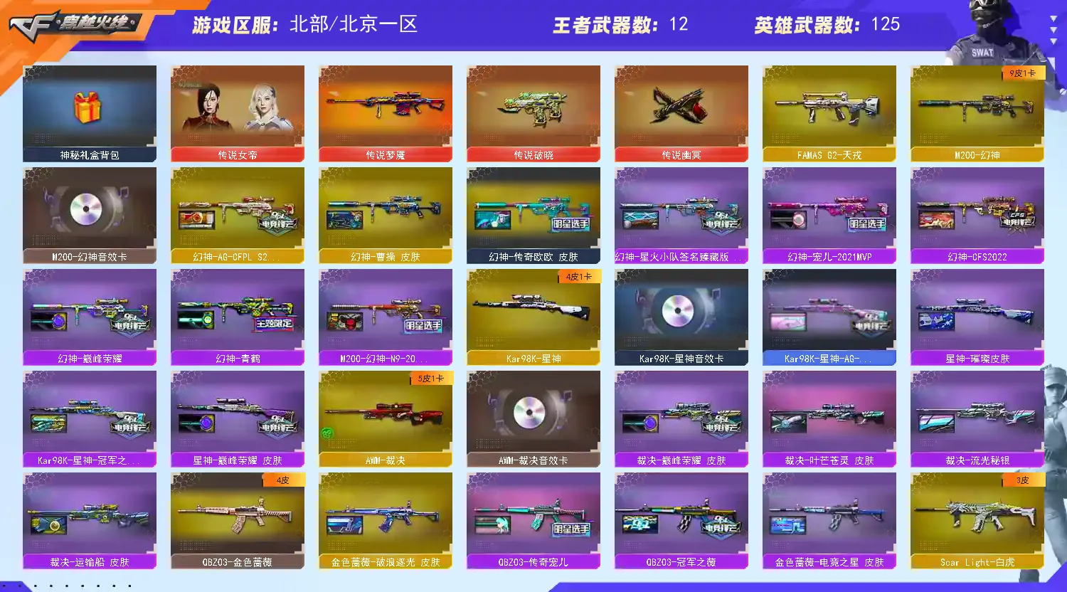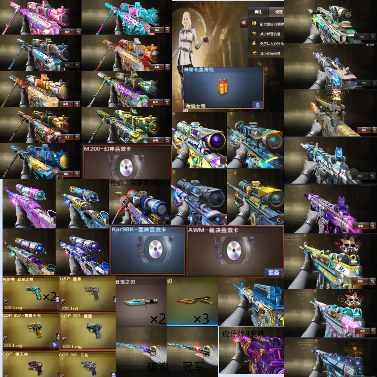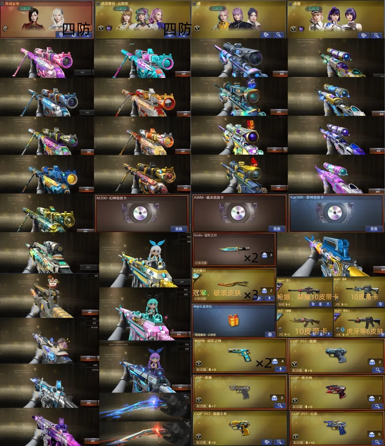 女帝金名&幻神10皮音效、裁决4皮音效&星神4皮音效、步枪大满配&手枪齐全、3蝴蝶刀&双冠军小刀