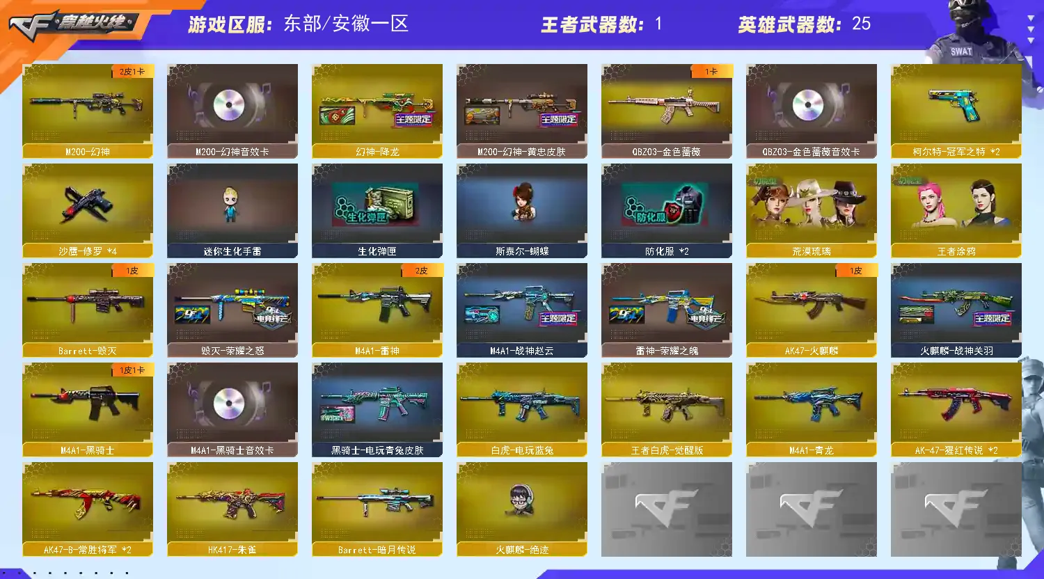 【亮点解析 幻神三件套 】【m200幻神+音效卡+降龙+黄忠+冠军之特*2】【王者白虎】【qbz金色蔷薇+卡】【hk417朱雀】【火麒麟】【雷神+荣耀之魄】【黑骑士+卡】【毁灭+荣耀之怒】 【武器:青龙 白虎电玩 】 【6手呛:修罗*4 冠军之特*2】 【5刀具:屠龙 龙啸 擎天 麒麟刺*2】 【雷套:】 【小人呛:朱雀蛇隐宗 火麒麟绝迹 斯太尔蝴蝶 】 【音效卡:黑骑士音效卡 幻神音效卡 金色蔷薇音效卡 】 【角色:荒漠琉璃 王者涂鸦 】