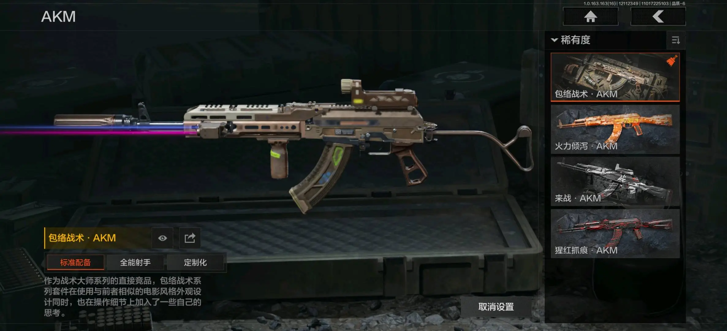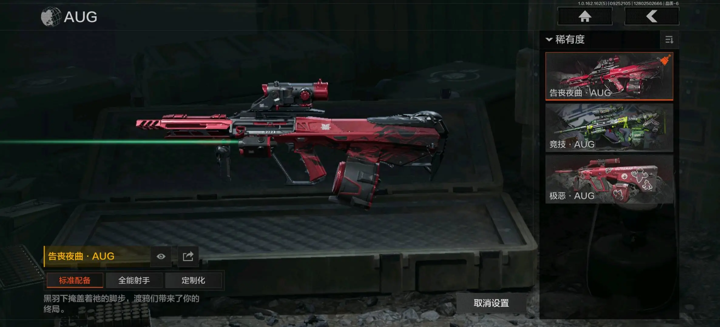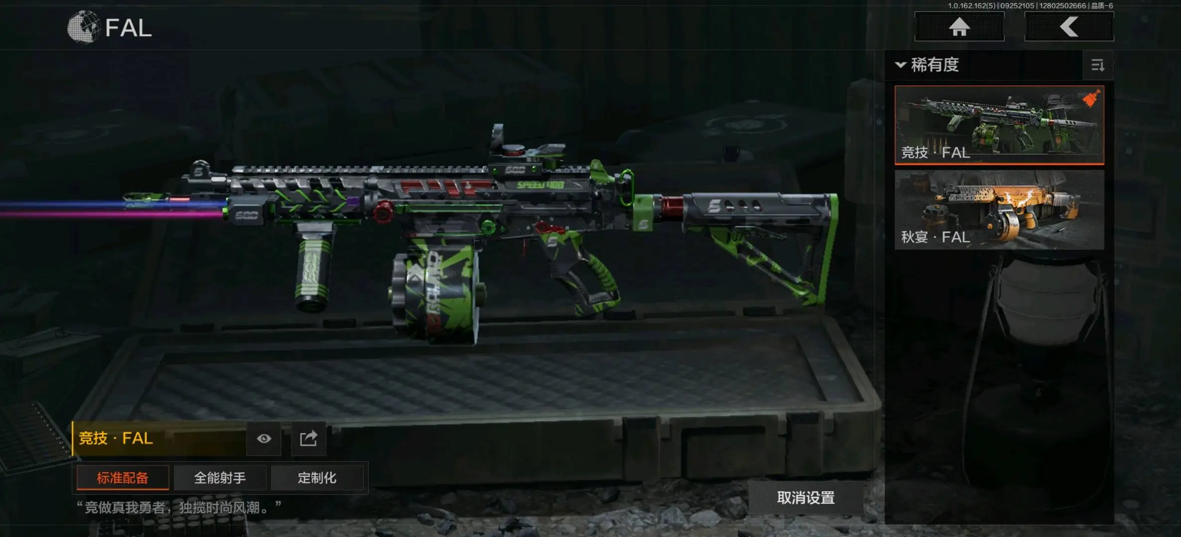 竞技FAL,告丧夜曲AUG,旗帜AEK,棱光裂变AKM,来战AKM,骤羽尖啸M4A1,德尔塔小队M4A1,炎夏浪花H416,自喷网格H416,竞技MDR,北国内卫MDR,棱光裂变AK102,竞技AUG,极恶AUG,棱光裂变AK74N,来战AK74N,骑士之剑AKS74U,最后防线AEK,炎夏浪花AR57,涂绘猎人AR57,棱光裂变ACE31,骑士之剑ACE31,湖冰倒影ACE31,北国内卫AN94,阴影AN94,彻甲铜斑T951,玄戈梨花T03,彻甲铜斑T03,林地数码T03,骤羽尖啸AK12,07式林地迷彩QBZ191;