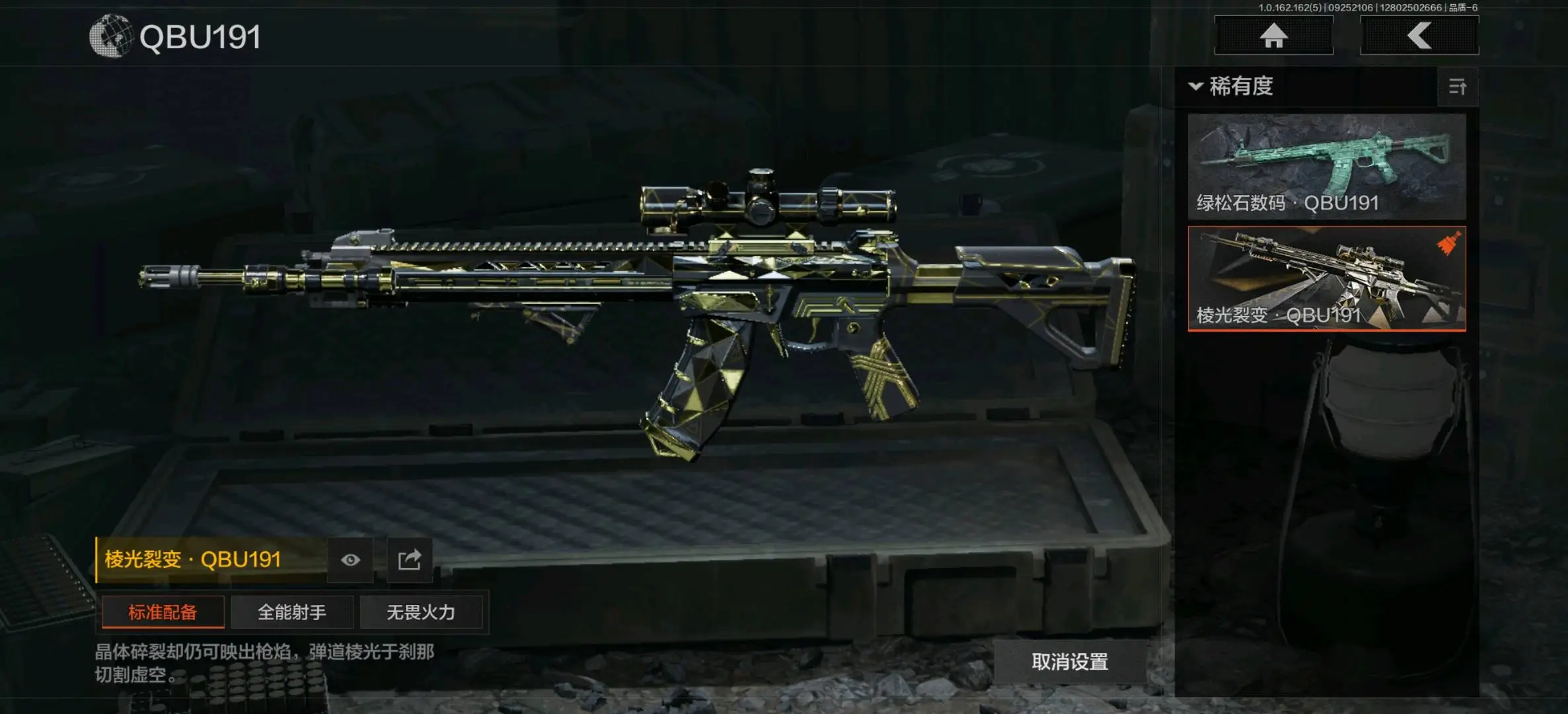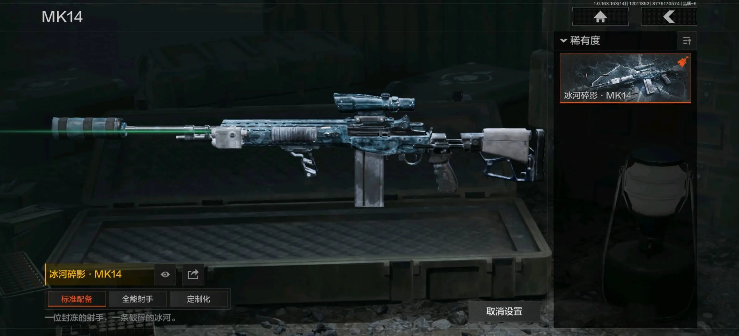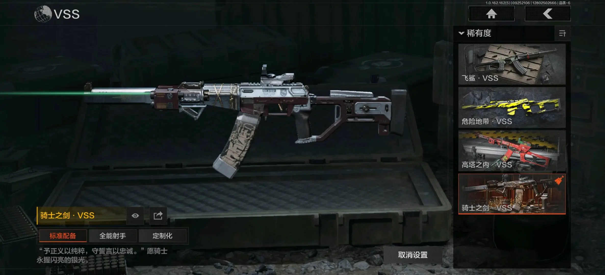 骑士之剑VSS,冰河碎影MK14,棱光裂变QBU191,高塔之内VSS,缟兵玄墨M110,全地形数码M110;