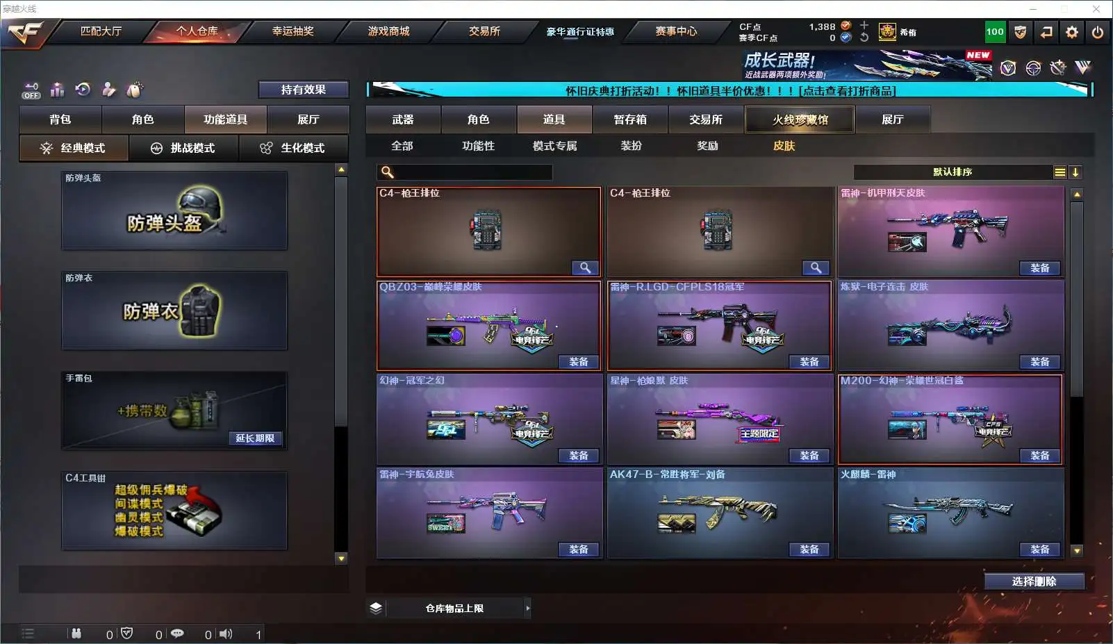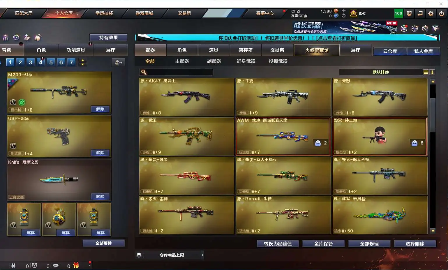 【幻神双皮三件套!!!】 【m200幻神+幻神音效卡+冠军之幻皮肤+荣耀世冠白鲨皮肤+usp雷暴+冠军之刃+4防云悠悠】【竞技荣光套装】 【王者风神】【qbz金色蔷薇+巅峰荣耀皮肤】 【王者芳薇】 【荣耀世冠雷神】 【雷神+cfpls18冠军皮肤】 【黑骑士+s4典藏皮肤】 【超新星 青龙 战士 战神 身先士卒 常胜将军 极光】——【usp雷暴 cop357幻灵 柯尔特竞技荣光 沙鹰修罗】——【屠龙 擎天竞技荣光 雷霆王者之锋 龙啸烈火龙威】——【幻灵投掷武器套装 竞技荣光投掷武器套装 雷霆王者投掷武器套装】——【热门武器/小人呛】【毁灭孙三炮 awm灵狐15周年嘉年华】——【角色】【4防(云悠悠 隼 王者春 王者潘多拉)】