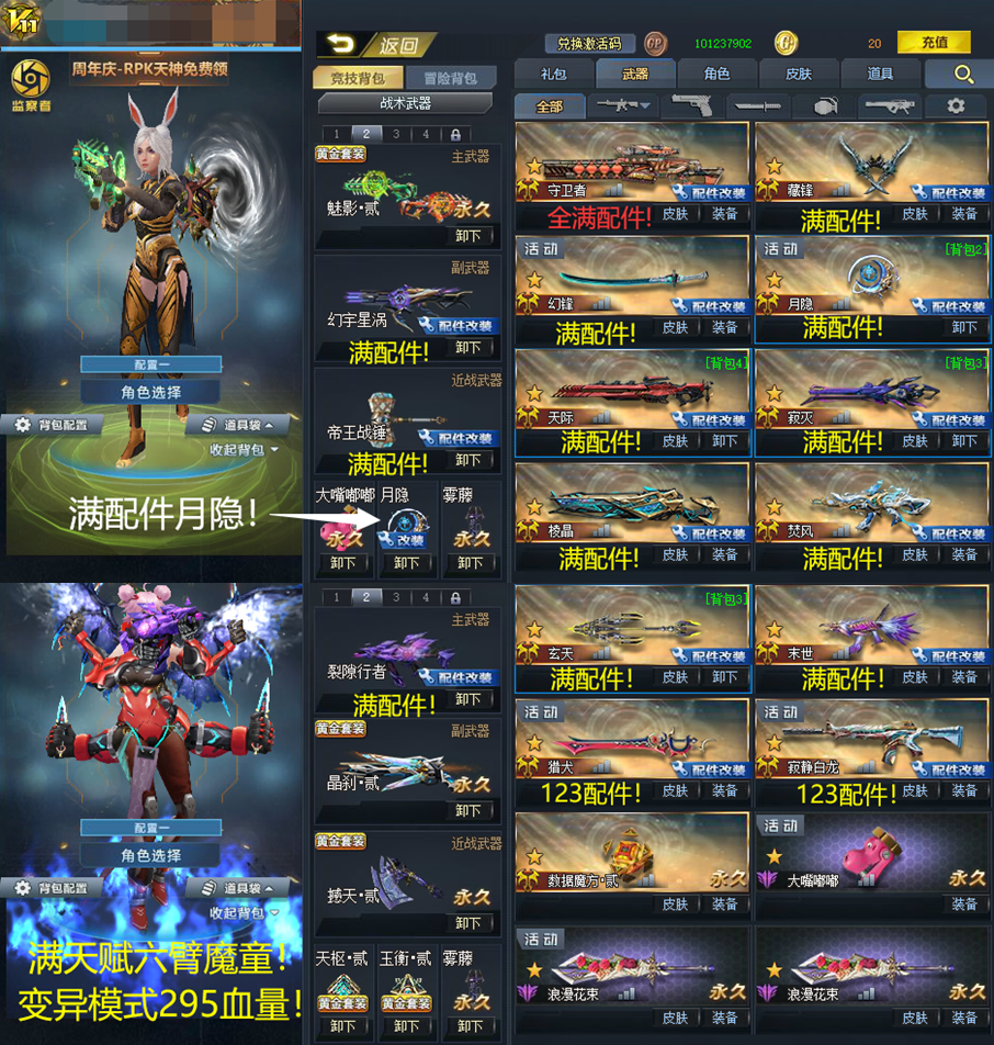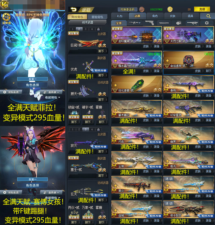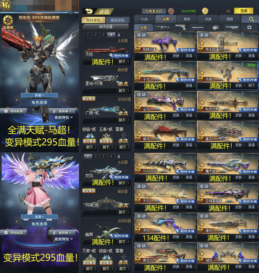 满配件武器:【全满守卫者】!奏鸣!藤木蔓芯!幻宇星涡!闪击!幽冥!尘埃!弧光!黑炎!连城!核子裂变!裂隙行者!帝王战锤!子龙!伏虎!尘羽!轮回之刺!蛮牙!盖亚!赛傅!摩羯座!天引!空间掌握者!134灵狩!獠牙!原石之怒!翎羽!藏锋!幻锋!月隐!天际!寂灭!棱晶!焚风!玄天!模式!123白龙!123猎犬…