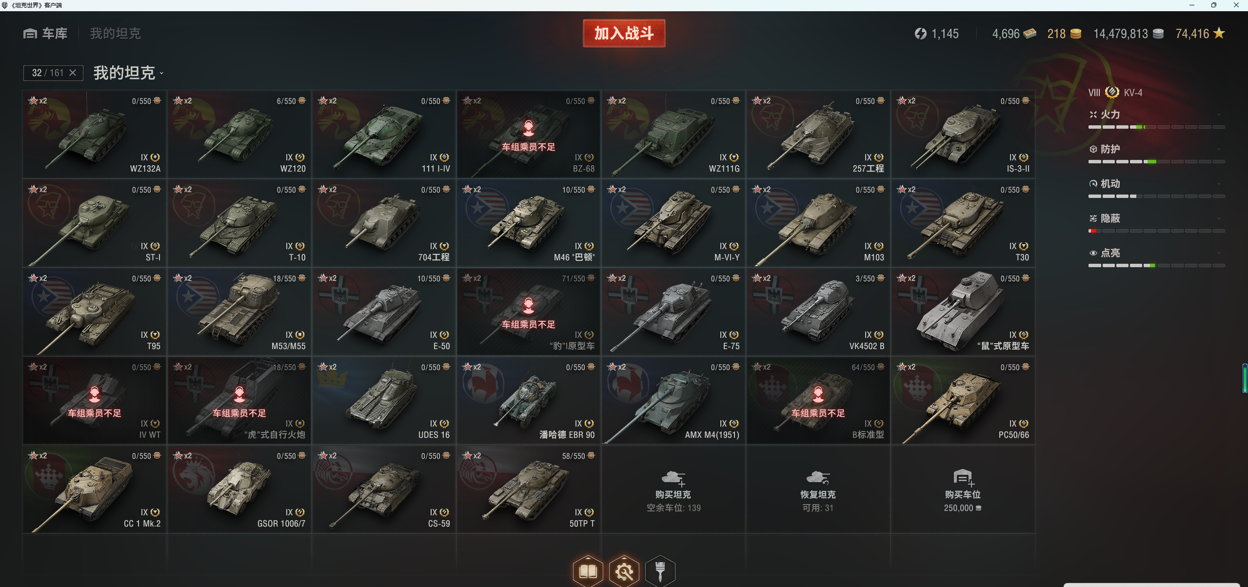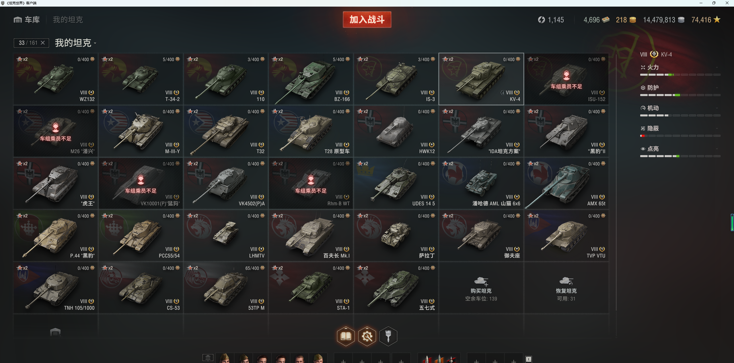 注意事项:1,进入游戏后,如果车辆情况不符。那是因为前面的玩家筛选了自己玩的坦克,其他的隐藏了。坦克显示栏,左下角小坦克标志,点进去把所有系别和级别选上,坦克就全部出来了。