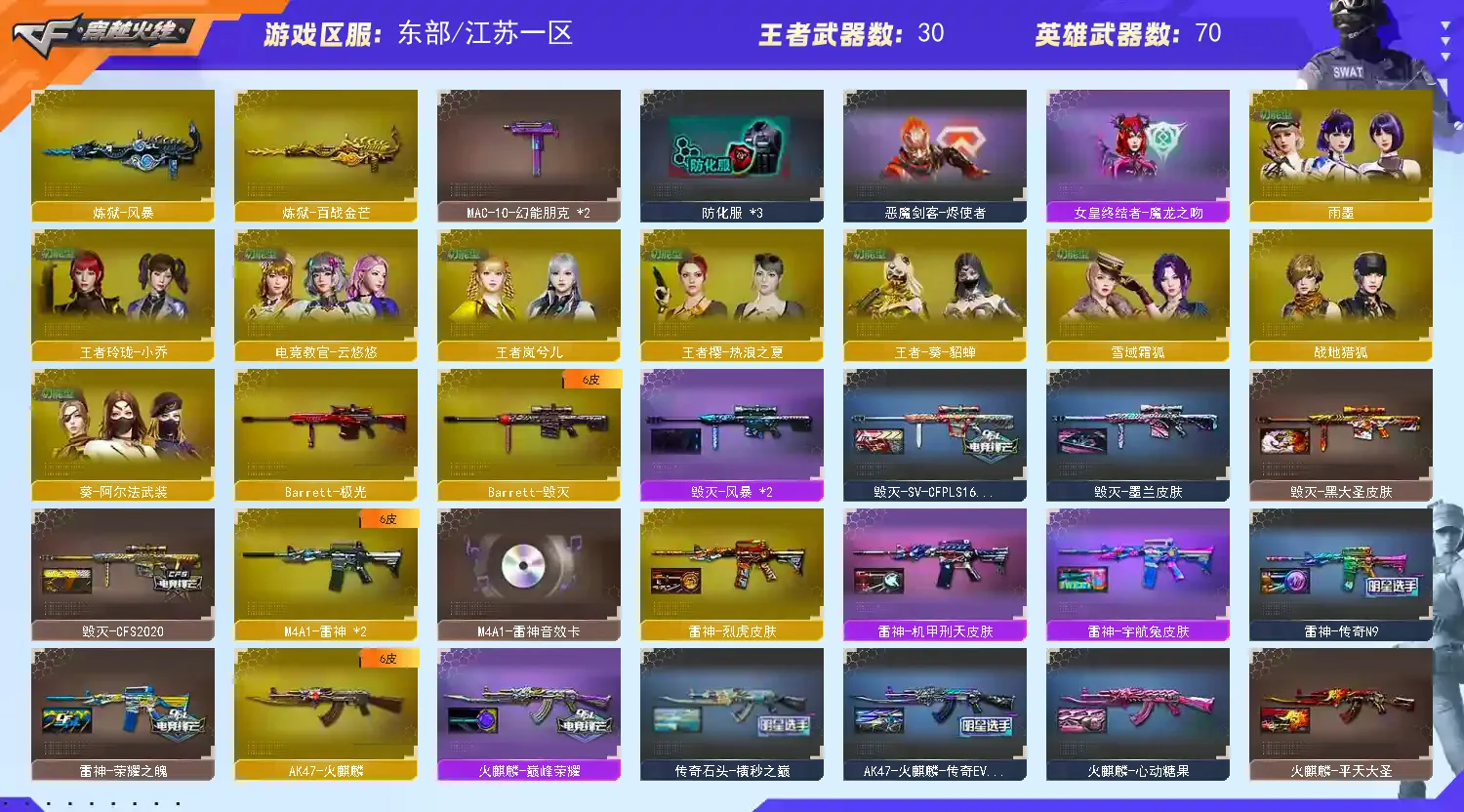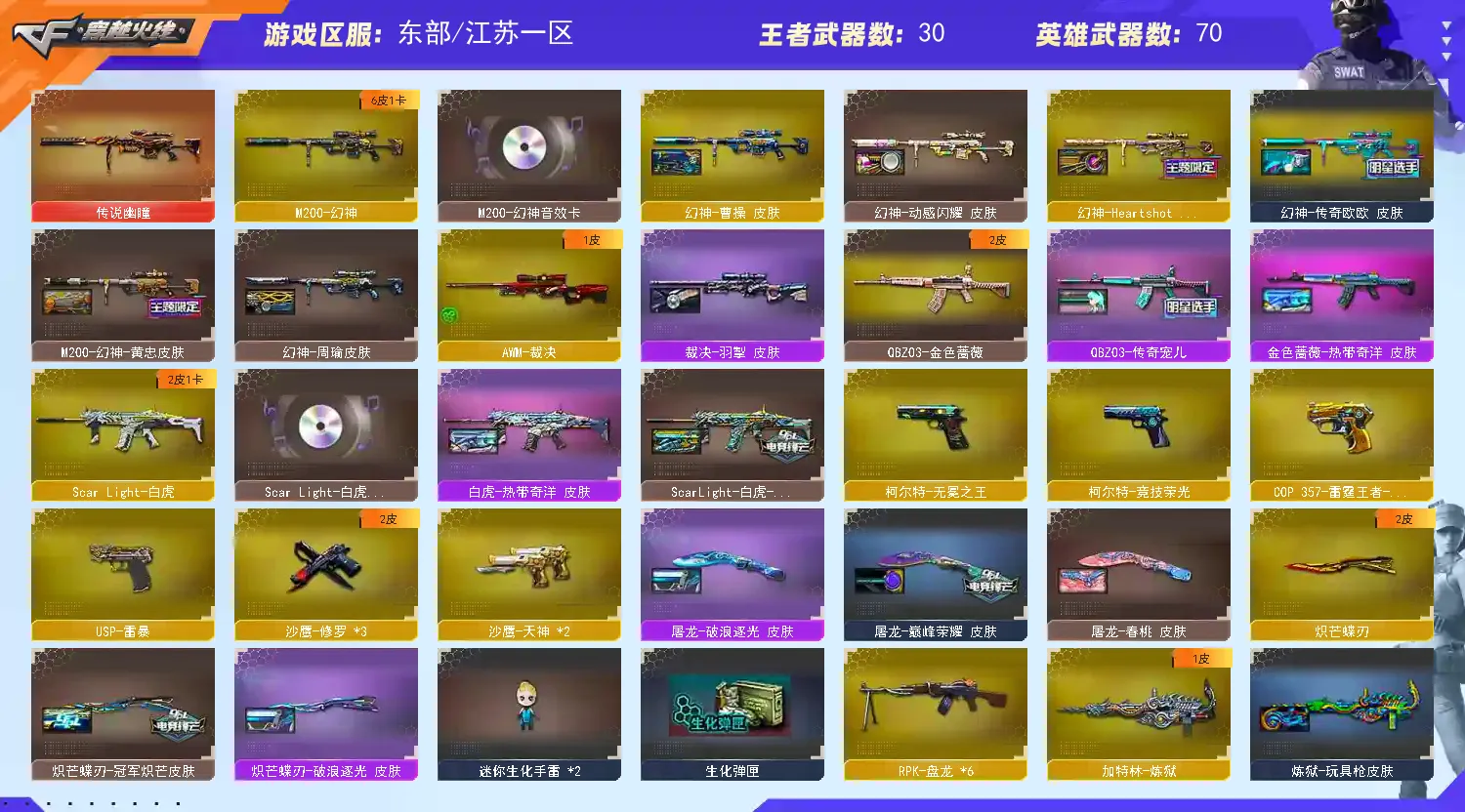 【亮点解析 幻神三件套】 【传说幽瞳】 【M200-幻神+音效卡+幻神-传奇欧欧+heartshot+曹操+幻神-黄忠+幻神-周瑜+动感闪耀】 【竞技荣光套+四防云悠悠+usp雷暴】 【ScarLight-白虎+冠军之虎】 【QBZ03-金色蔷薇+音效卡】 【生化 6盘龙】 【裁决】 【毁灭】 【极光】 【火麒麟+巅峰荣耀+火麒麟-横秒之巅+火麒麟-even+火麒麟-冠军之心】 【雷神+音效卡+heartshot】 【黑骑士+音效卡】 【黑武士 超新星+白马银枪】 【11手枪 修罗*3 天神*2 usp雷暴 柯尔特无冕之王 cop雷霆王者】 【16近战 屠龙*2 擎天 麒麟刺 幻灵之锋 炽芒蝶刃蝴蝶刀+冠军炽芒 王者之啸*2 王者之击】 【手雷 雷霆王者*2】 【四防 王者葵貂蝉 王者玲珑小乔 王者岚兮儿】