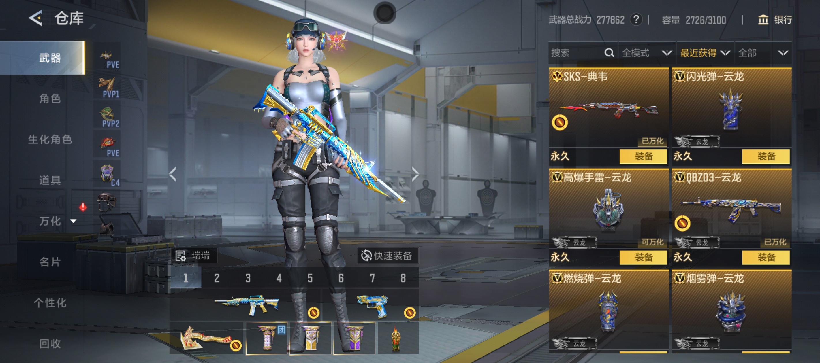 聚变脉冲、魔礼寿、12把COP、-魔鲲、帝皇铠甲、VSK-94-金蚀、巴雷特-朱雀、M4A1-青龙、AK47-轮回、M4A1-神工天巧、98K-星神、81式-光明之神、MK47-云舞、葫芦娃全套、七色宝葫、MK47—机械纪元、龙吟惊沧海、SKS—美杜莎、81式-机械纪元、AWM—天龙—曼陀罗、AK47—无影—葵、M4A1-游骑兵-香香等等