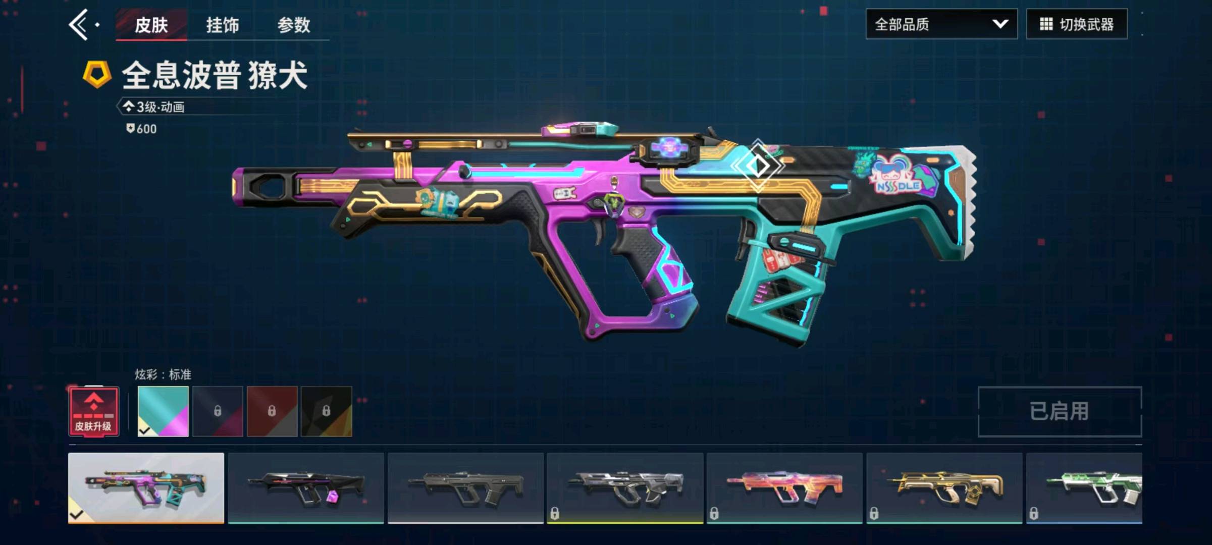 獠犬-全息波普,狂徒-盖亚的复仇,幻影-侦察力量,戍卫-天界神兵,飞将-天界神兵,鬼魅-天界神兵,蜂刺-天界神兵,狂徒-源晶工程,獠犬-源晶工程,冥驹-源晶工程,正义-源晶工程,鬼魅-异彩晶棱,戍卫-本色混搭,飞将-质感轻奢,正义-激流先锋,鬼魅-本色混搭,短炮-质感轻奢,狂怒-质感轻奢,判官-本色混搭,雄鹿-质感轻奢,战神-本色混搭;
