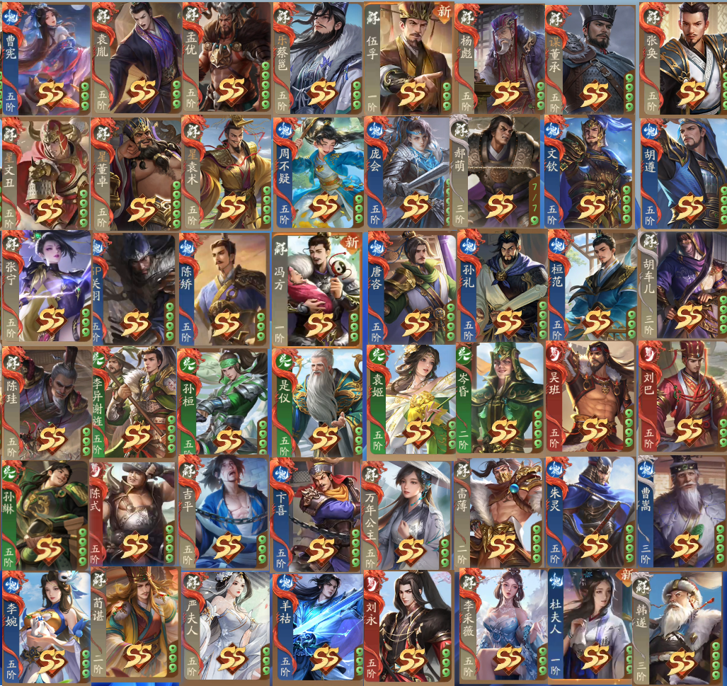 威曹丕,威孙权,庞凤衣,孙翎鸾,谋周瑜,神张飞,神姜维,神张角,神华佗,神马超,神钟会,周宣,马伶俐,笮融,薛灵**,乐蔡文姬,曹金玉特效动,朱建平,徐荣,关锁,关宁,刘烨,张璇,许邵,杜夔,骆统,管宁,芮姬,曹宪,袁胤,孟优,五伏,乐蔡爹等等