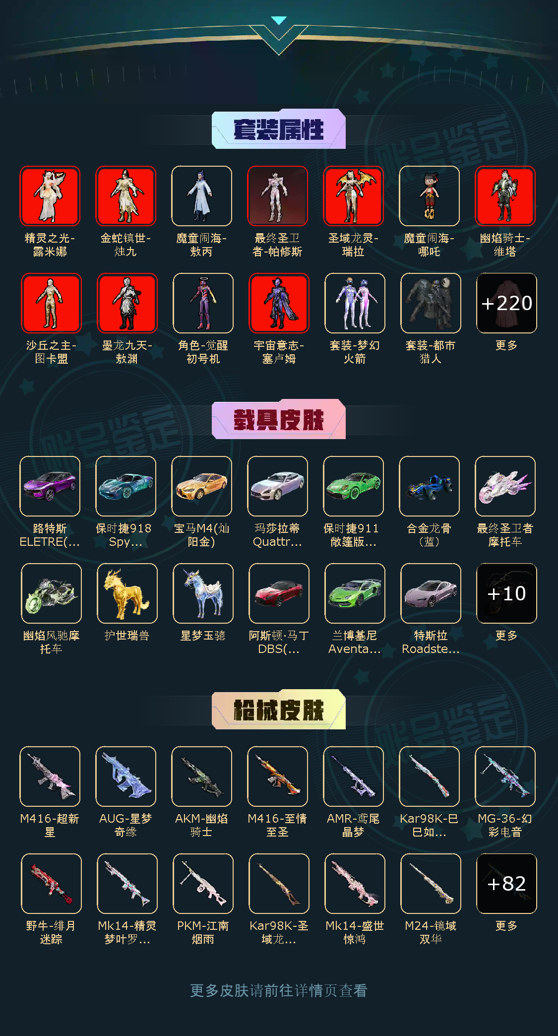 222粉,24载具,796套装,22王牌印记,绝世王牌23星历史最高段,505442热力值 平底锅-仲夏莫吉托/平底锅-林间仙鹿/撬棍-永恒法杖/镰刀-幽影之判/AKM-盖世英雄/M416-灵猫魔法师/AKM-甜心宝贝/SCAR-L-梦幻火箭/SCAR-L-童趣迷兔/AUG-星梦奇缘/M416-风花雪月/AUG-星之彼岸/M762-激战未来/GROZA-香水柠檬/AKM-幽焰骑士/M416-心之恋语/SCAR-L-纯梦嫁纱/GROZA-超新星/M416-五爪金龙/AKM-魔法神域/M16A4-垂柳戏鸭/AKM-炫紫旋律/GROZA-精灵之光/M416-墨龙九天/GROZA-焦糖拿铁/M762-冷魅冰骑/AKM-百合蜜语/M416-至情至圣/SCAR-L-金蛇镇世/AUG-妙趣可丽/M762-甜蜜誓约/M416-超新星/SCAR-L-万古烈焰/蜜獾-辉耀战甲/AKM-梦之光华/SCAR-L-魔童闹海 哪吒/SPAS-12-音爆索尼克/S12K-海渊国主/M417-第五大道/Mk14-盛世惊鸿/SKS-诡面斩/Mk14-精灵梦叶罗丽/Mk14-闲梦青缨/Mini14-荧光虫舞/VSS-烈焰拳霸/DP-28-暗夜鎏金/DP-28-扶摇飞仙/M249-彩虹甜喵/MG3-辉羽雀灵/PKM-天星战神/DP-28-圣堂之誓/MG3-洛神天依/M249-古战神甲/MG-36-幻彩电音/PKM-江南烟雨/M249-绒雪飘舞/DP-28-千金淑猫/DP-28-豹影疾电/UZI-绮梦青鸾/汤姆逊-怪笑疯兔/Vector-红伞翩翩/P90-甜蜜草莓/野牛-绯月迷踪/UMP45-宇宙意志/汤姆逊-荒漠赏金/AKS-74U-信仰神谕/AKS-74U-星穹咏叹调/Vector-环太平洋/Vector-最终圣卫者/UMP45-恐龙拽拽/P90-沙丘之主/UMP45-玉魂晶魄/P90-魔童闹海 敖丙/JS9-奇迹舞步/破片手榴弹-瓶中星球/爆炸猎弓-雪梅暗香/破片手榴弹-美味星星糖/破片手榴弹-秋玉花灯/爆炸猎弓-拳皇·狂花道/烟雾弹-猫咪绅士/破片手榴弹-粉粉猫爪/Kar98K-伏魔团/Kar98K-圣域龙灵/AWM-焰龙焚天/AMR-鸢尾晶梦/Kar98K-巳巳如意/AWM-橘柚倾心/M24-镜域双华/AMR-炫光之旅/M24-暗星紫秘/Kar98K-未来歌姬/AMR-智耀战神/M200-梦海之灵/M24-星之信仰/M24-莲影清波/特斯拉Roadster(沁心粉)/阿斯顿·马丁DBS(红)/宝马M4(灿阳金)/玛莎拉蒂Quattroporte(幻星粉)/保时捷911 敞篷版(小暴龙)/路特斯ELETRE(电光紫)/保时捷Taycan 旅行版(冰莓粉)/鬼马风驰/快艇-塞莎KL27(霓虹粉)/合金龙骨(蓝)/糖心拉力赛车(波动紫)/保时捷918 Spyder(玺耀绿)/兰博基尼Aventador(翡翠绿)/仰望U9(赤霞丹朱)/冰绡玉鳞/护世瑞兽/星梦玉骢/关羽赤兔马/赵云玉狮子马/照夜玉狮子/疾风龙骑/辉羽雀灵自行车/最终圣卫者摩托车/幽焰风驰摩托车/踏焰逐风摩托车/