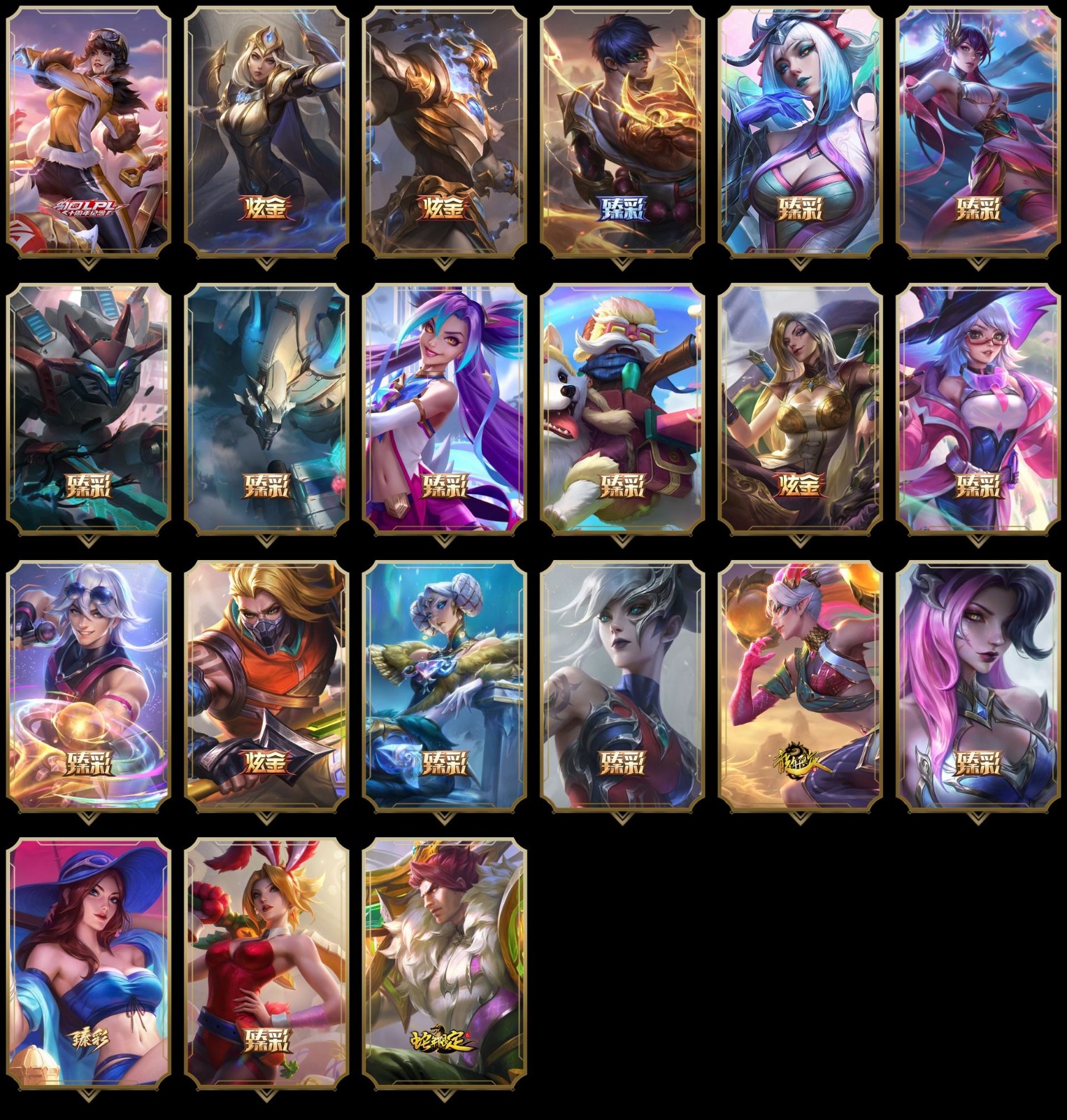 【重要炫彩】无畏骑士瑟庄妮赤子初心 冠军之箭艾希凯旋圣装 冠军典狱长锤石凯旋圣装 神龙尊者圣龙李青龙腾云起 净雪之月莫甘娜冬虹 玉剑传说舞剑仙承影 霸天战士雷恩加尔星啸天火 霸天巨兽雪崩墨菲特 星之守护者金克丝黑洞 玉剑传说风仙子丹凤 奥德赛金克丝恒星游历者 山海绘卷妮蔻湘妃 腥红之月卡特琳娜落樱 源代码乐芙兰梦幻闪击 泳池派对塔莉垭海豚剧院 腥红之月易落樱 暗星萨科美神星之灭 可爱可爱粉红红提莫 图奇影足梦境勇者 禁军统帅赵云 霸天龙神奥瑞利安索尔华天 这货不是银狐库奇 破败军团德莱文灵岛征伐使 最后一只恐龙纳尔浪漫粉晶龙 泳池派对雷克塞水晶粉鲨 激萌鳄霸雷克顿 泳池派对璐璐笨笨暹罗猫 泳池派对璐璐坏坏鹰嘴鱼 泳池派对璐璐黄金章鱼 勇者阿狸炫金 闭月之颜貂蝉炫金莲华 幻灵战斗兔阿萝拉梦幻强袭 冲击之刃劫风魔上忍 生化魔人扎克草莓软糖魔人 黑色荆棘莫甘娜马樱丹 泳池派对塔里克我正在游过来 光明哨兵薇恩都市抗击者 心之钢伊泽瑞尔天纵才华 墨之影武者亚索金墨耀影 北极星钢影卡蜜尔智慧纽带 魔女阿卡丽虚荣 天龙之子卡莎飞龙乘云 魔女阿狸饕餮 泳池派对凯特琳蓝柑玛格丽特 红莲之刃锐雯 剪纸仙灵嘉文四世日进斗金