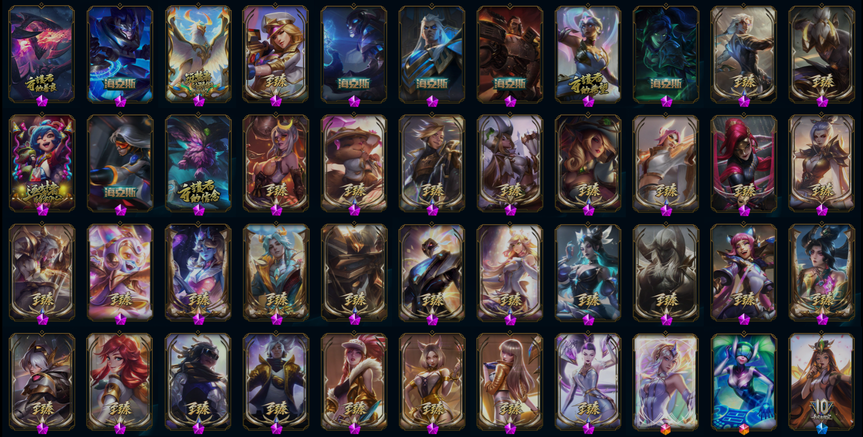 【重要皮肤】剪纸仙灵卡西奥佩娅至臻 黑色玫瑰假面舞会卡特琳娜至臻 天龙之子伊泽瑞尔至臻 太空律动魔音海妖娜美至臻 星之守护者辛德拉至臻 幻灵战斗猫金克丝至臻 魅惑女巫莫甘娜至臻 女帝黛安娜至臻 太空律动璐璐至臻 真实伤害亚索至臻 真实伤害赛娜至臻 星之守护者索拉卡至臻 灵魂莲华提莫至臻 灵能特工伊泽瑞尔至臻 福牛守护者菲奥娜至臻 王国机神玄武盖伦至臻 黑夜使者凯隐至臻 KDA二代卡莎至臻 KDA一代卡莎至臻 KDA阿狸至臻 KDA阿狸2022至臻 KDA阿卡丽至臻 战斗学院拉克丝至臻 烈焰美人薇恩至臻 电玩女神凯特琳至臻 电玩女神凯特琳2022至臻 魅惑女巫厄运小姐至臻 源计划正义艾瑞莉娅至臻 源计划正义艾瑞莉娅2022至臻 玉剑传说武剑仙至臻 玉剑传说武剑仙2022至臻 腥红之月亚托克斯至臻 腥红之月亚托克斯2022至臻 未来战士锤石至臻 黑夜使者李青至臻 黑夜使者李青2022至臻 海克斯科技安妮 海克斯科技斯维因 海克斯科技玛尔扎哈 海克斯科技波比 海克斯科技嘉文四世 永恒之森奥恩 暗星科加斯 黎明使者卡尔玛 恐惧新星德莱厄斯 摄魂使者薇恩 新创战纪希维尔 胜利女神希维尔 胜利巨口克格莫 战熊骑士瑟庄妮 庆典女皇艾尼维亚 电玩女神厄运小姐 电玩女神阿狸 神凰行者幽羽玄凰萨勒芬妮 女帝厄运小姐 玉剑传说神机花火 玉剑传说舞龙卫 星之守护者佐伊 点心宝贝阿木木 剪纸仙灵嘉文四世 银龙裁决泰隆 天龙之子斯莫德 替父从军花木兰 神龙烈焰金克丝 碧玉之牙卡西奥佩娅 春晖神女拉克丝 你看见过我的熊猫吗安妮 北辰之威内瑟斯 美猴王孙悟空 虎痴之拳蔚 张辽文远 烈焰美人薇恩 神龙之翼库奇 胜利之树茂凯 胜利机器人布里茨 胜利枪神格雷福斯 胜利之剑亚托克斯 甜心之翎洛 觅心游侠卢锡安 觅心女王艾希 觅心猎手薇恩 幽梦玫瑰辛德拉 水晶玫瑰婕拉 寒冬精灵璐璐 冬季仙境奥莉安娜 雪球也能爆炸吉格斯 圣诞老人布隆 冰雪风暴希维尔 冬季仙境卡尔玛 冰雪女神辛德拉 魄罗骑士瑟庄妮 夺命美人卡特琳娜 平安夜女神娑娜 圣诞糖果棒厄运小姐 魅惑女巫厄运小姐 魅惑女巫莫甘娜 魅惑女巫崔丝塔娜 魅惑女巫奈德丽 伯爵卡萨丁 大魔法锅布里茨 大魔王提莫 死亡誓约劫 灵魂收割者索拉卡 南瓜头王子阿木木 泳池派对凯特琳 泳池派对佐伊 泳池派对普朗克 泳池派对奥莉安娜 泳池派对塔莉垭 泳池派对厄运小姐 泳池派对塔里克 泳池派对菲奥娜 泳池派对格雷福斯 泳池派对李青 泳池派对蕾欧娜 泳池派对雷克顿 电玩战魂赫卡里姆 创战纪希维尔 送披萨的小姐姐希维尔 iG卡蜜尔 iG洛 iG卡莎 iG艾瑞莉娅 iG乐芙兰 iG菲奥娜 SSG洛 SSG塔莉垭 SSG嘉文四世 SKTT1辛德拉 SKTT1艾克 SKTT1阿利斯塔 SKTT1卡莉丝塔 SKTT1瑞兹 SKTT1伊莉丝 SKTT1雷克顿 SSW锤石 SSW雷恩加尔 SSW图奇 SSW辛吉德 SKTT1劫 SKTT1婕拉 SKTT1薇恩 暗杀星奥莉安娜 暗杀星蒙多 暗杀星努努和威朗普 暗杀星慎 Fnatic迦娜 Fnatic库奇 Fnatic古拉加斯 Fnatic嘉文四世 冰雪节格雷福斯 冰雪节辛吉德 防暴士兵格雷福斯 防暴士兵辛吉德 防暴天使凯尔 钢铁之翼艾尼维亚 冠军典狱长锤石 冠军掠夺者卡兹克 冠军之矛卡莉丝塔 冠军之刃锐雯2016 冠军之志瑞兹 鬼影森森茂凯 鬼影重重魔腾 海贼瑞兹 红桃杰克崔斯特 惊悚派对阿木木 惊悚派对费德提克 警用试作体K9内瑟斯 蓝色忧郁崔斯特 蒙多蒙多 南瓜头费德提克 女猎手希维尔 圣诞精灵崔丝塔娜 圣诞开心鬼提莫 圣诞狂欢基兰 圣诞狂欢努努和威朗普 圣诞老人古拉加斯 圣诞玩偶波比 圣诞驯鹿克格莫 糖果使徒费德提克 外星装甲库奇 无头骑士赫卡里姆 喜庆之树茂凯 邪恶圣诞老人维迦 幸福女神乐芙兰 雪默丁格 雪装奈德丽 野兽猎人泰达米尔 英勇玩具兵普朗克 永恒之森乐芙兰 勇者阿狸 勇者奈德丽 征服者卡尔玛 征服者韦鲁斯 暗影沃里克 冠军之箭艾希 机械迷城加里奥 诺斯费拉图弗拉基米尔 阿木木主人不要我了 2022全球总决赛阿兹尔 波比的巧克力工坊 都铎王朝图奇 十五周年纪念希维尔 十周年纪念安妮 源代码乐芙兰 神凰行者瑞羽圣凰艾尼维亚 暗裔英雄盖伦 DJ娑娜 大元素使拉克丝 灵魂守卫乌迪尔 未来战士伊泽瑞尔 绝息圣堂洛