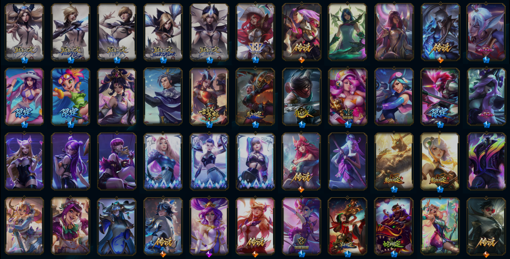 【传说皮肤】源计划超体莫德凯撒 心之钢凯隐 神龙尊者圣龙李青 神龙尊者夜月幻龙亚索 星之守护者阿狸 战斗学院伊泽瑞尔 暗星尊烬 神王德莱厄斯 恶魔男爵瑞兹 女警狙击凯特琳 光明哨兵格雷福斯 青花瓷伊泽瑞尔 源计划泯灭雷克顿 星之守护者霞 光明哨兵薇恩 约德尔国队长提莫 灵魂莲华阿狸 女帝卡特琳娜 暗星女王拉克丝 耀星女神拉克丝 天煞劫 霸天零式赛恩 日蚀骑士蕾欧娜 恶魔之刃泰达米尔 神拳李青 宇航员诺提勒斯 源计划毁灭派克 奥德赛凯隐 月蚀骑士蕾欧娜 西部魔影卢锡安 红色男爵库奇 霸天异形卡兹克 合金巨兽努努和威朗普 上古战魂魔腾 屠龙勇士潘森 苍穹之光韦鲁斯 钢铁军团盖伦 律政大亨蒙多 苹果机器人布里茨 源计划林易 钢铁之翼凯尔 金牌主播德莱文 陆地王者4WD布里茨 女皇艾希 源计划净化薇恩 黑夜使者亚索 蔷薇绅士杰斯 驯龙炮手崔丝塔娜 战地巨兽科加斯 枯萎之壤泽拉斯 焰尾妖狐阿狸 暗星锤石 电玩女神娑娜 绅士科加斯 提莫约德尔人的一大步 符文战熊沃利贝尔 死亡骑士盖伦 第三类接触黑默丁格 黎明使者锐雯 未来战士凯特琳 地狱之门卫士加里奥 血石领主弗拉基米尔 黯晶凤凰艾尼维亚 女校长菲奥娜 冰川巨兽墨菲特 灌篮高手德莱厄斯 冰霜亚龙希瓦娜 冰霜之刃艾瑞莉娅 大天使长米迦勒凯尔 双重冰晶艾尼维亚 星之守护者金克丝 鬼魂新娘莫甘娜 战场女武神凯尔 源计划联合艾希 银河魔装机神兰博 欧米伽小队幽灵特工 泳池派对吉格斯 最终BOSS维迦 腥红之月鬼武姬阿卡丽 邪鸦魅影乐芙兰 铁哥们儿奥拉夫 女主播迦娜 丧尸布兰德 烈焰雄心崔丝塔娜 黯黑魔龙希瓦娜 星之守护者拉克丝 偶像歌手阿狸 魔幻卡牌崔斯特