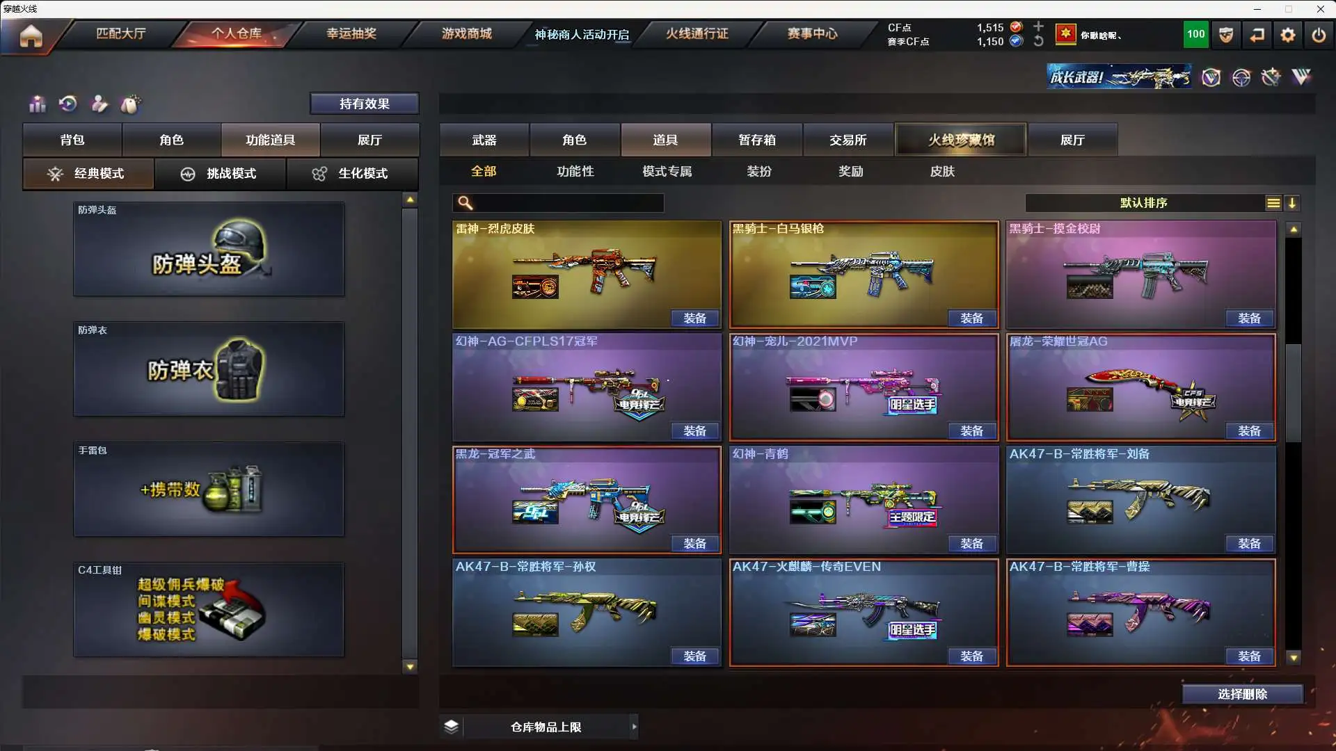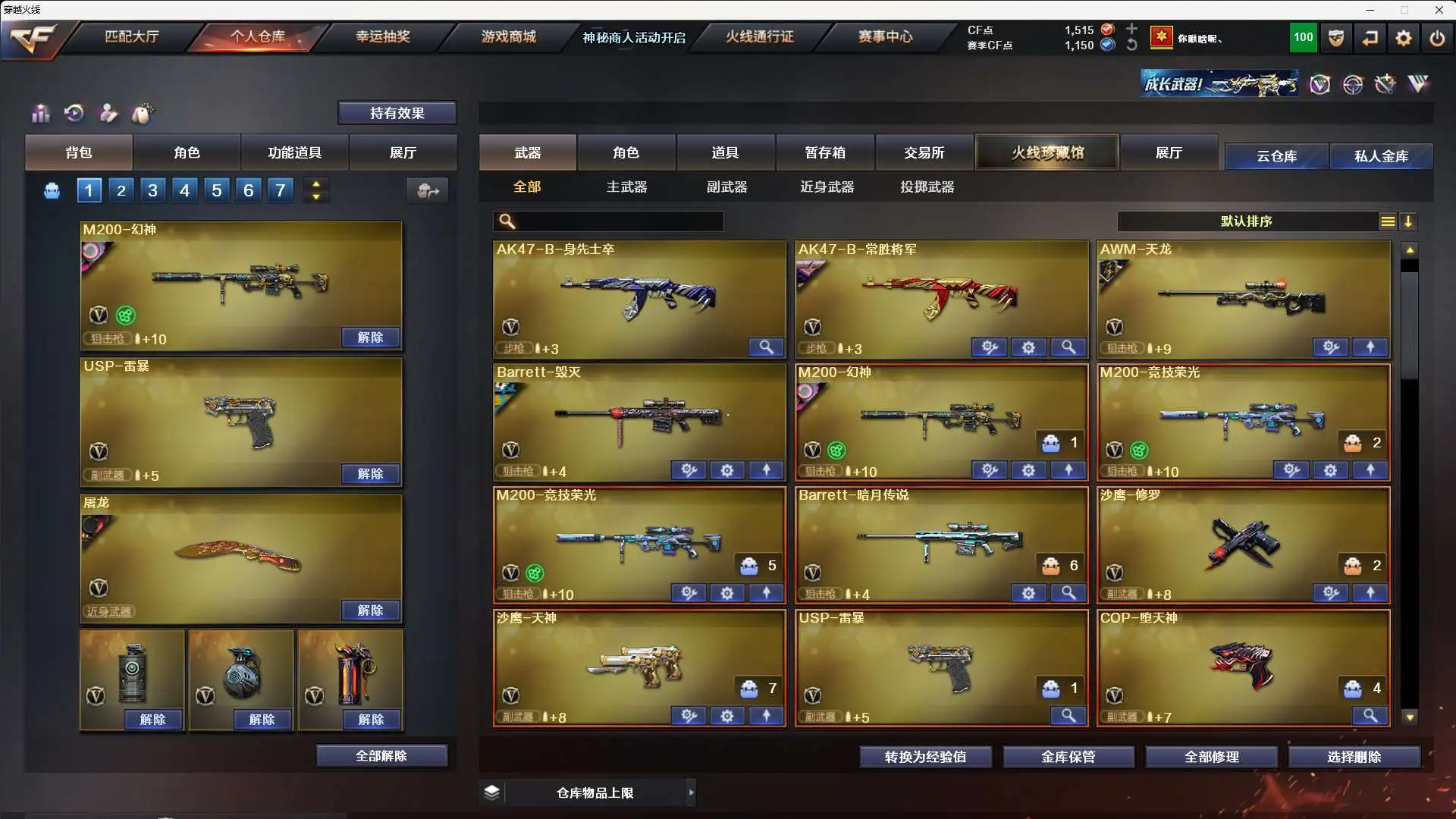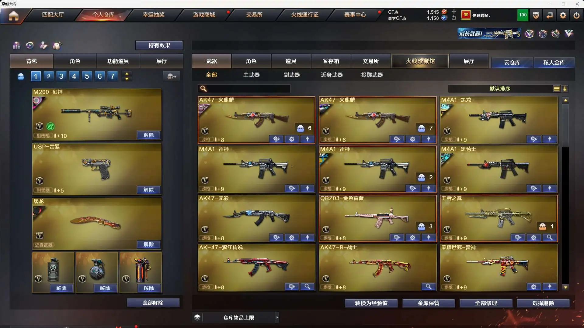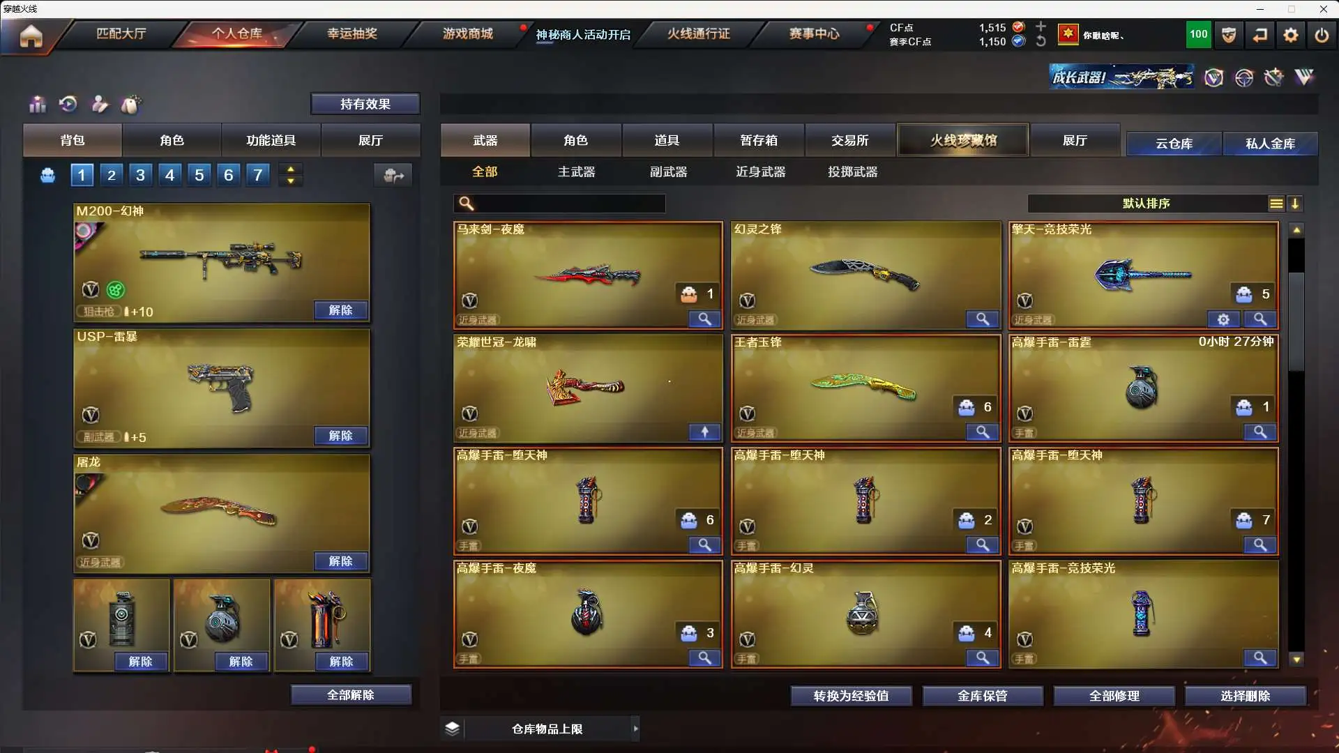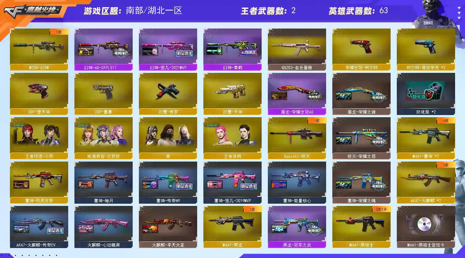 【m200-幻神 幻神-宠儿-2021mvp 幻神-青鹤 幻神-ag-cfpls17冠军】➕【m200-竞技荣光套装*2 (四防)电竞教官-云悠悠】➕【qbz03-金色蔷薇】➕【荣耀世冠-雷神套装】➕【usp-雷暴 柯尔特-竞技荣光*2 荣耀世冠-柯尔特】➕【王者之戮 王者玉锋】➕【炫金雷神 炫金骑士】➕【角色:(四防)王者玲珑-小乔 (四防)王者涂鸦 葵】➕【黑骑士音效卡】➕【皮肤:黑骑士-白马银呛 雷神-烈虎 屠龙-荣耀世冠ag 黑龙-冠军之武 火麒麟-传奇even 雷神-宠儿 雷神-传奇n9 雷神-荣耀之魄 毁灭-荣耀之怒 屠龙-荣耀之锋 龙啸-冠军之啸 天龙-传奇70kg】➕【火麒麟 黑龙 雷神 黑骑士 无影 猩红传说 战士 身先士卒 常胜将军 天龙 毁灭 暗月传说】➕【7副武器 15近身武器】➕【堕天神投掷武器套装*3 夜魔投掷武器套装*1 幻灵投掷武器套装*1 竞技荣光投掷武器套装*2】➕夺命之镰 防化服 c4工具钳 手雷包