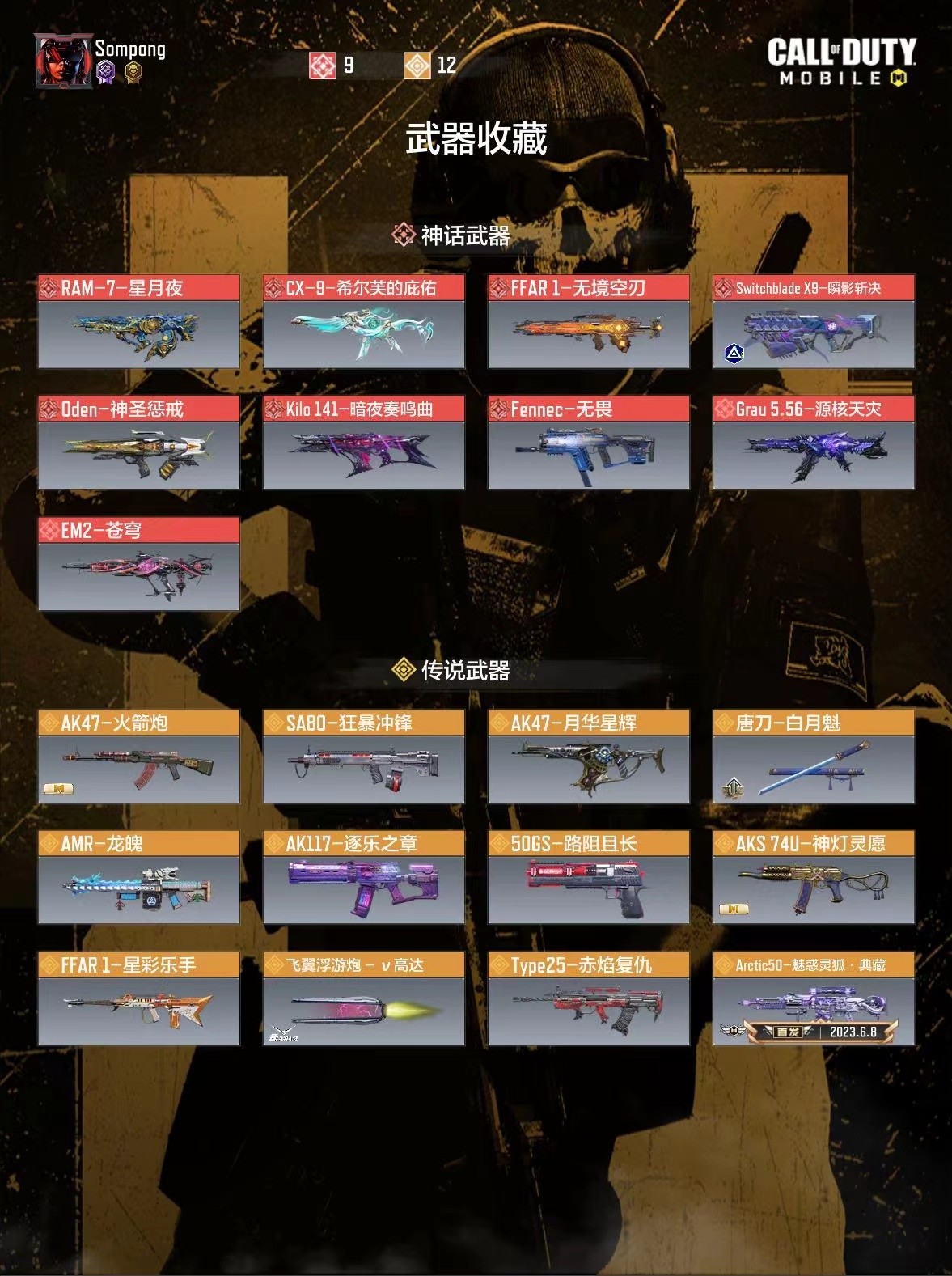 9神话,1典藏,12传说,1传说角色,0den-神圣惩戒,FFAR 1-无境空刃,Kilo 141-暗夜奏鸣曲,Fennec-无畏,CX-9-希尔笑的庇佑,SwitchbladeXg-瞬影斩决,RAM-7-星月夜(满阶),EM2-苍穹,Grau 5.56-源核天灾,AK117-逐乐之章,AK47-月华星辉,Arctic50-魅惑灵狐·典藏,50GS-路阻且长,唐刀-白月魁,Type25-赤焰复仇,SA80-狂暴冲锋,飞翼浮游炮- v高达,AK47-火箭炮,FFAR 1-星彩乐手,