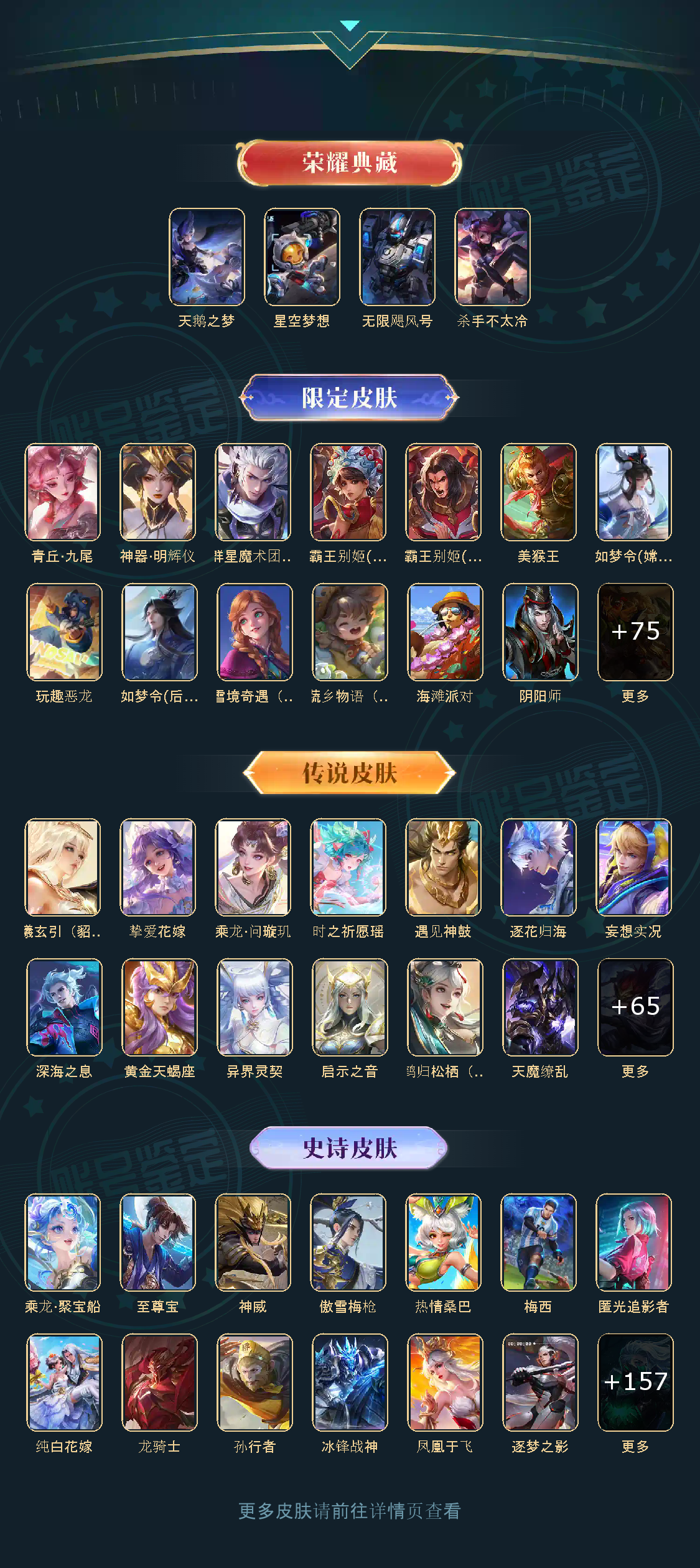 贵族等级V10,英雄数量127,典藏皮肤数4,皮肤数量524,冰锋战神街头霸王天鹅之梦纯白花嫁天魔缭乱至尊宝杀手不太冷凤求凰热情桑巴逐梦之影武陵仙君神奇女侠星空梦想梅西无限飓风号黄金狮子座一生所爱大圣娶亲冰霜恋舞曲青龙志白虎志朱雀志太华久胜战神飞衡梁祝白鹤梁神女匿光追影者遇见胡旋龙胆李逍遥武圣奔雷神使孙行者玉兔公主补天异界灵契神威启示之音傲雪梅枪淬星耀世时雨天司