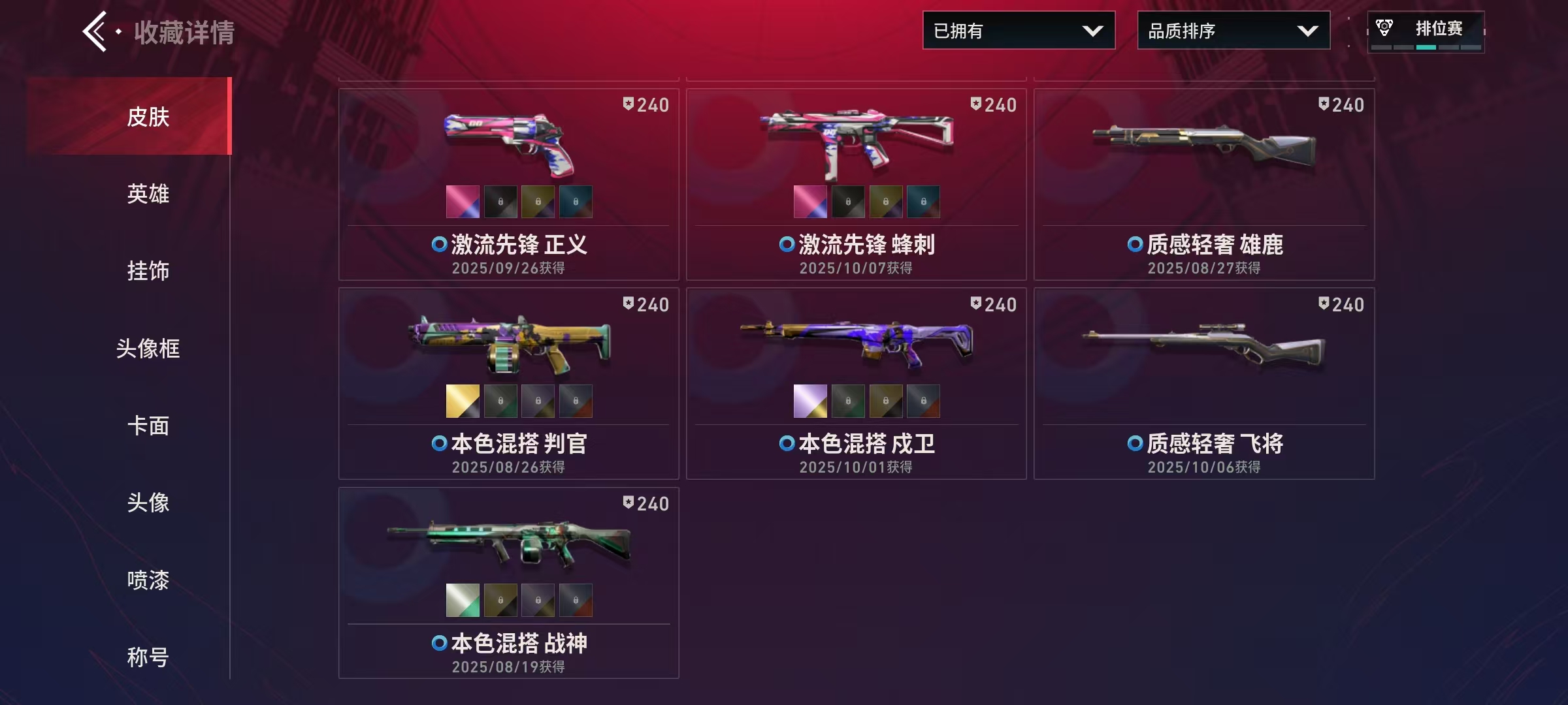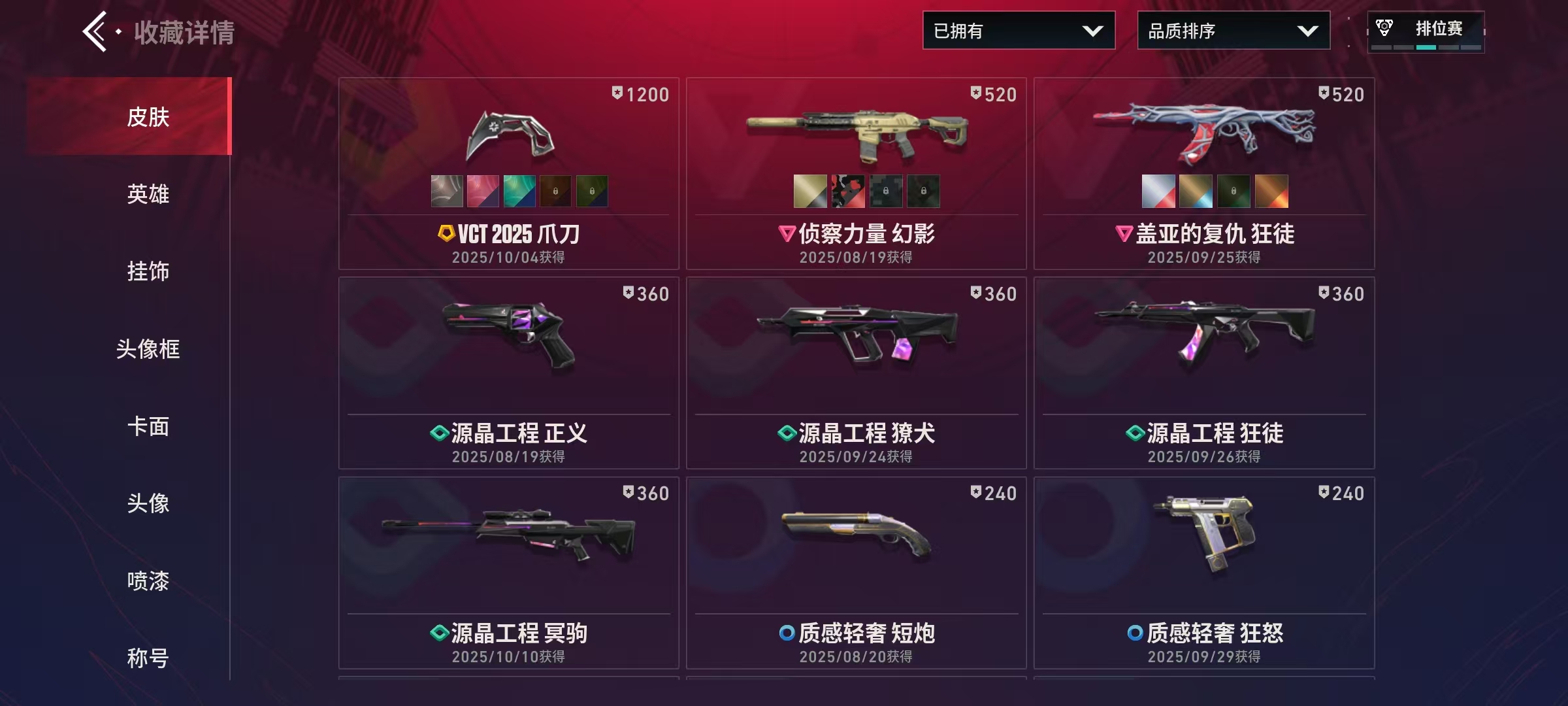 【全平台】 VCT爪刀 侦察力量 幻影 盖亚的复仇 狂徒 都已满阶 20级收藏家