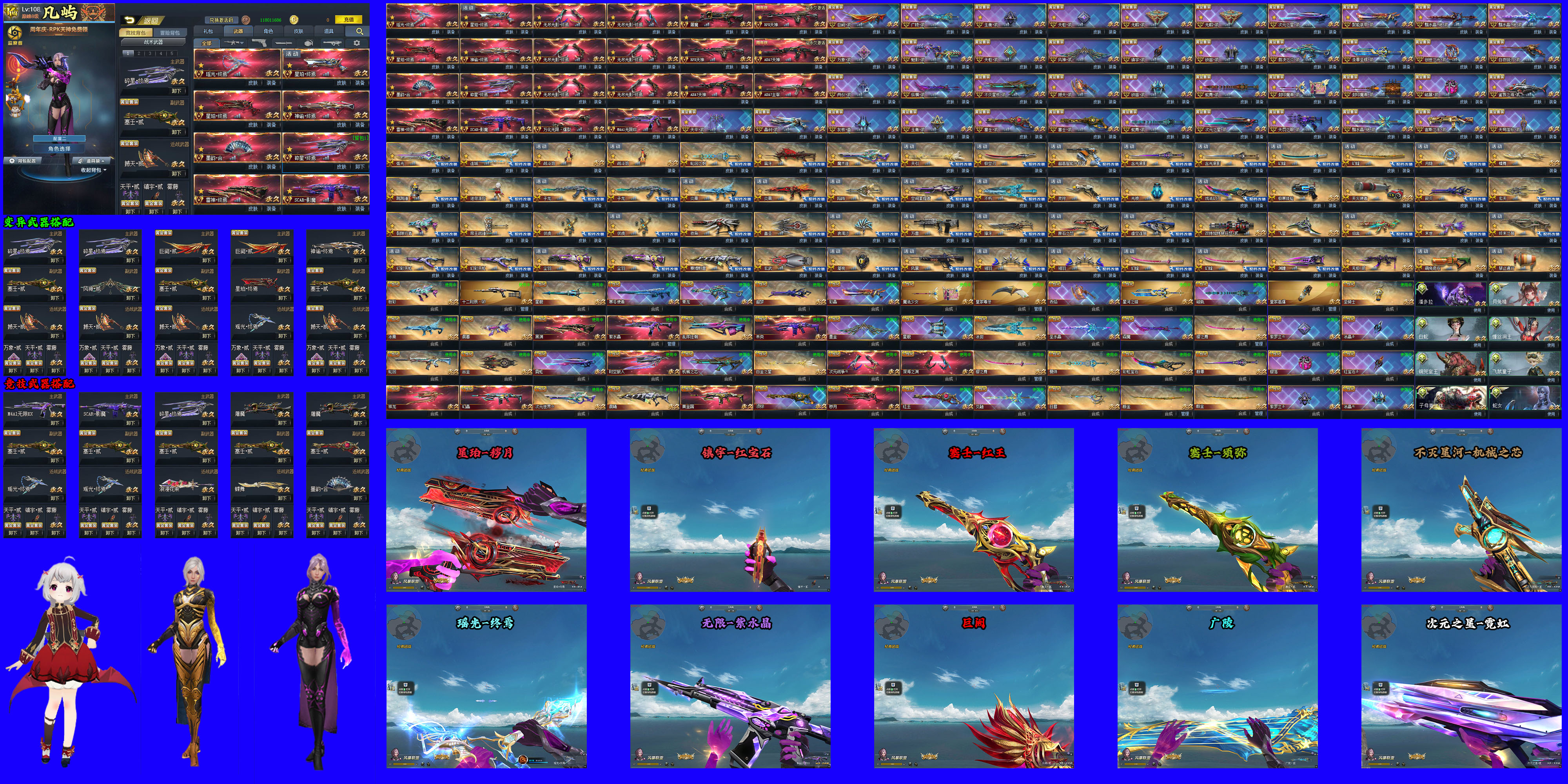 传说级武器:瑶光终焉⭐星珀终焉x2⭐神谕终焉⭐墨韵合⭐碎星终焉⭐雷神终焉⭐SCAR影魔⭐M4A1无限EX⭐屠魔⭐无尽光影x6⭐RPK天神x2⭐AK47天神x2⭐AK47主宰⭐万化无限爆裂