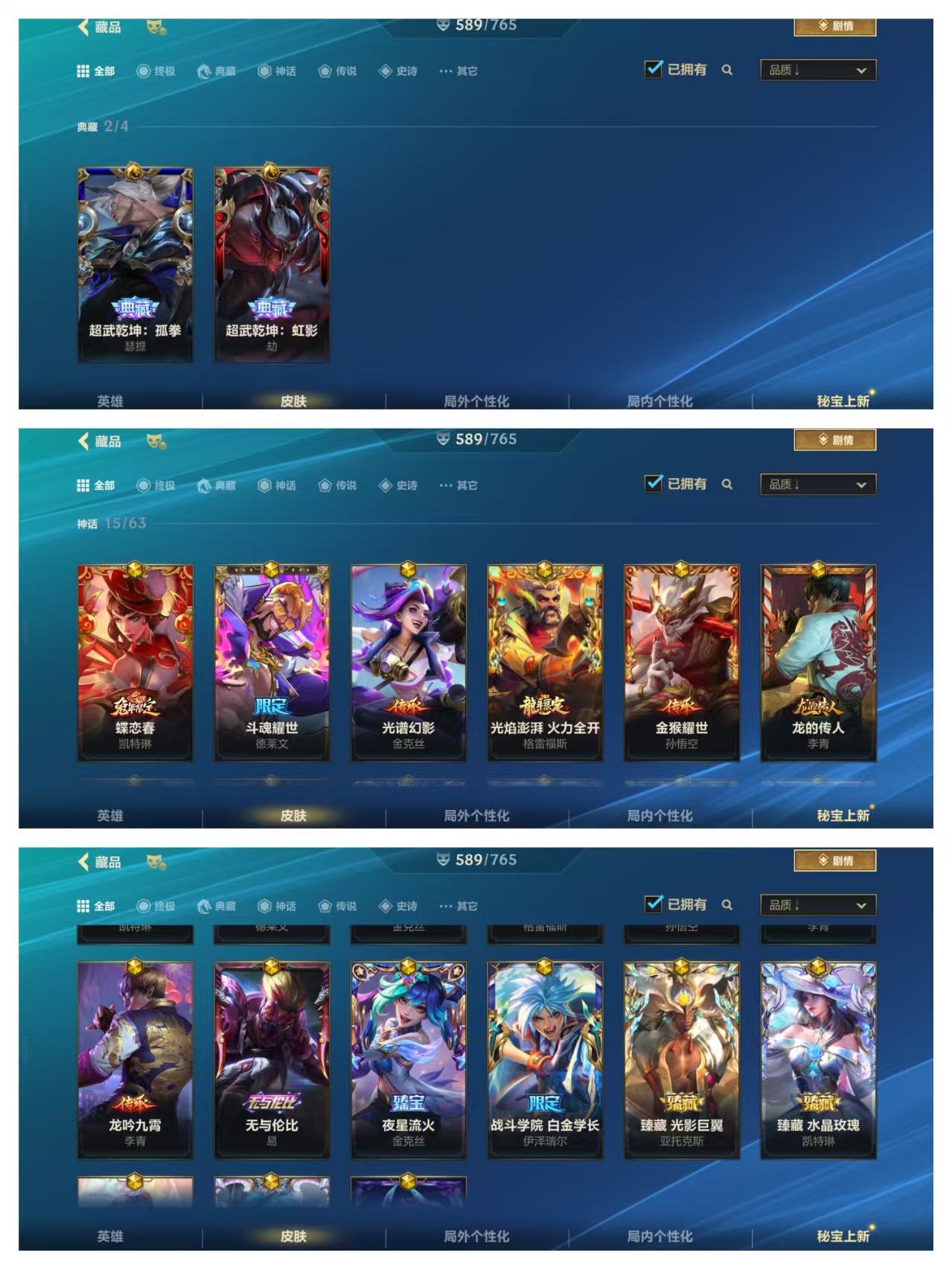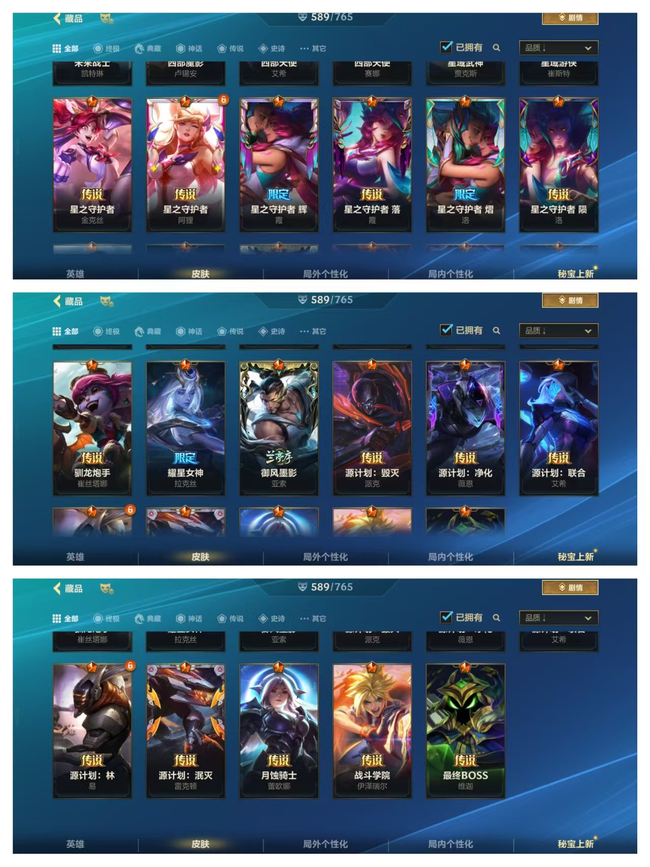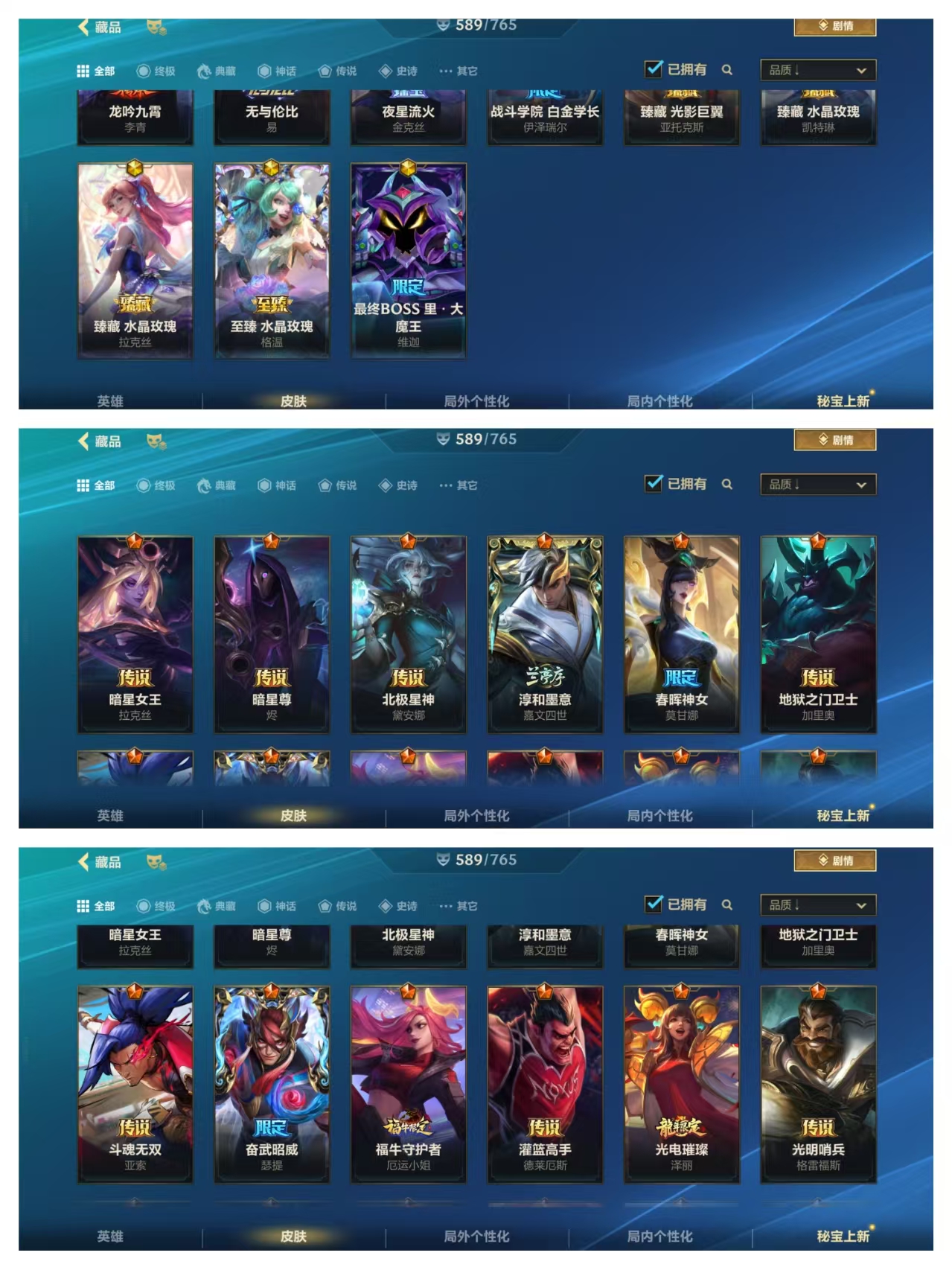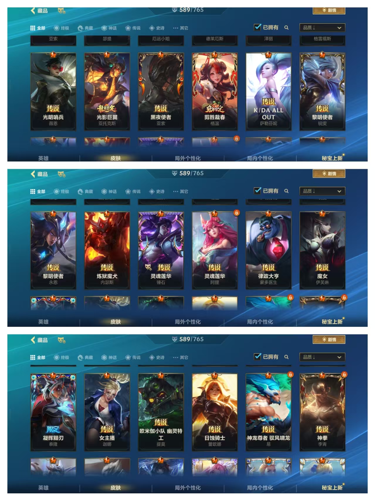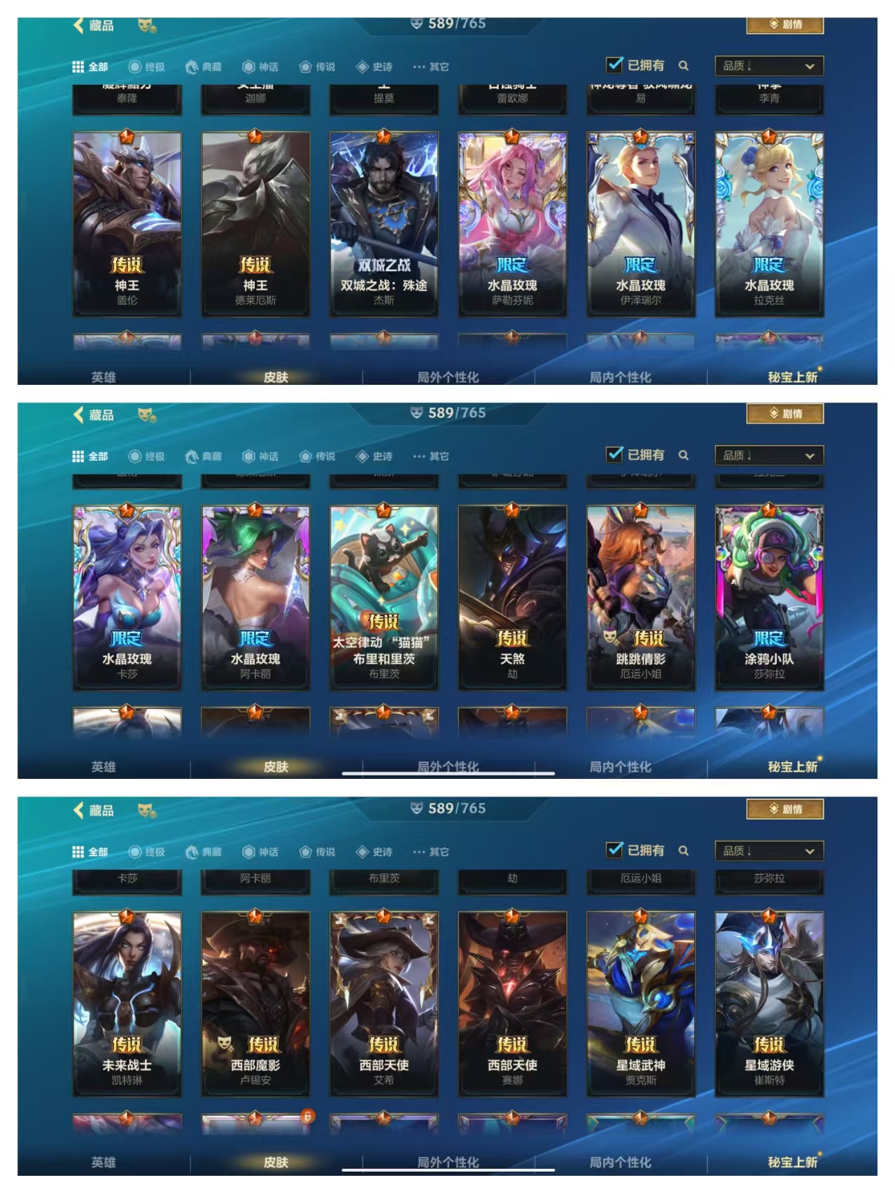 【安卓】 【允许排位】【魂】589皮钻五可排✨超武乾坤腕豪✅劫✅黑龙回城✨臻藏水晶玫瑰女警✨臻藏娜美格温等丨挂机拉黑